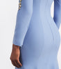 فستان أنيق بتصميم حورية البحر، يتميز بتفاصيل مكشوفة الكتفين، وأكمام طويلة ورفيعة، وتطريز ذهبي مزخرف على طول خط العنق والذراعين. قطعة خالدة.
