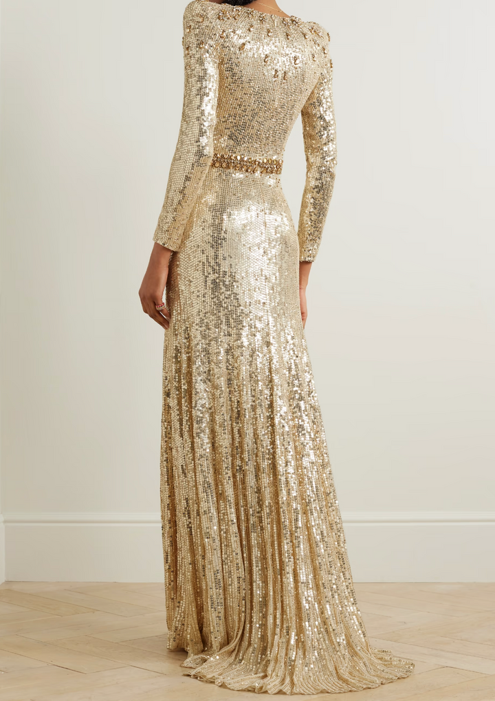 فستانٌ رائعٌ بتصميم عمودي بأكمام طويلة. مصنوعٌ من قماشٍ مُرصّعٍ بالترتر يتلألأ في الضوء، يتميز هذا الفستان بتفاصيل دقيقة عند الكتفين والخصر لإطلالةٍ أنيقة. قصّته الأنيقة والضيقة تضمن لكِ إبراز منحنيات جسمكِ. يجمع هذا الفستان بين الأناقة والرقي في قطعةٍ واحدةٍ لا تُنسى.