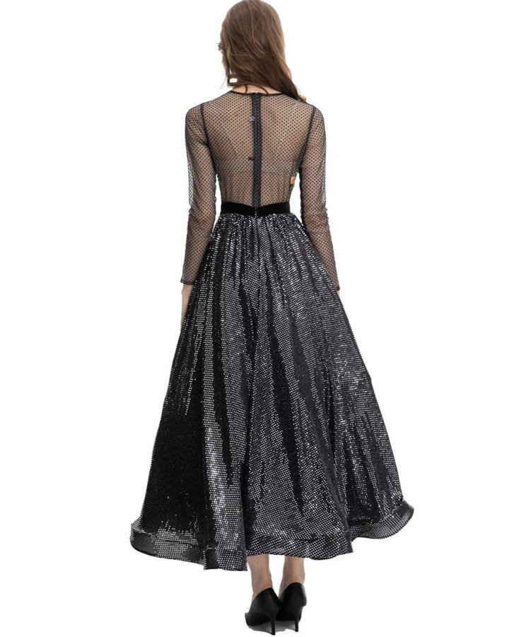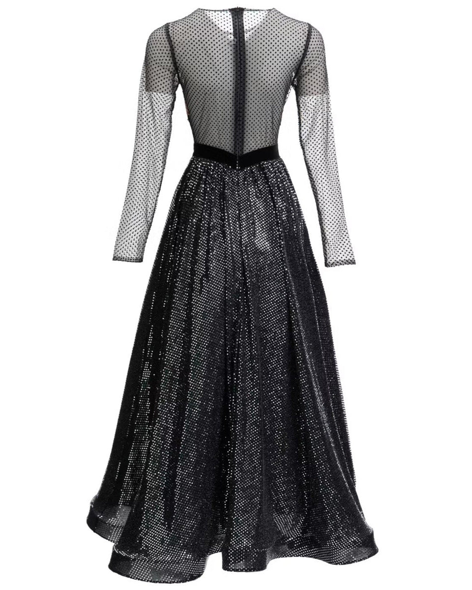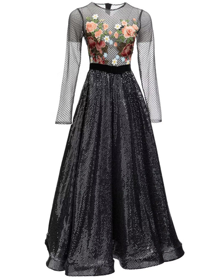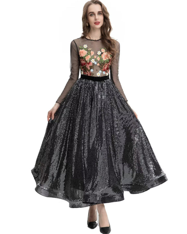 فستان شبكي مع تطريز زهري وتنورة من الترتر - ليلي