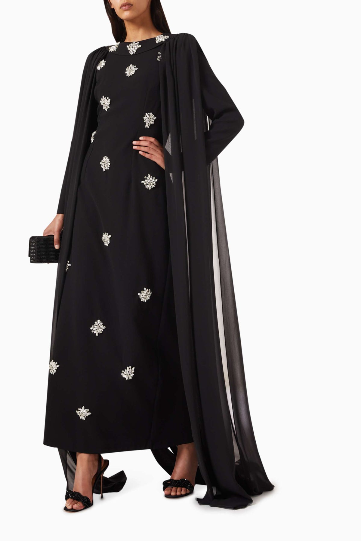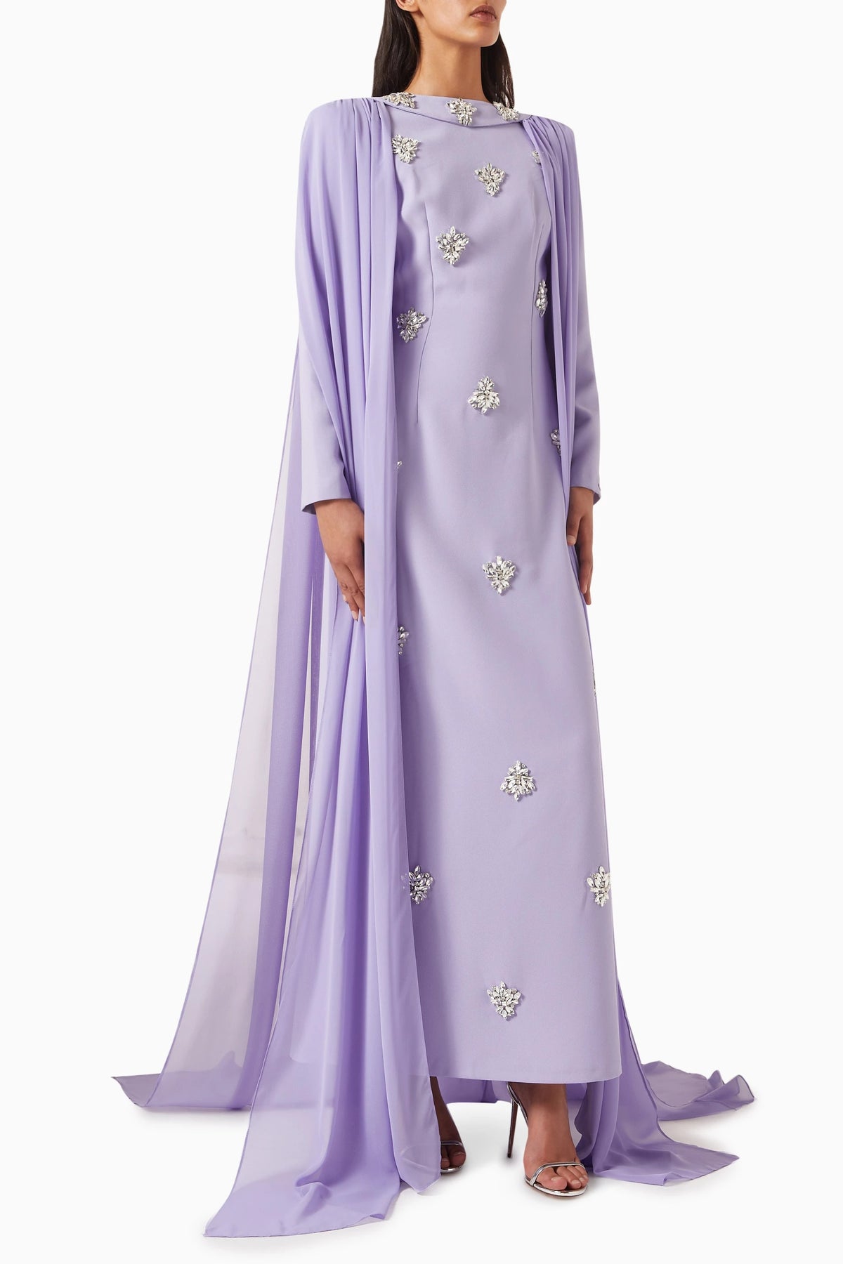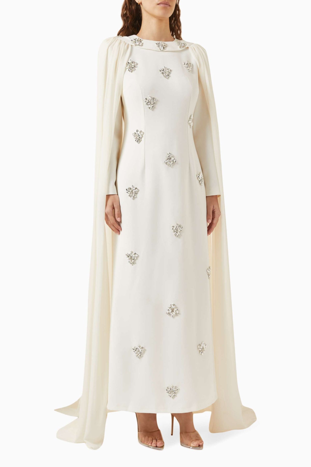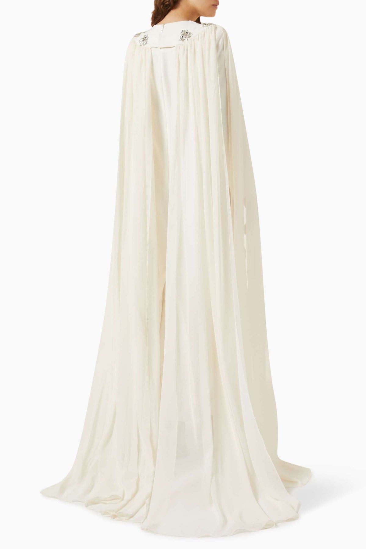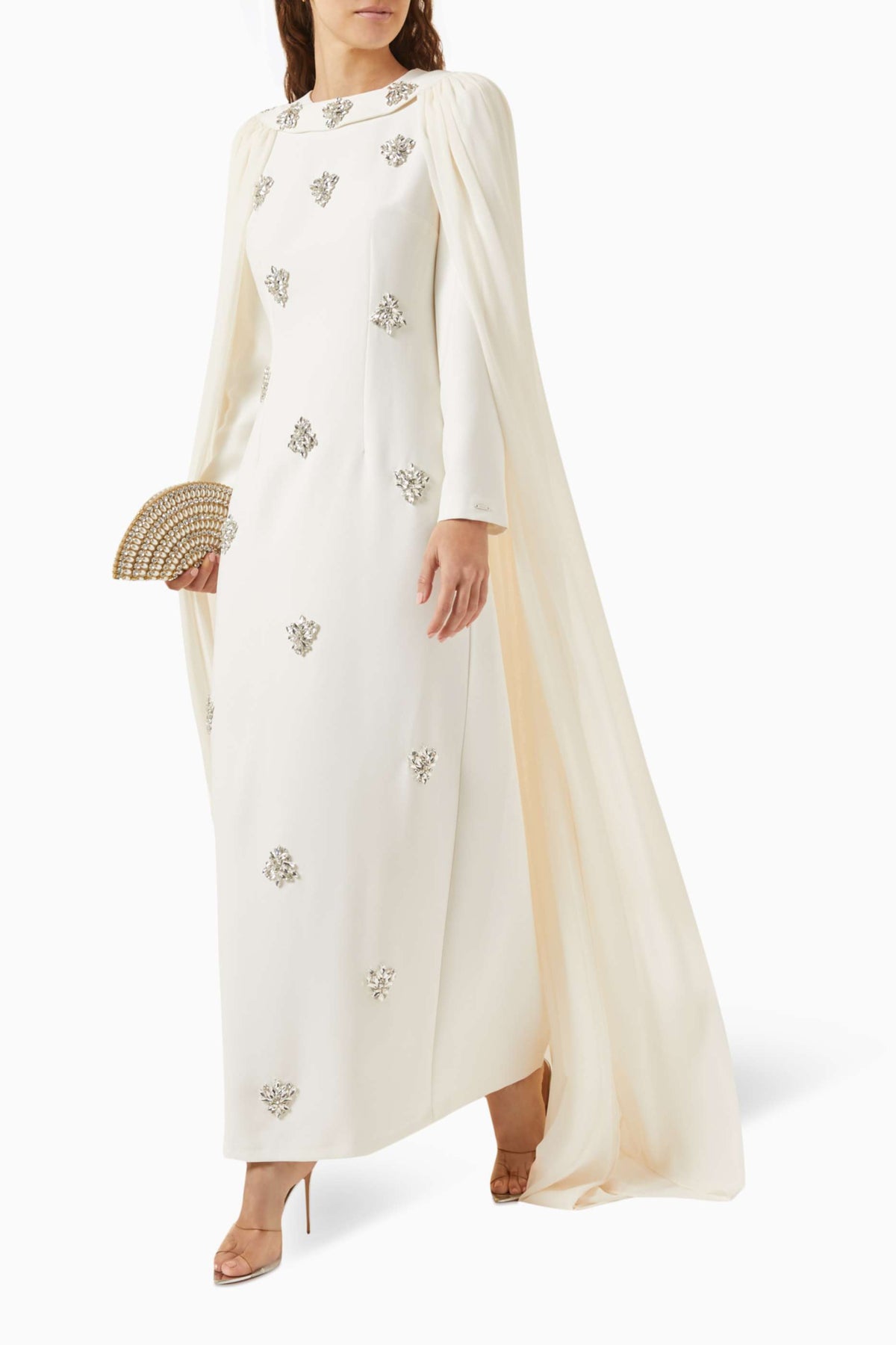فستان عاجي ساحر مزين بكريستالات متناثرة وعباءة أنيقة متصلة به. تصميمه المنظم وتفاصيله المرصعة بالجواهر تمنحه إطلالة ملكية متألقة، مثالية للمناسبات المسائية الراقية.