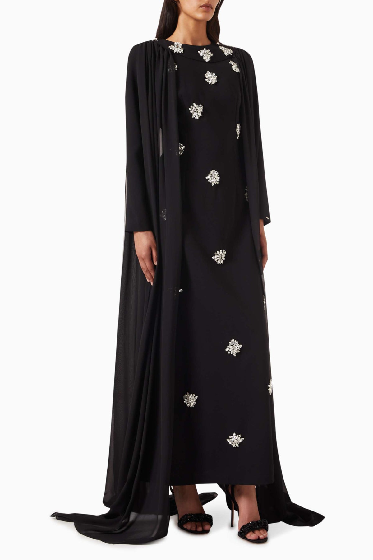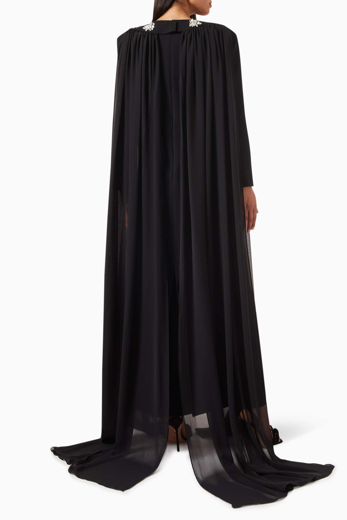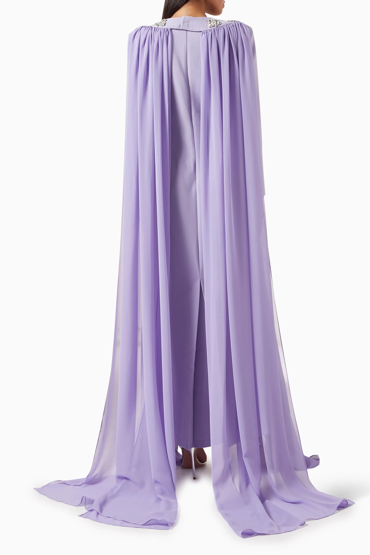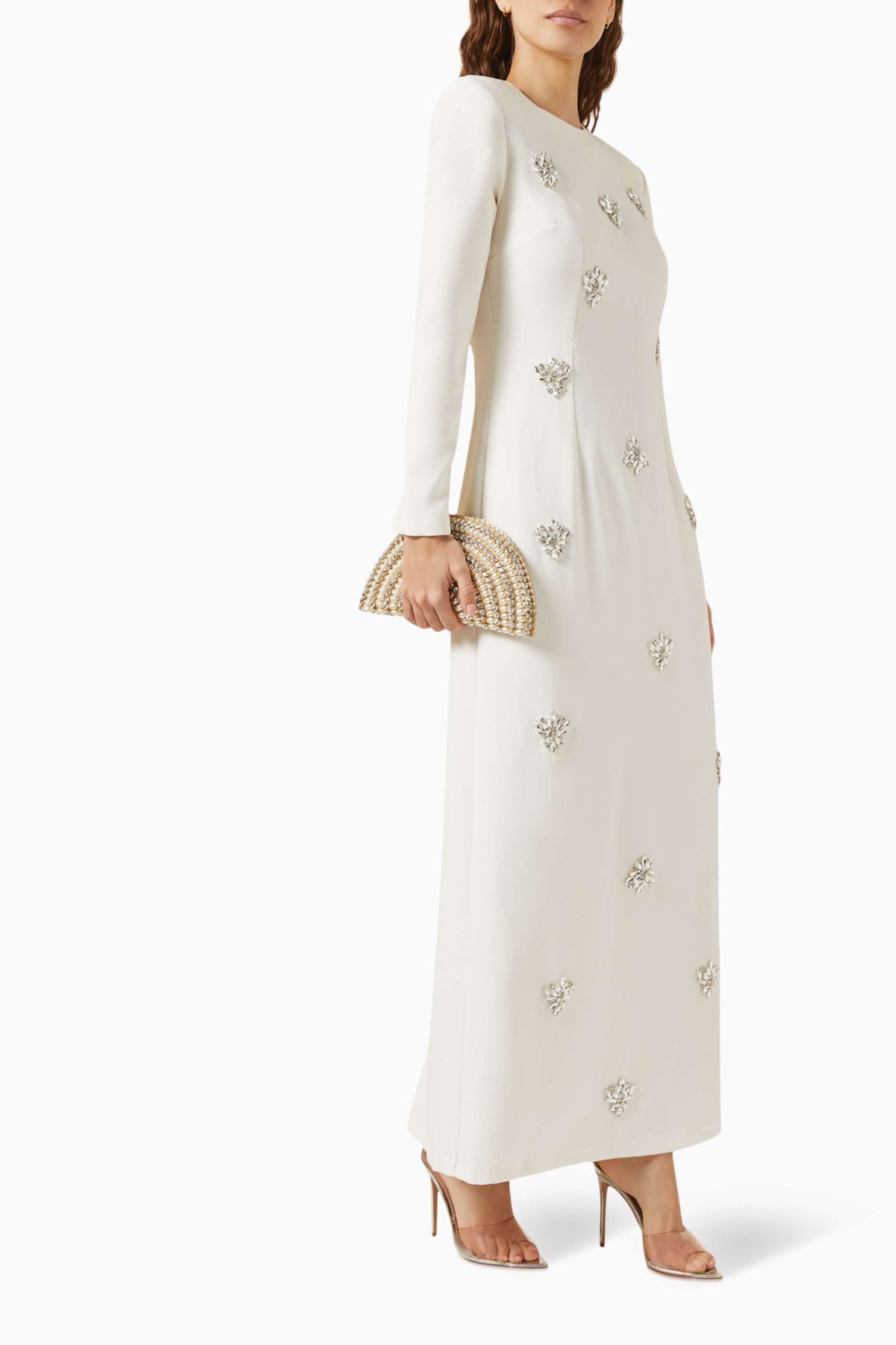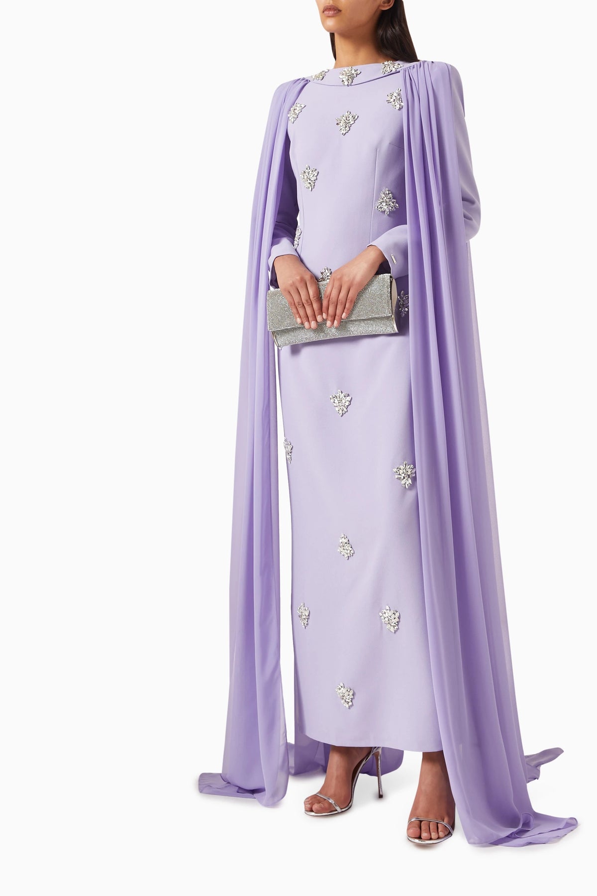 فستان عاجي ساحر مزين بكريستالات متناثرة وعباءة أنيقة متصلة به. تصميمه المنظم وتفاصيله المرصعة بالجواهر تمنحه إطلالة ملكية متألقة، مثالية للمناسبات المسائية الراقية.