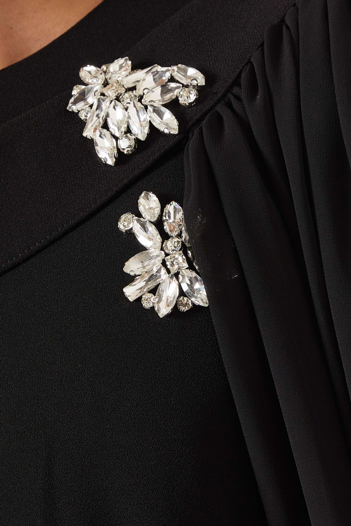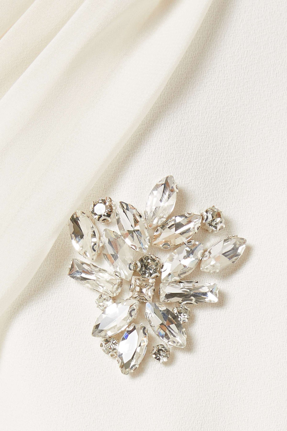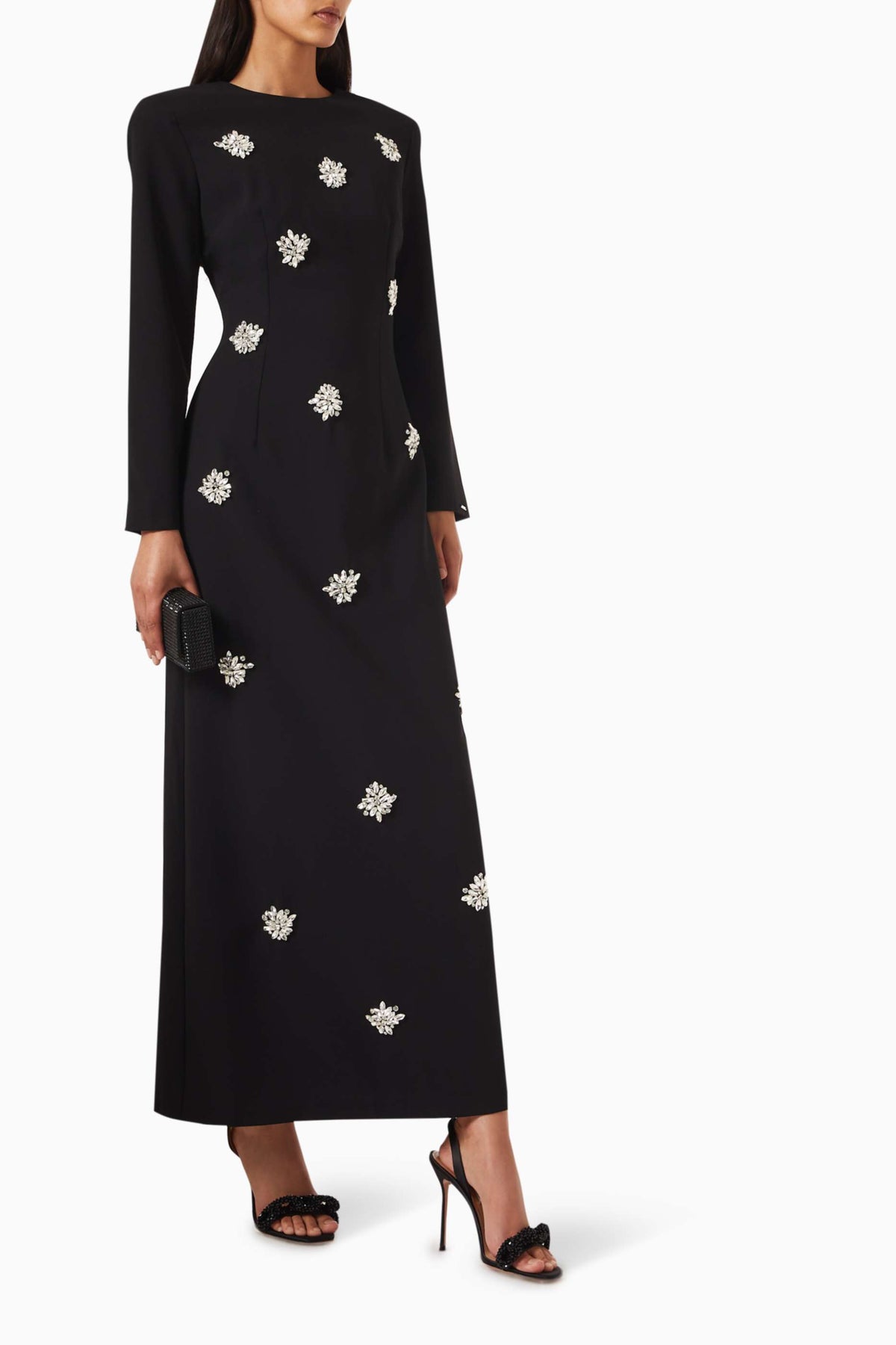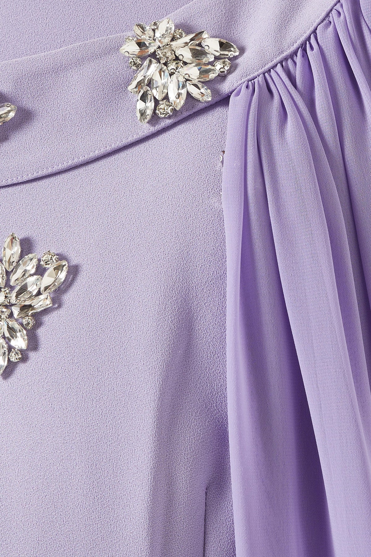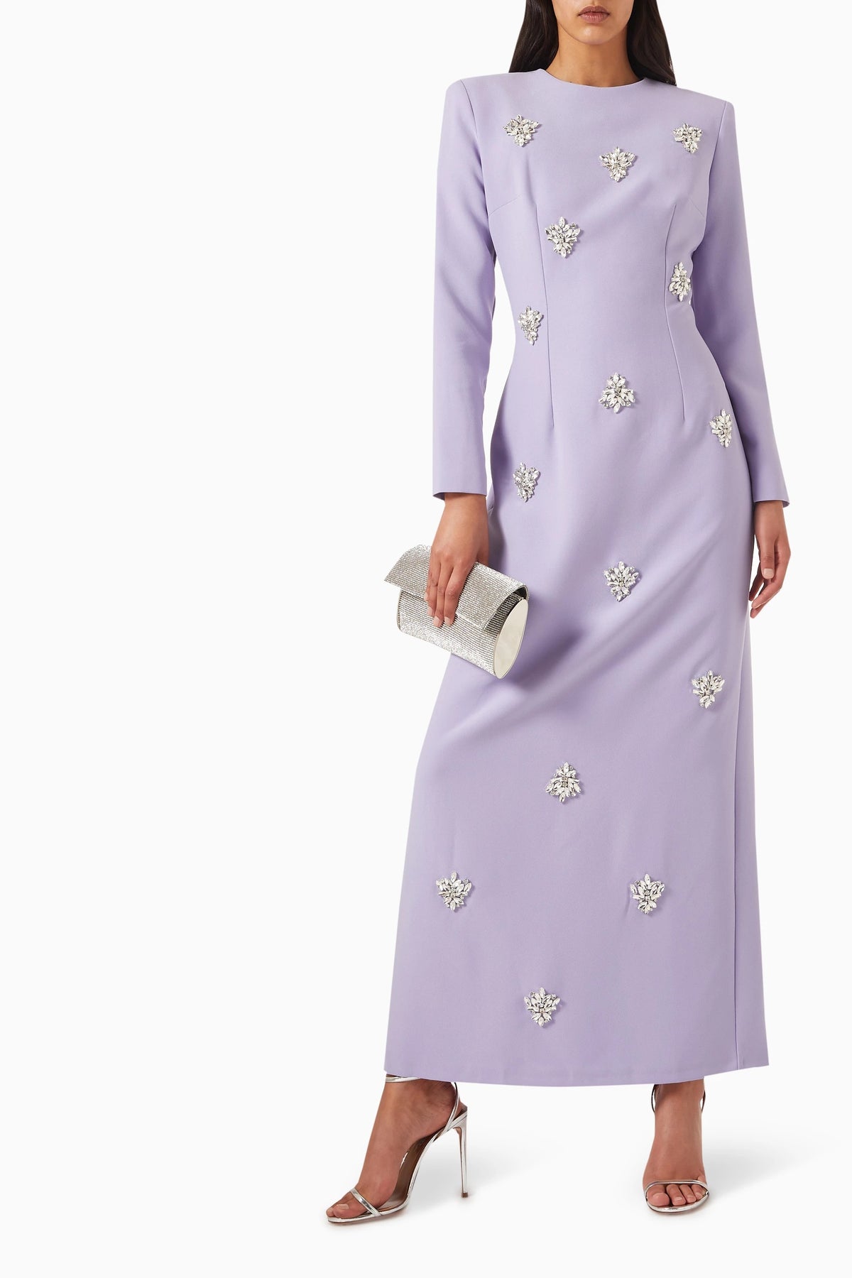 فستان عاجي ساحر مزين بكريستالات متناثرة وعباءة أنيقة متصلة به. تصميمه المنظم وتفاصيله المرصعة بالجواهر تمنحه إطلالة ملكية متألقة، مثالية للمناسبات المسائية الراقية.