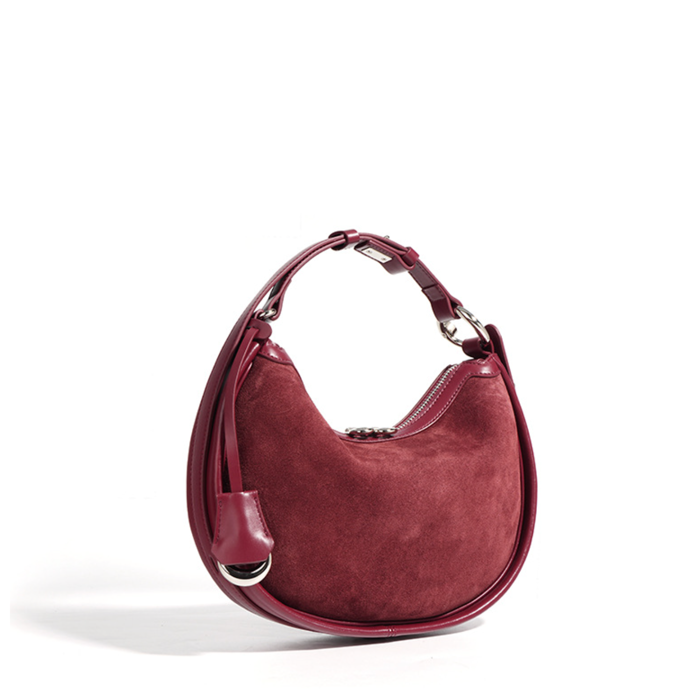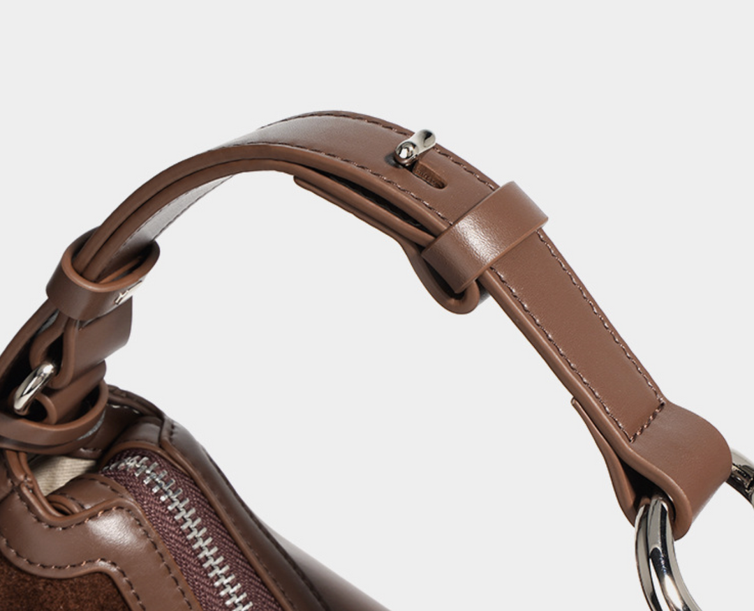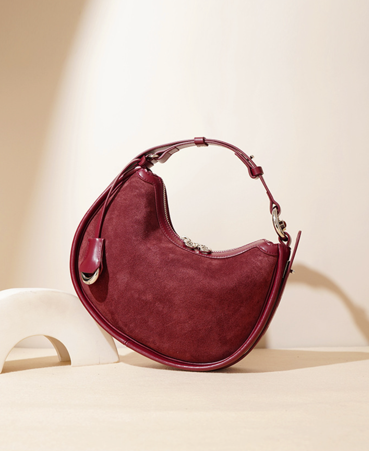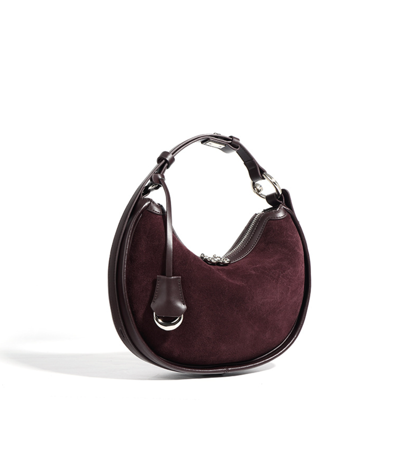 حقيبة كتف أنيقة على شكل هلال، مصنوعة من جلد سويدي بني غامق مع حواف جلدية ناعمة. تتميز بتصميم أنيق، وأجزاء معدنية فضية اللون، ومقبض علوي قابل للتعديل لإطلالة متنوعة.