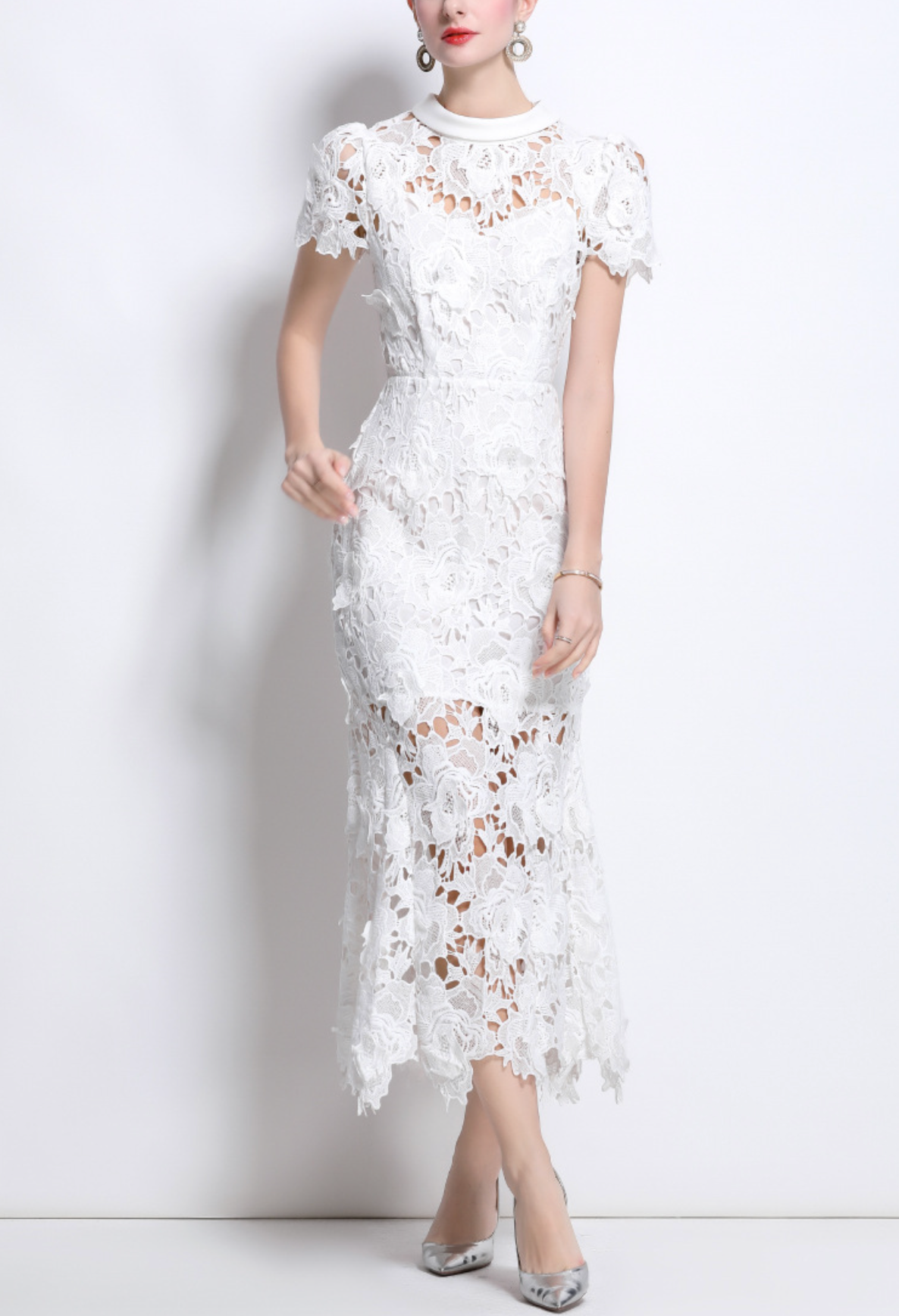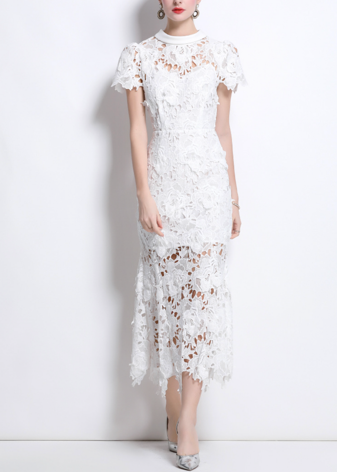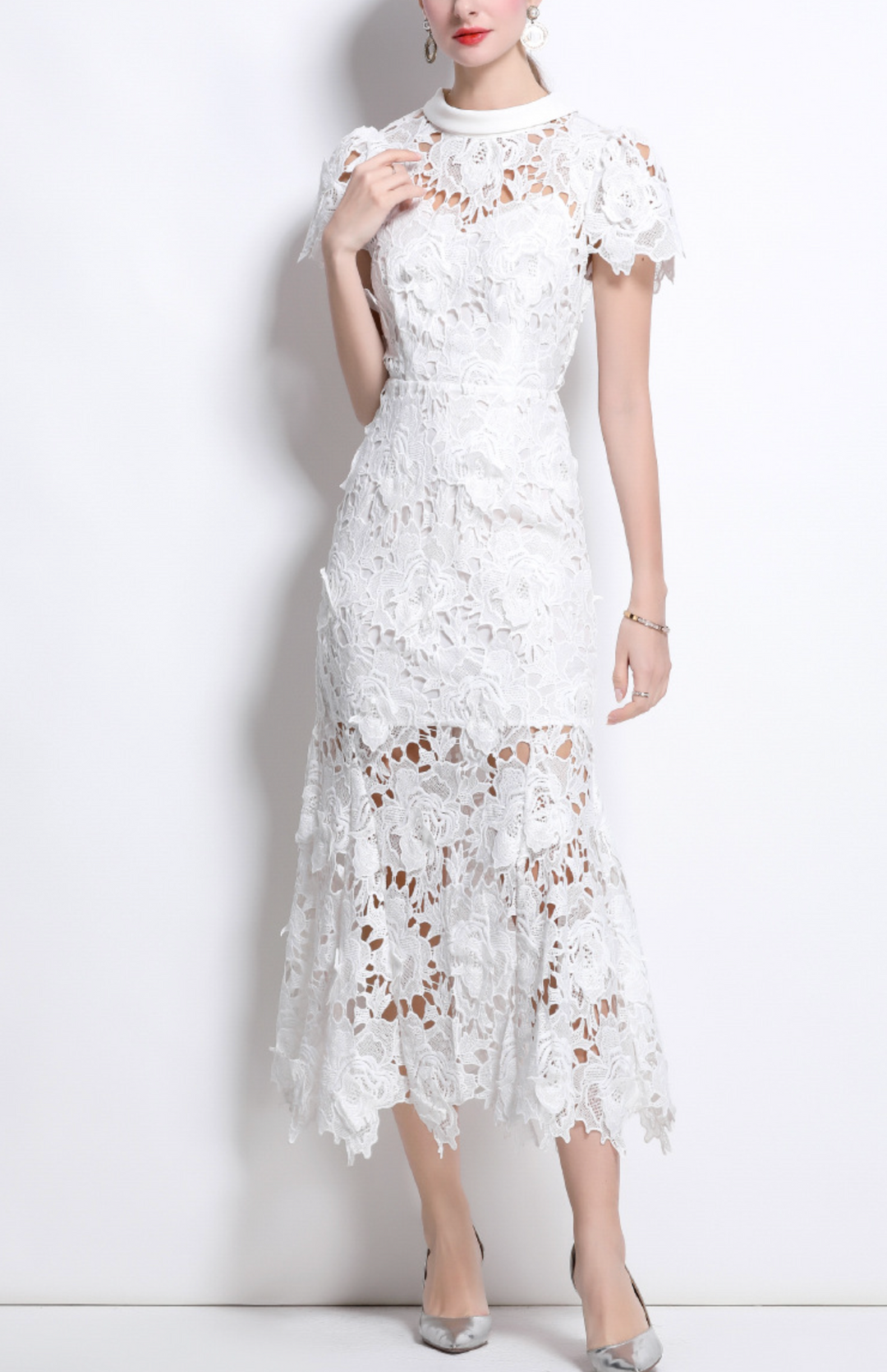 فستان أبيض أنيق من الدانتيل متوسط الطول، يتميز بتطريز زهري متقن، وحاشية شبه شفافة، وأكمام ناعمة على شكل كاب. ياقة عالية وتصميم أنيق يُضفيان توازنًا أنيقًا بين الرومانسية العصرية والأناقة الخالدة.