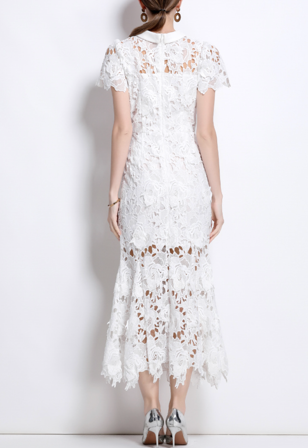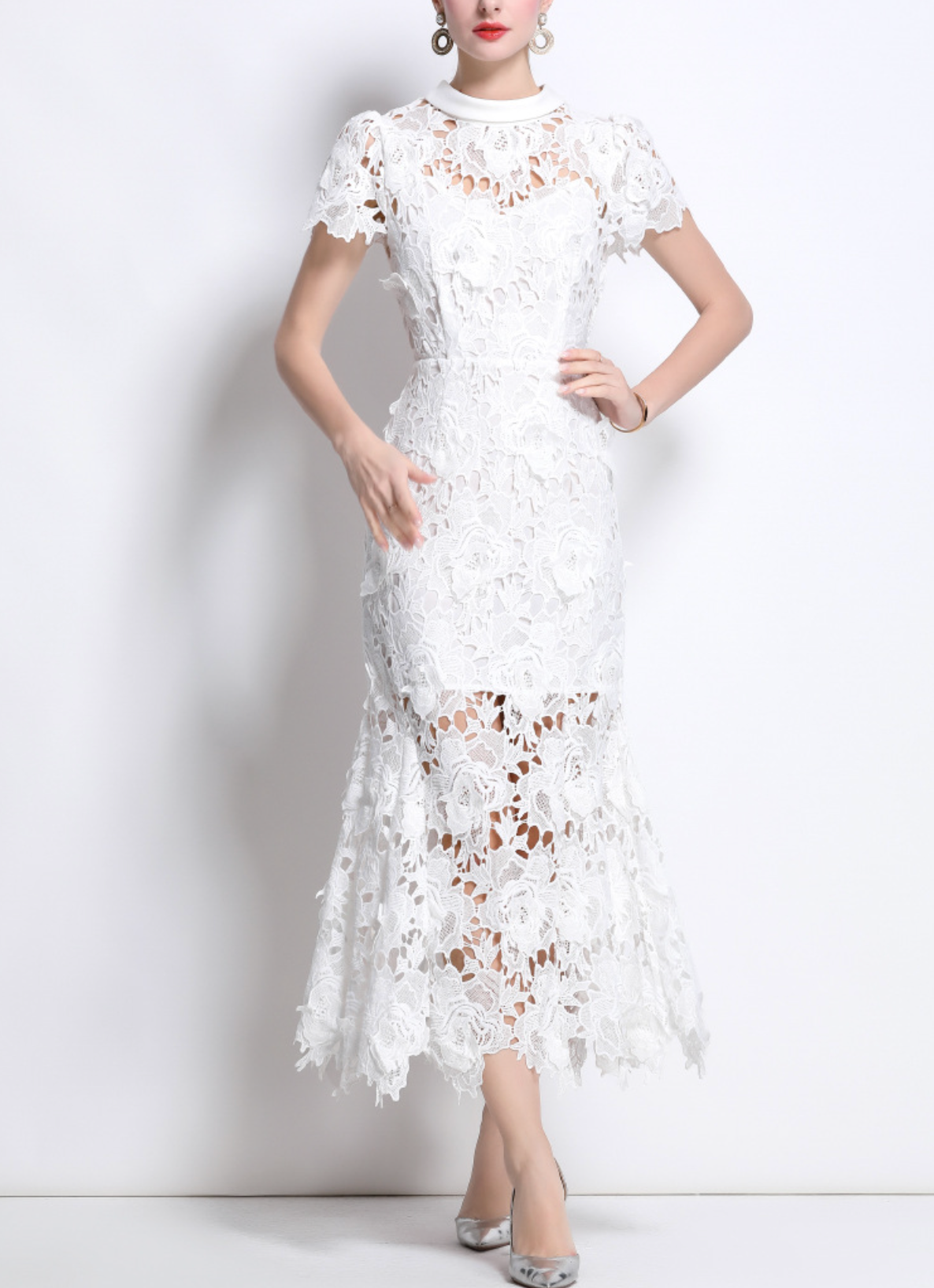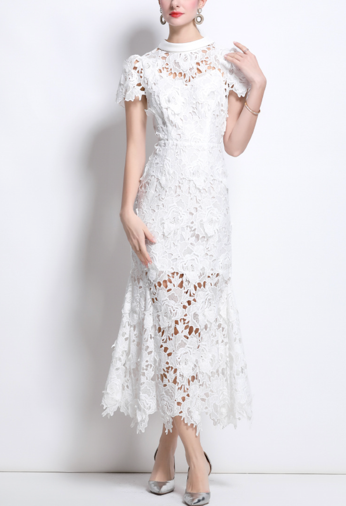 فستان أبيض أنيق من الدانتيل متوسط الطول، يتميز بتطريز زهري متقن، وحاشية شبه شفافة، وأكمام ناعمة على شكل كاب. ياقة عالية وتصميم أنيق يُضفيان توازنًا أنيقًا بين الرومانسية العصرية والأناقة الخالدة.