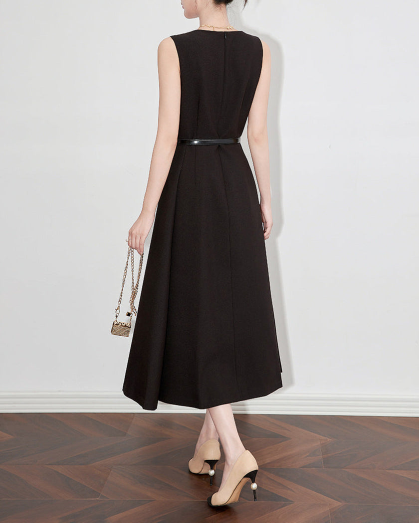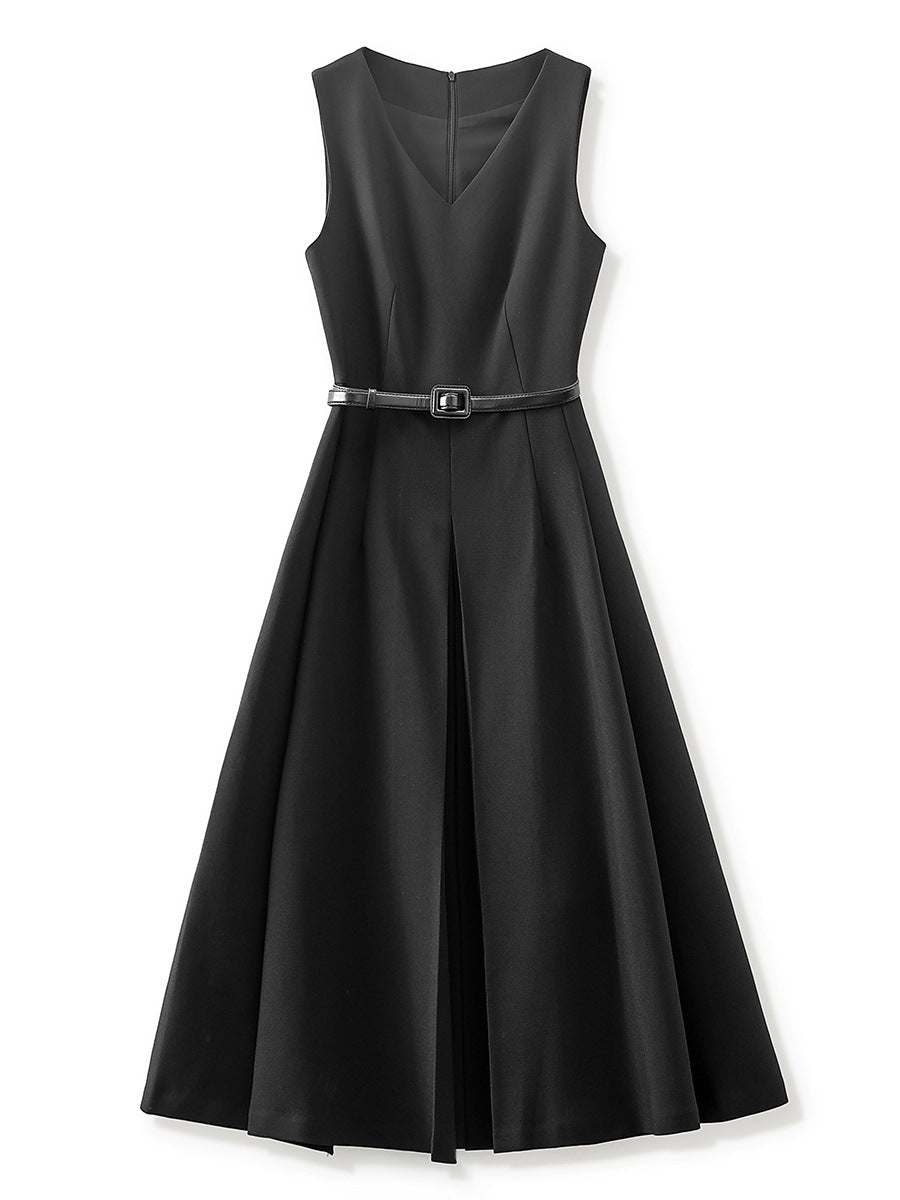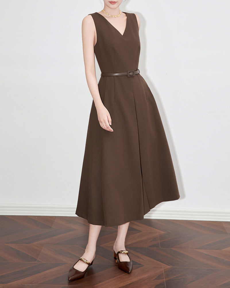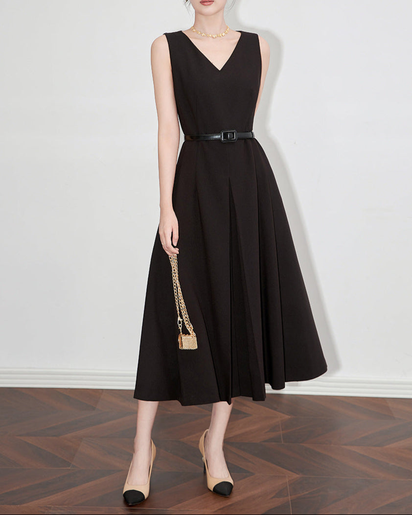 فستان ميدي بدون أكمام، مصمم بأناقة وراحة، يتميز بفتحة رقبة على شكل حرف V كلاسيكية وكسرات أنيقة وخصر مشدود بحزام رفيع لإطلالة جذابة.