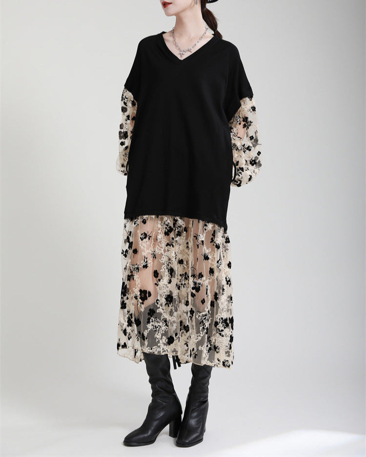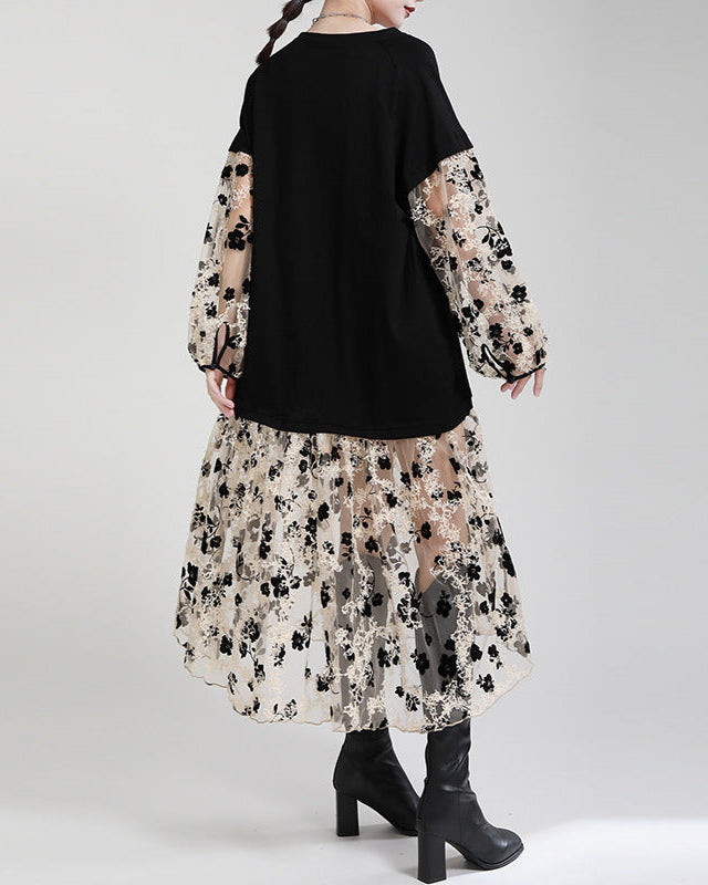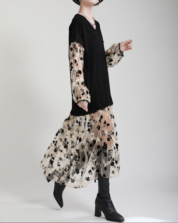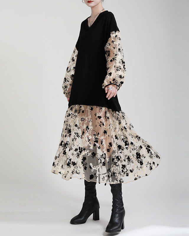 فستان آسر متعدد الاستخدامات، يجمع بين فتحة عنق على شكل حرف V سوداء مريحة وأكمام وتنورة شبكية شفافة مزينة بنقشة زهور. تطريزه المتقن وطبقاته المتعددة يمنحه لمسة رومانسية بلمسة عصرية.