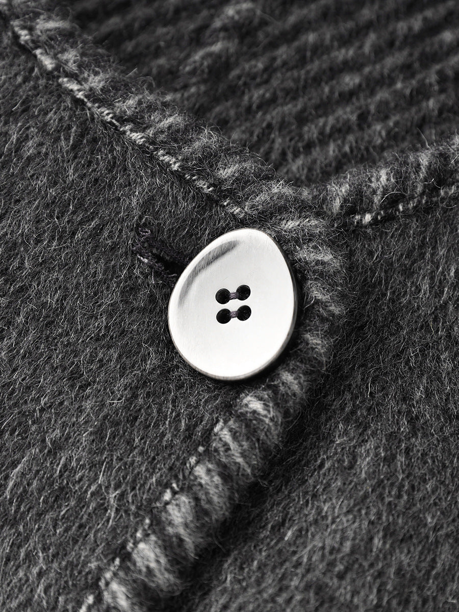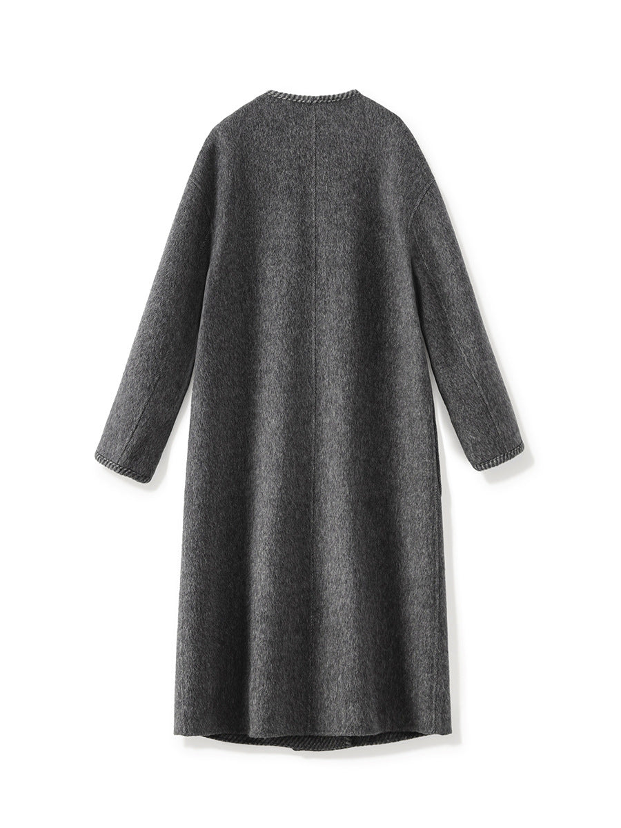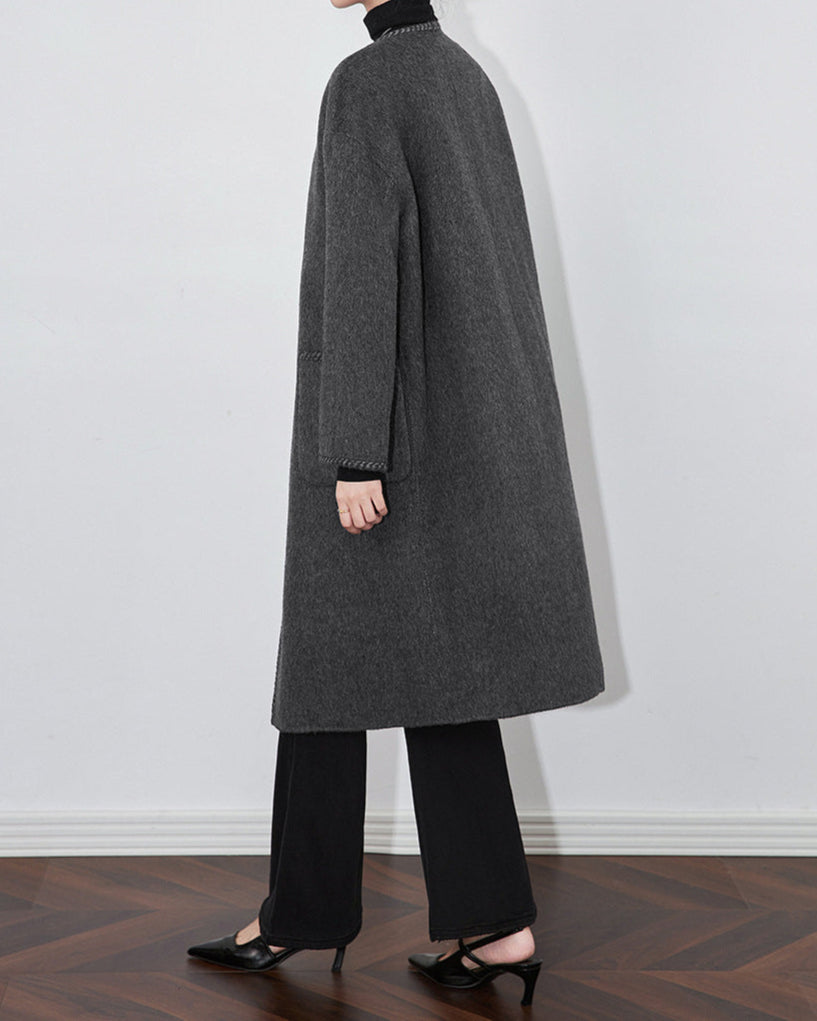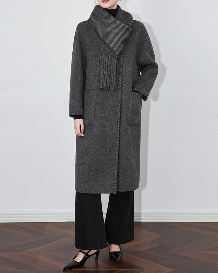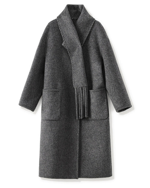معطف أنيق من مزيج الصوف، بياقة وشاح مضلعة مدمجة، وقصة مستقيمة، وجيوب واسعة. لباس خارجي كلاسيكي يجمع بين الدفء والأناقة البسيطة.