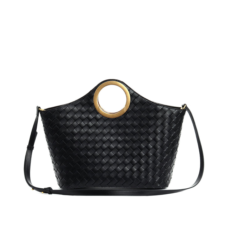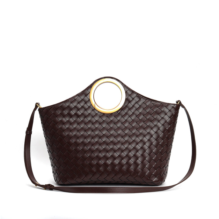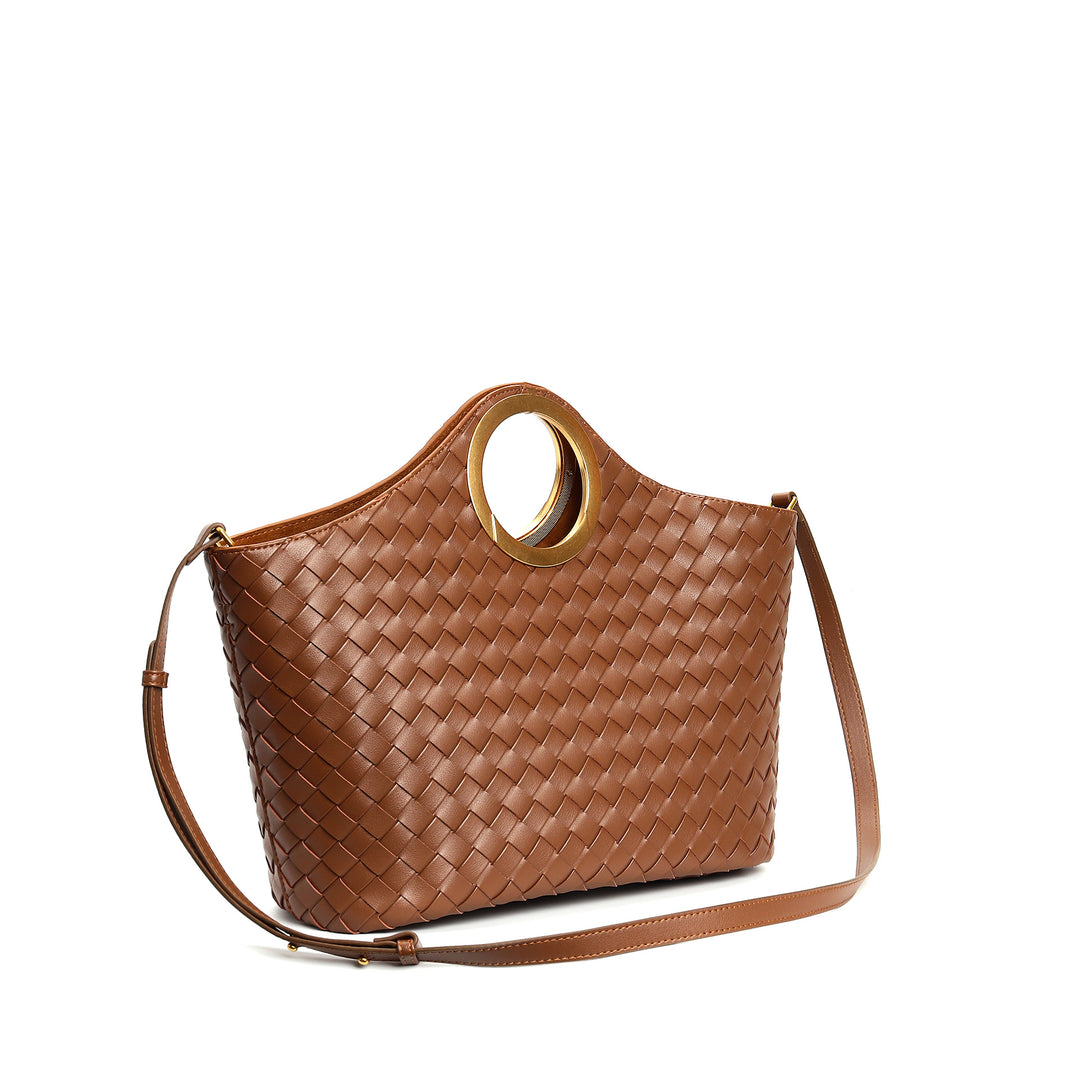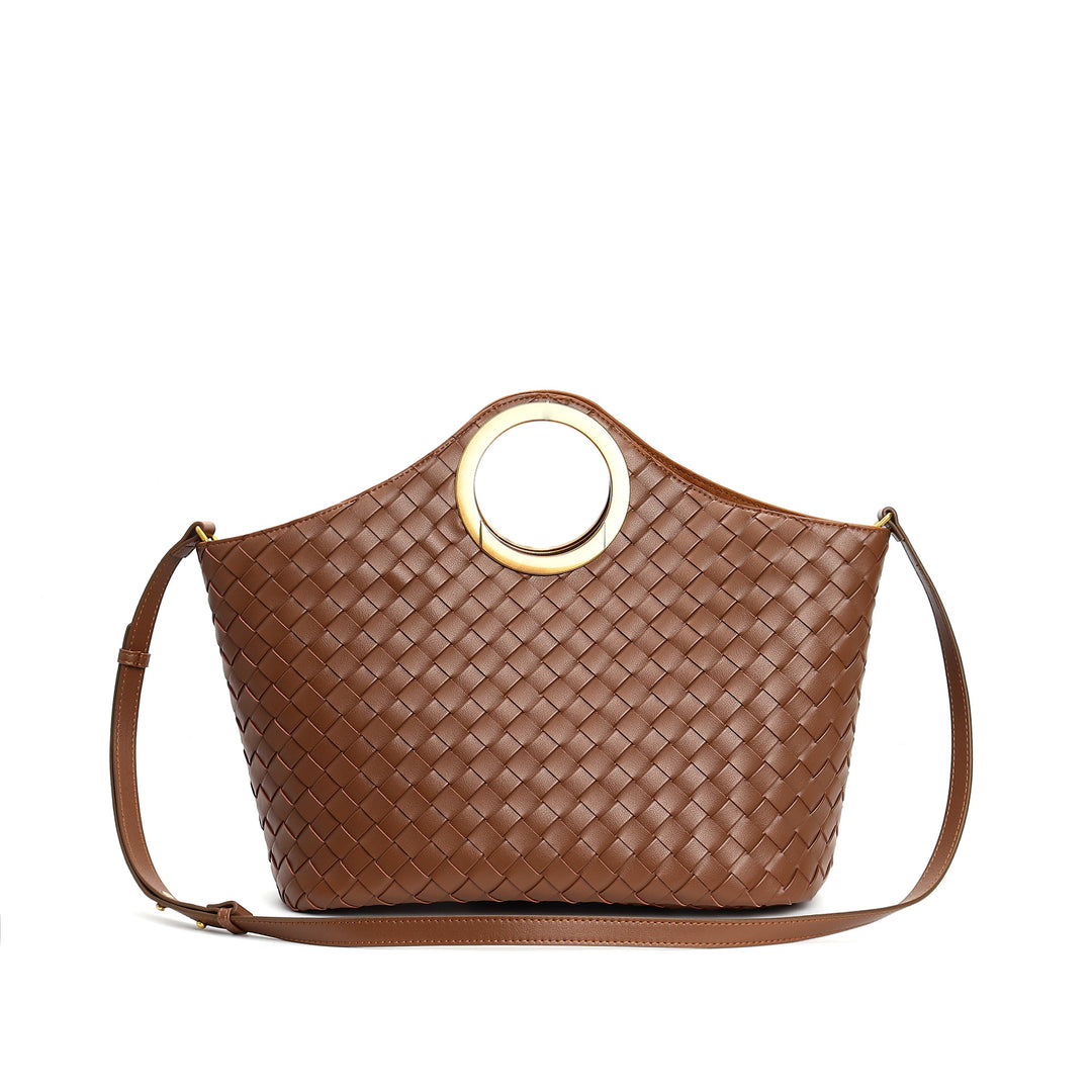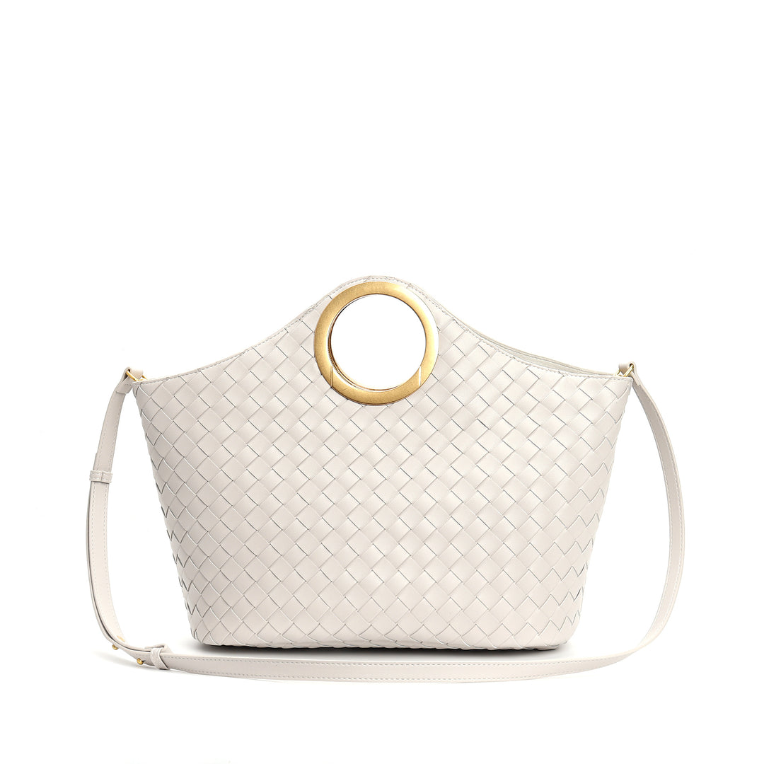 حقيبة توت أنيقة مصنوعة من جلد منسوج بمقبض معدني دائري أنيق. تتميز بحزام كتف قابل للفصل لإطلالة متعددة الاستخدامات، ومساحة داخلية واسعة تتسع للضروريات اليومية. تصميم كلاسيكي بلمسة عصرية.