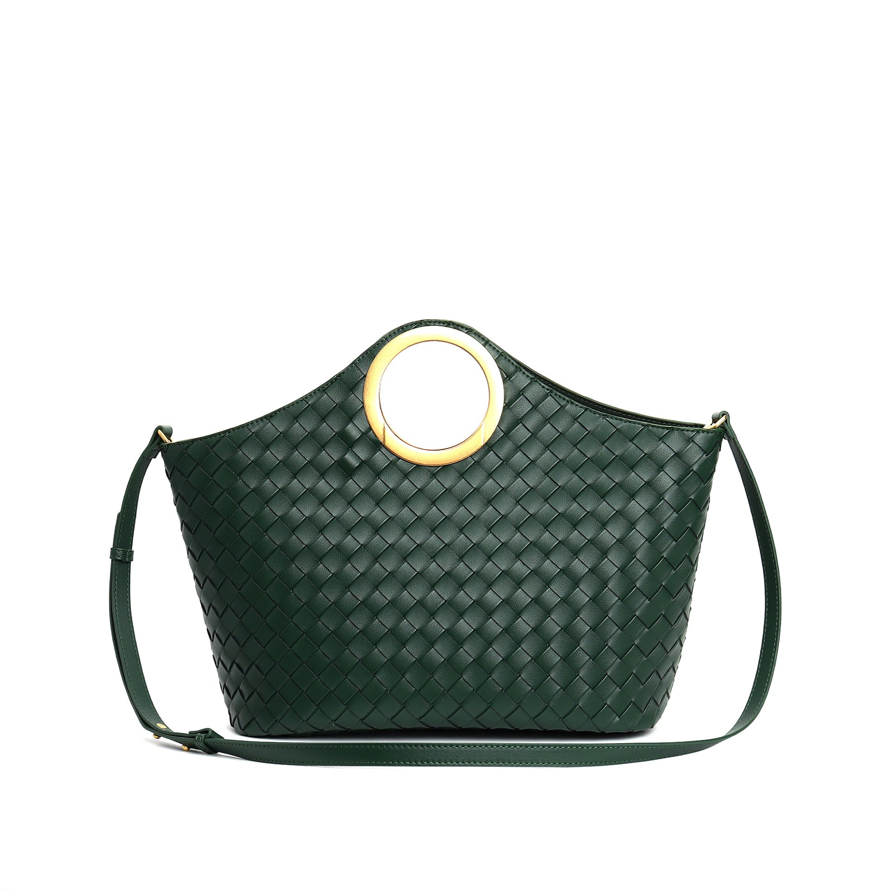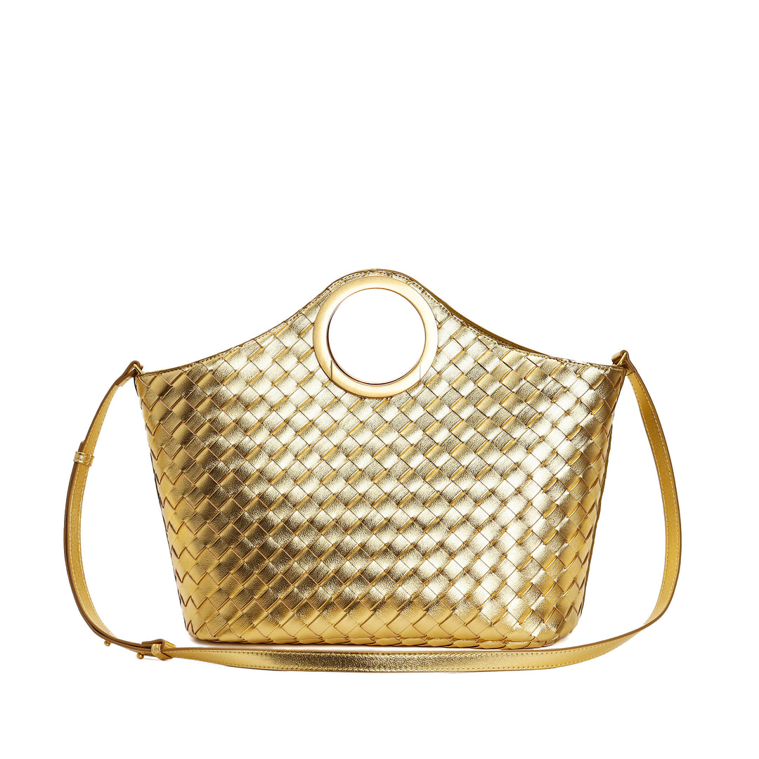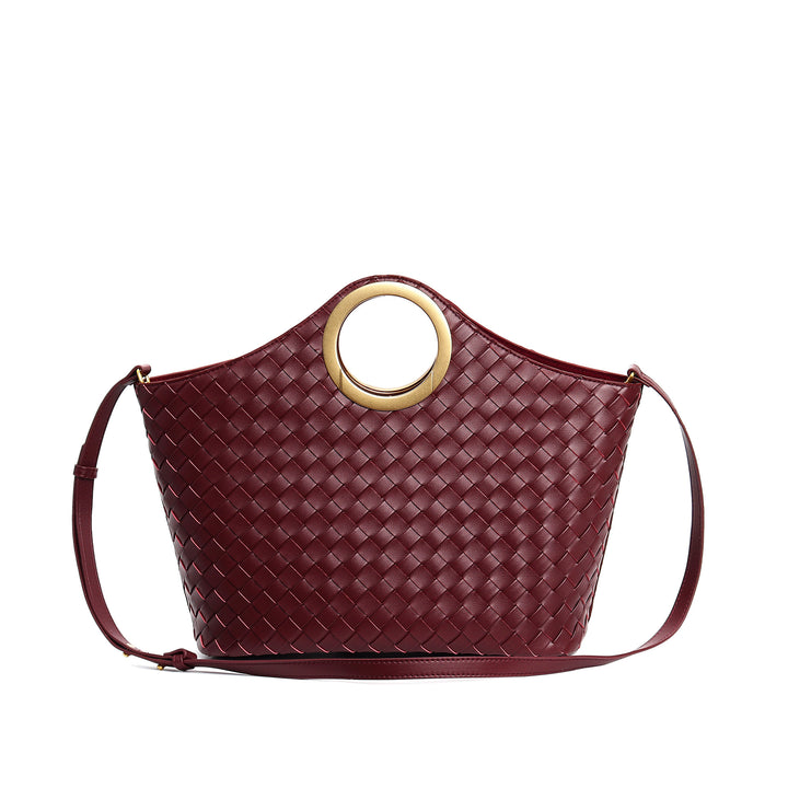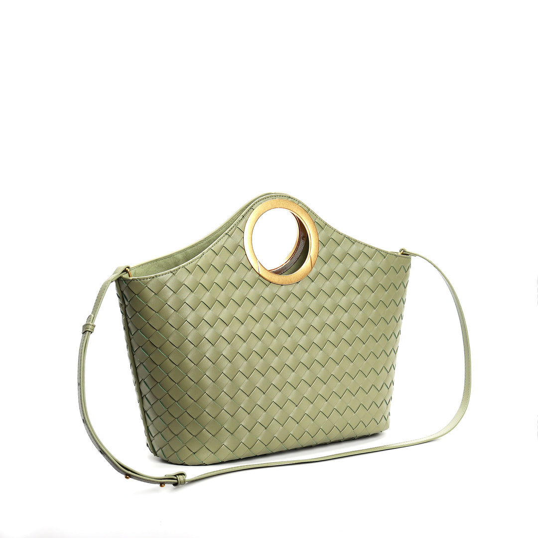 حقيبة توت أنيقة مصنوعة من جلد منسوج بمقبض معدني دائري أنيق. تتميز بحزام كتف قابل للفصل لإطلالة متعددة الاستخدامات، ومساحة داخلية واسعة تتسع للضروريات اليومية. تصميم كلاسيكي بلمسة عصرية.