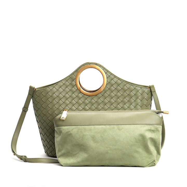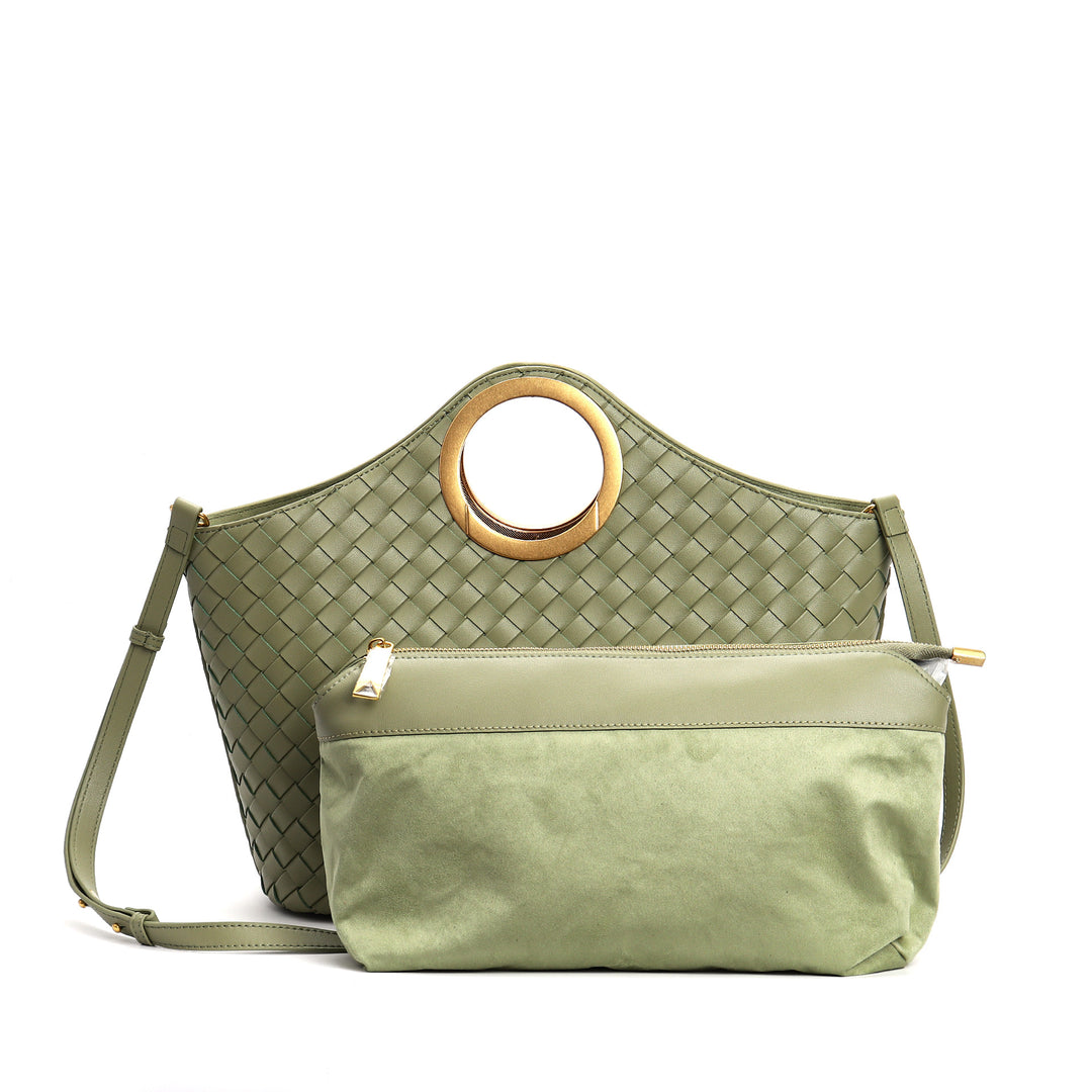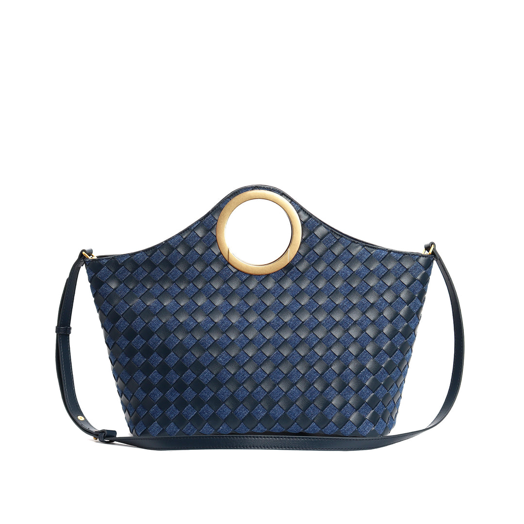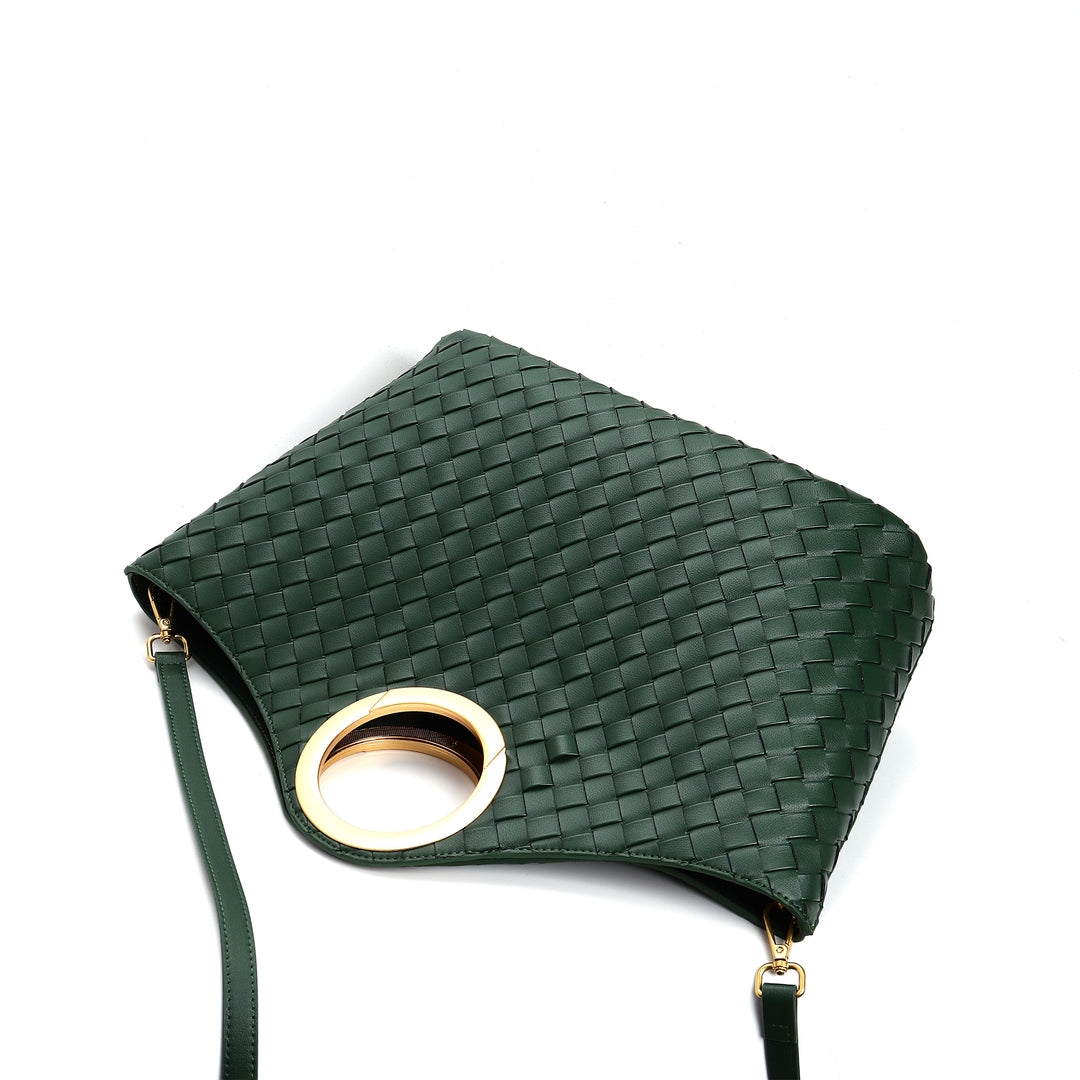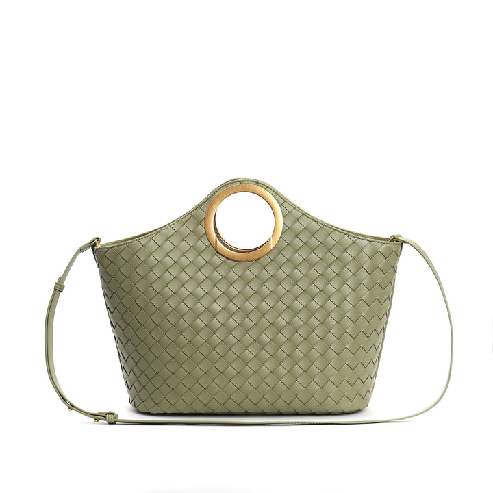 حقيبة توت أنيقة مصنوعة من جلد منسوج بمقبض معدني دائري أنيق. تتميز بحزام كتف قابل للفصل لإطلالة متعددة الاستخدامات، ومساحة داخلية واسعة تتسع للضروريات اليومية. تصميم كلاسيكي بلمسة عصرية.