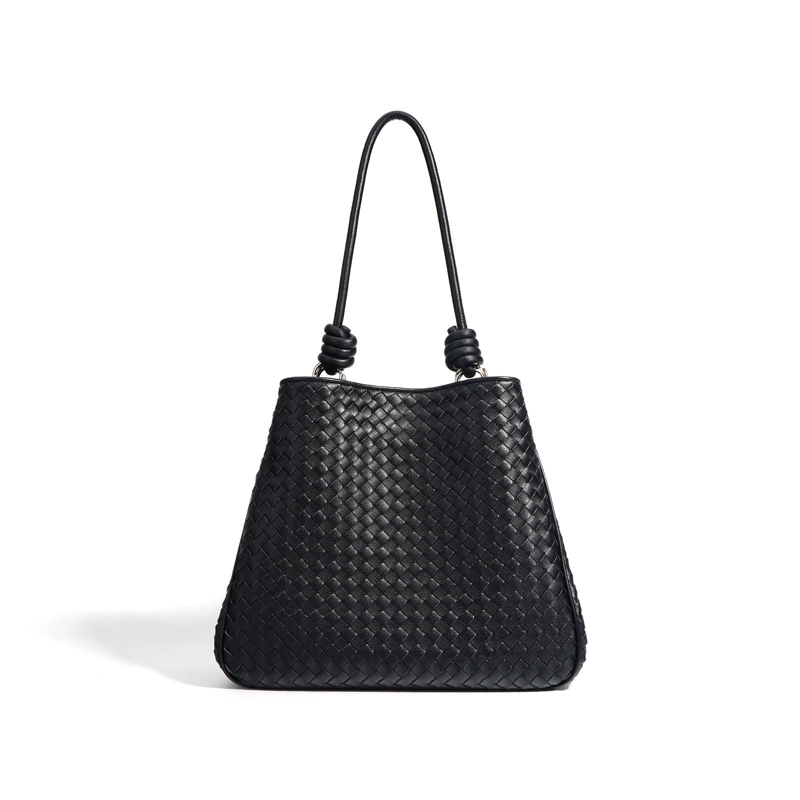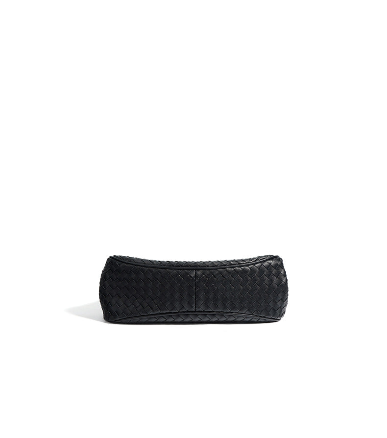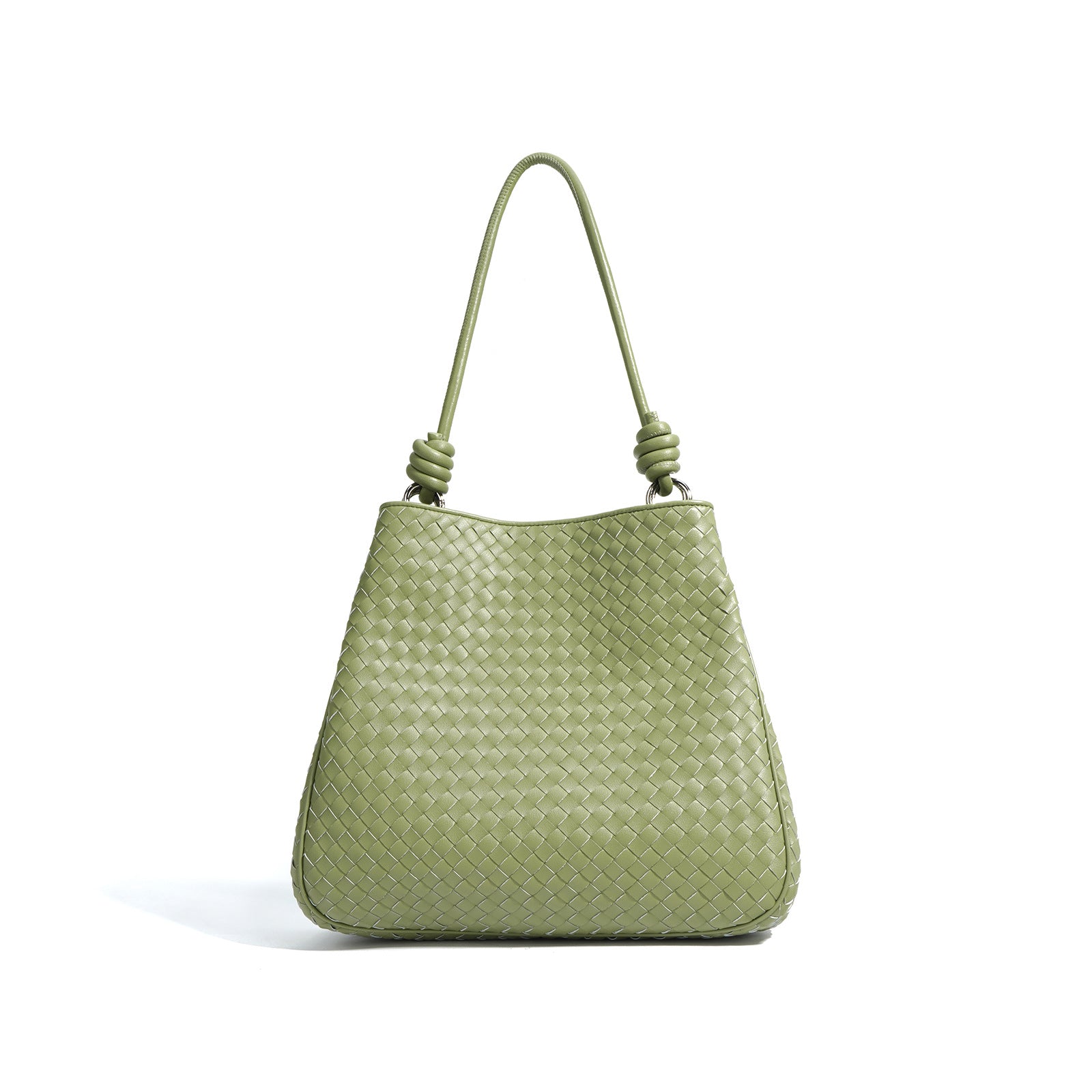 حقيبة كتف رائعة الصنع، مصنوعة من جلد منسوج مميز بتصميم شبه منحرف. مزينة بأحزمة عصرية معقودة ومقبض واحد أنيق، تجمع بين الحرفية والأناقة العصرية.