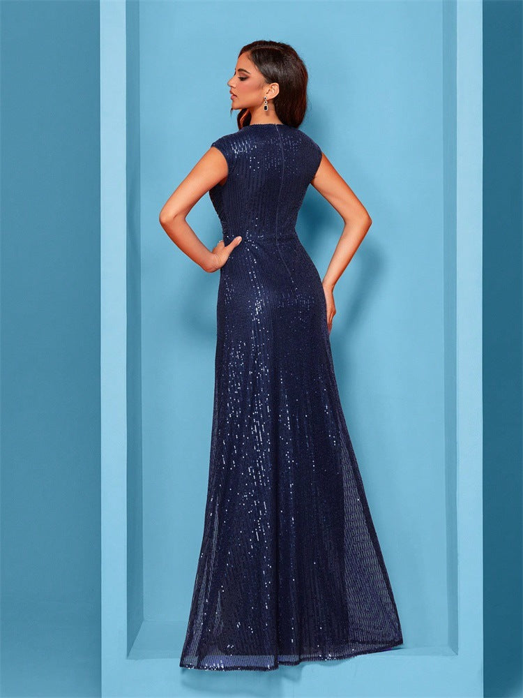 فستان متألق مزين بالترتر، يتميز بياقة على شكل حرف V، وخصر بكشكشة، وأكمام قصيرة. مصمم لإبراز قوامكِ، مع لمسة من التألق الخالد.