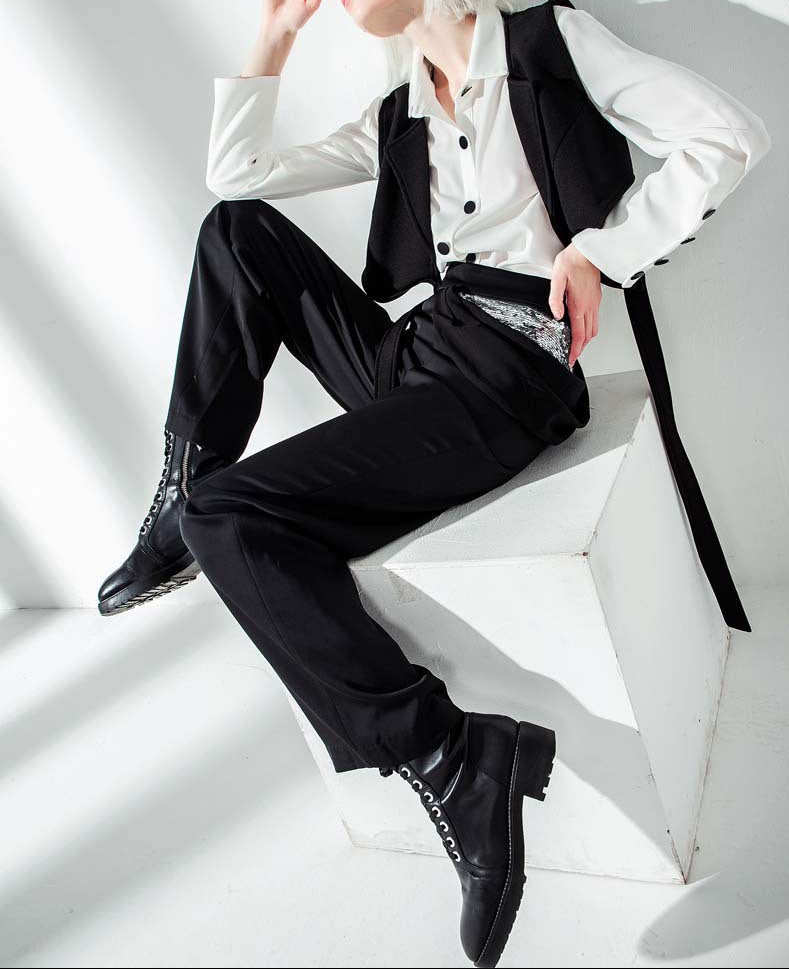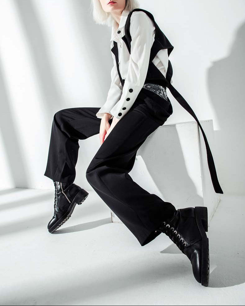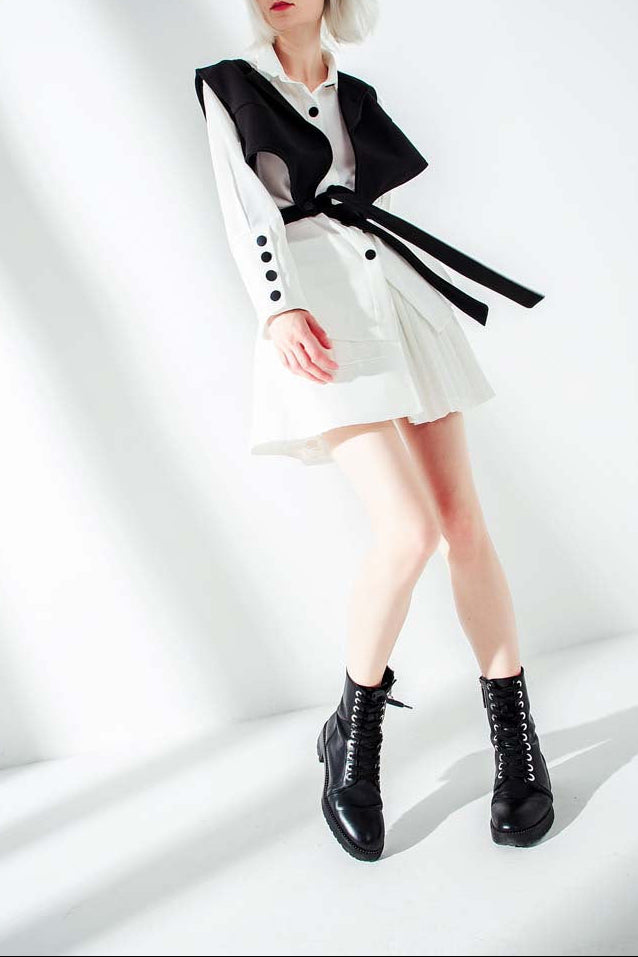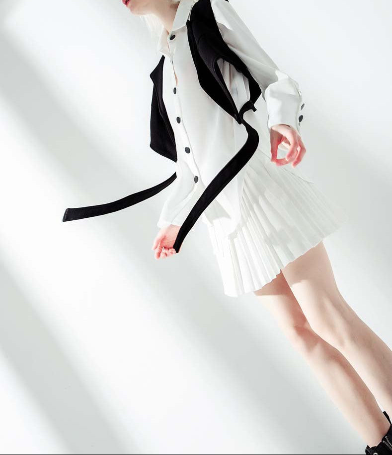 تصميم أنيق متعدد الطبقات يجمع بين قميص أبيض ناصع بأزرار وسترة سوداء قصيرة. يتميز بأزرار بلون مغاير، وأساور أكمام طويلة، وأحزمة خصر قابلة للتعديل لإبراز قوامك، ليمنحكِ هذا الطقم خياطة دقيقة بلمسة عصرية جريئة، مثالي لإطلالة مميزة في العمل أو لإطلالة أنيقة في الشارع.