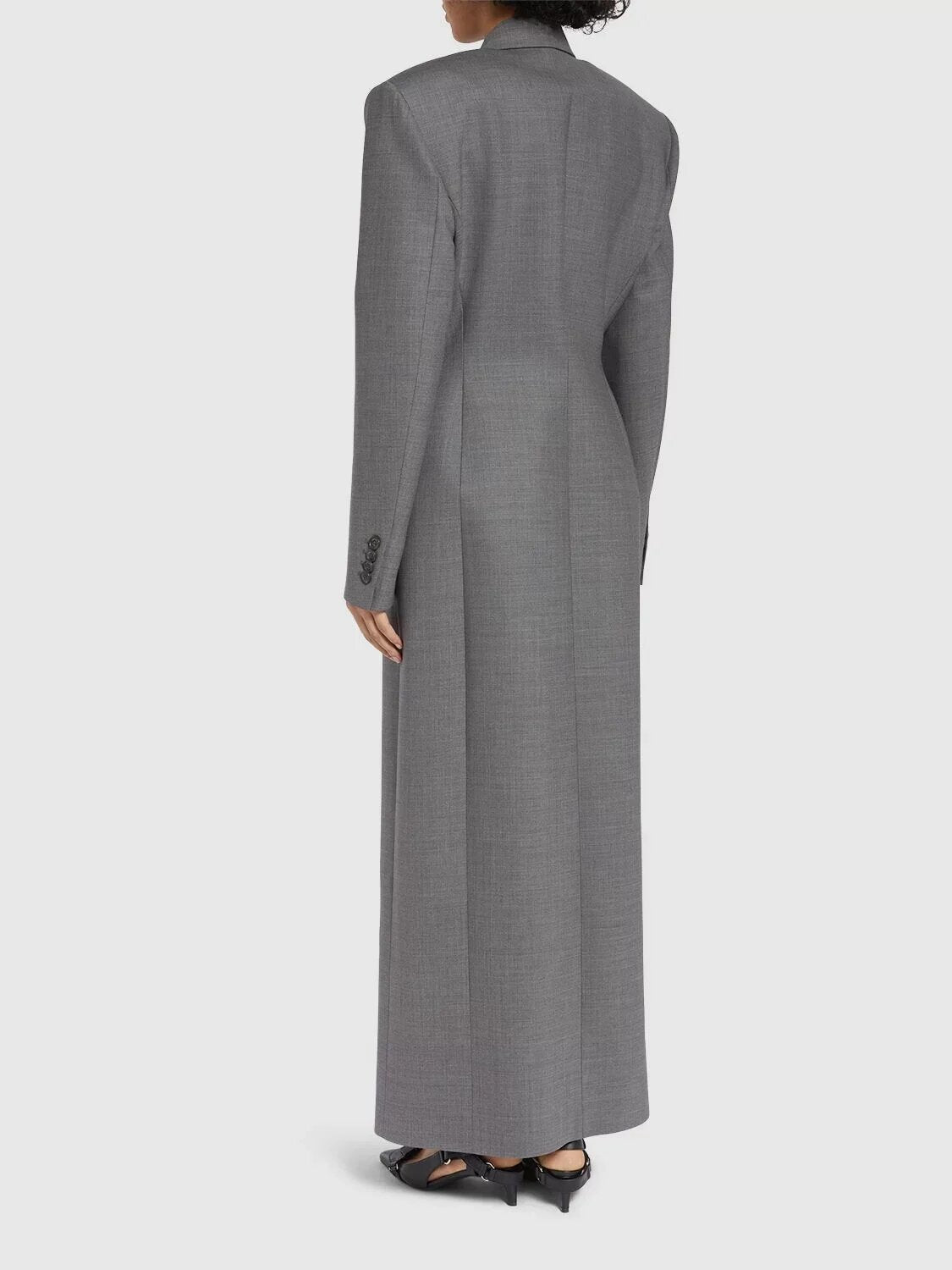 فستان بليزر طويل بتصميم مميز باللون الرمادي الأنيق، يتميز بأكتاف مبطنة قوية وتصميم واسع. يتميز بواجهة مزدوجة الصدر وأزرار غير لامعة وياقة صدر أنيقة، ويجمع بين القوة الرجولية والأناقة البسيطة، مثالي لإطلالة عصرية أنيقة.