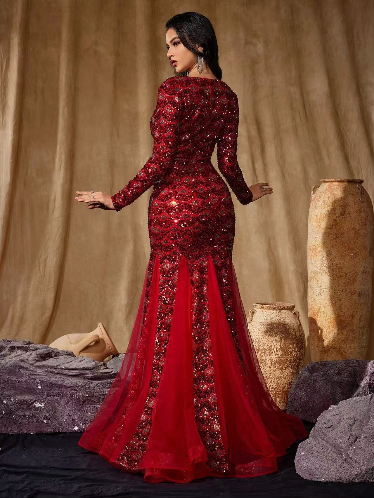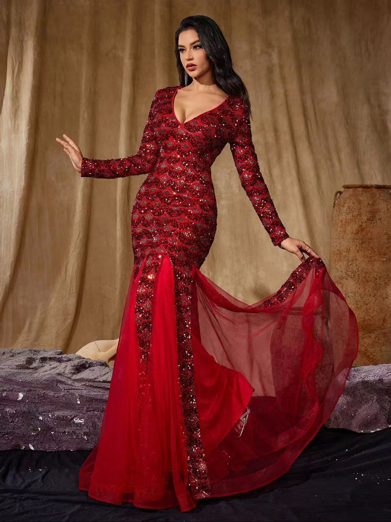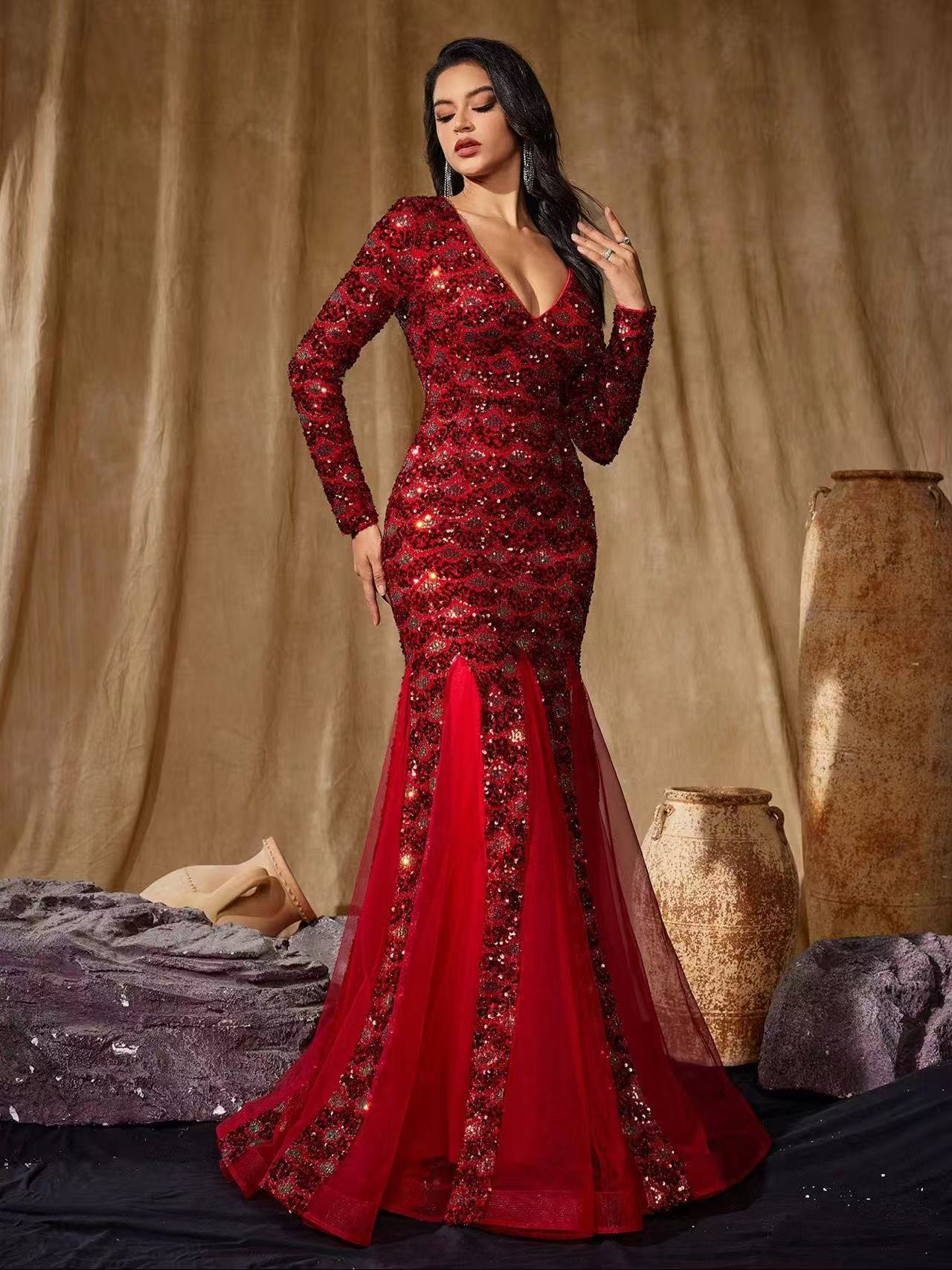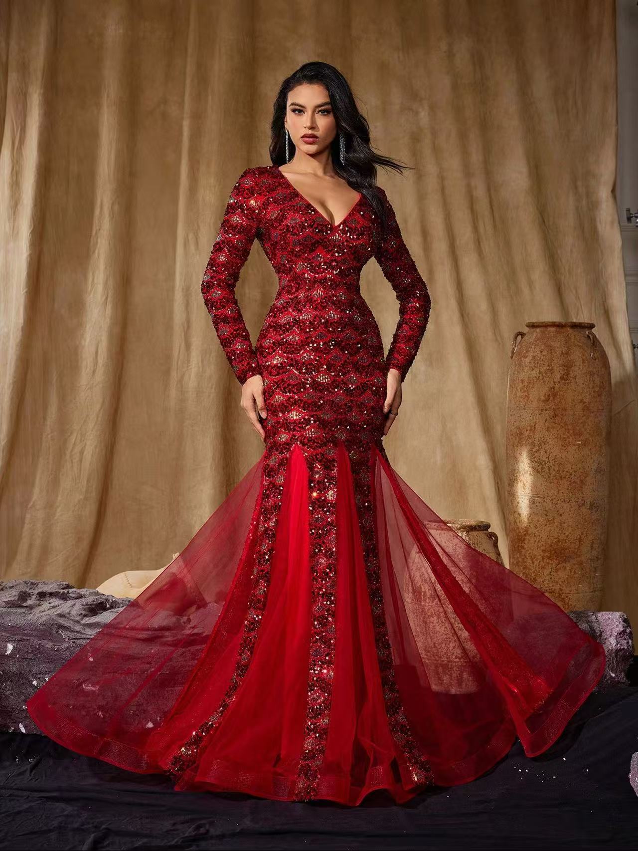 فستان حورية البحر الأحمر الرائع، مزين بترتر لامع وإضافات من قماش شبكي شفاف. مصمم بفتحة رقبة عميقة على شكل حرف V، وقصة ضيقة تتسع برشاقة عند الحافة، مثالي للمناسبات الأنيقة.