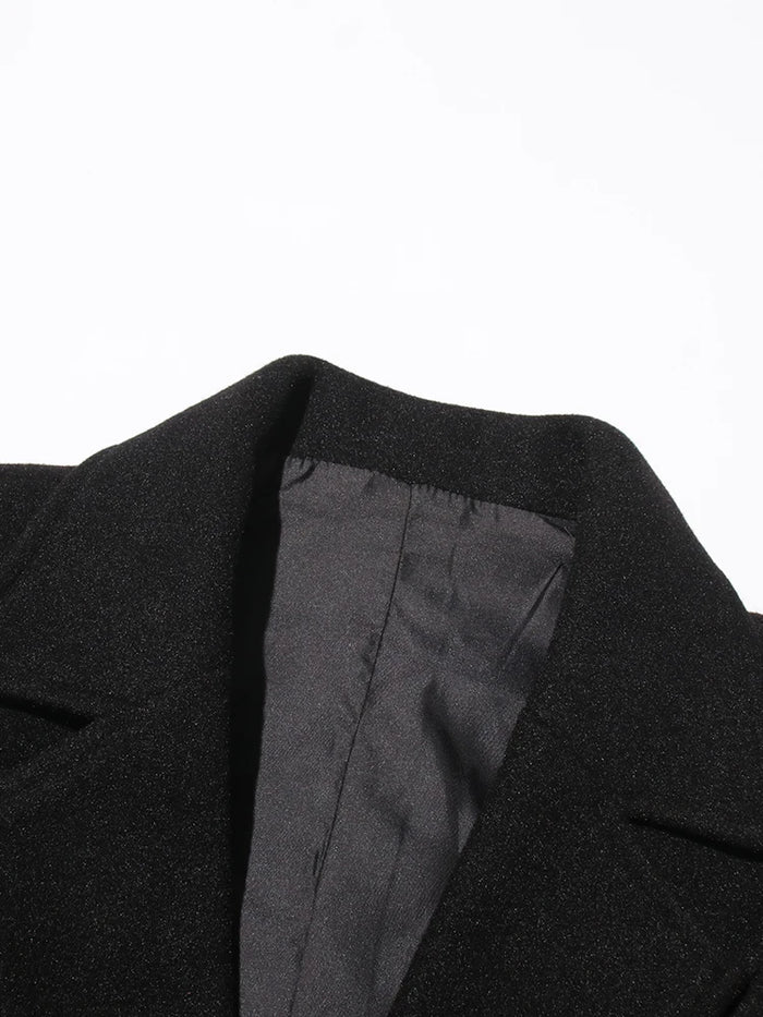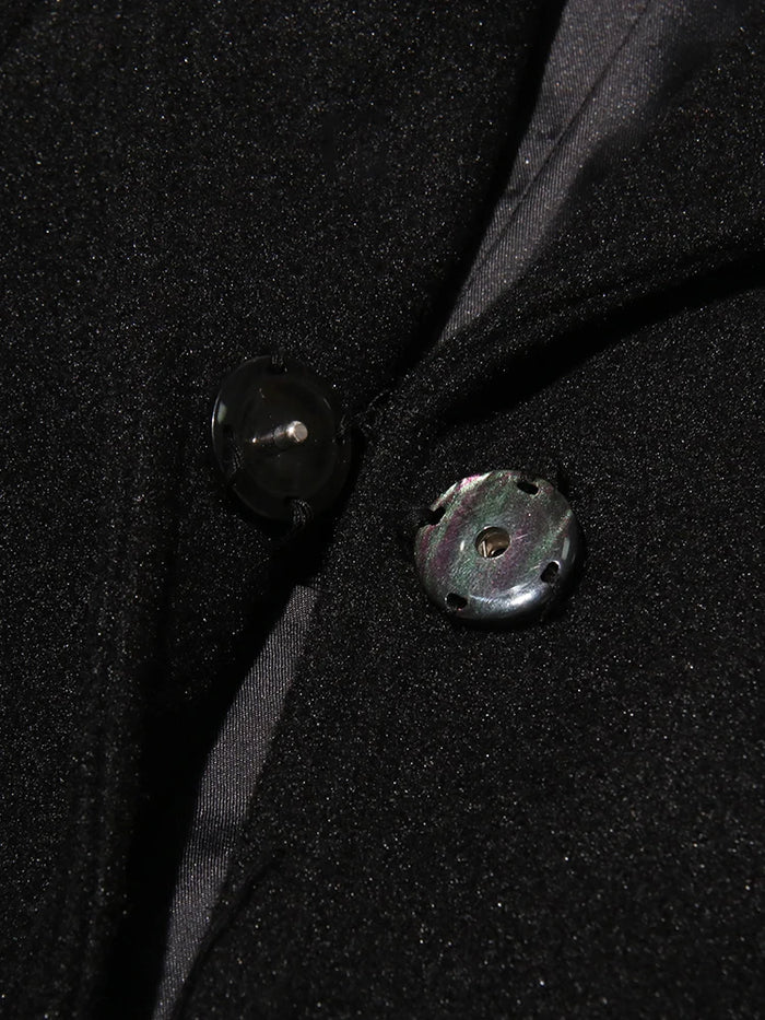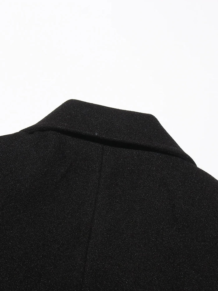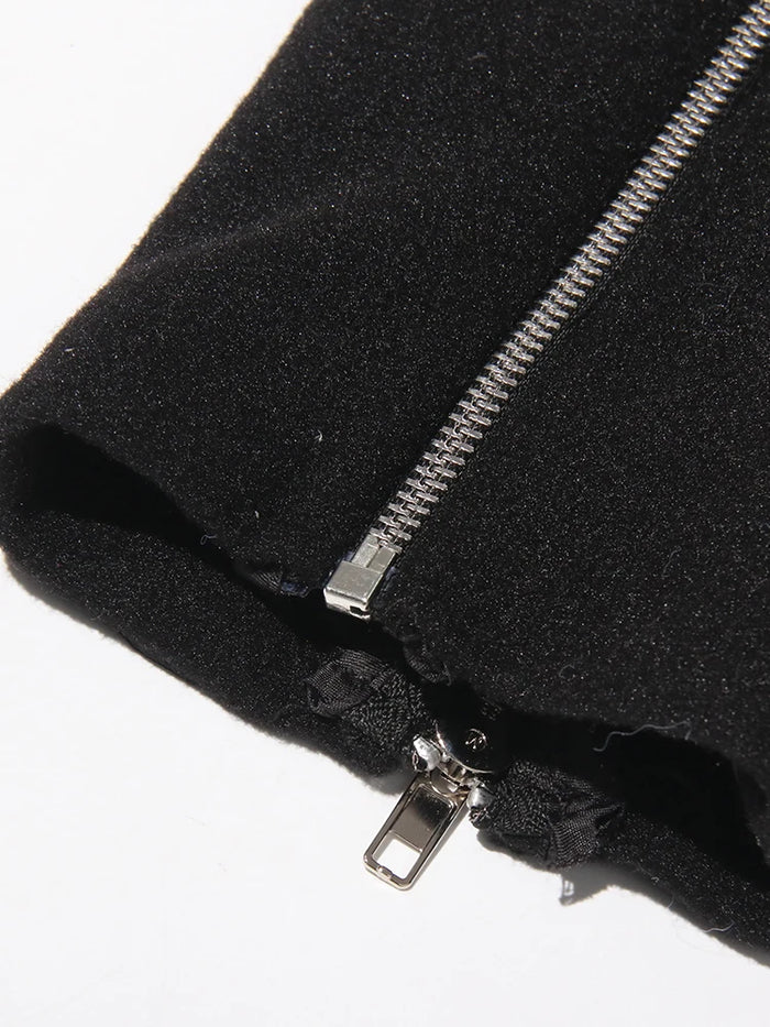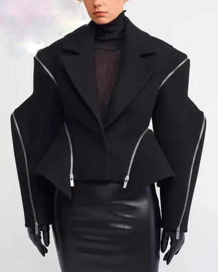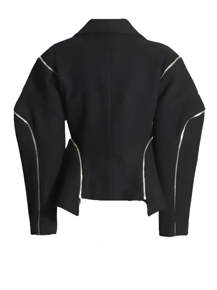 جاكيت أنيق بتصميم معماري جريء باللون الأسود، يتميز بسحابات فضية مكشوفة وقصة مصممة بدقة تبرز جمال القوام. قطعة مميزة تجمع بين اللمسة العصرية والأناقة الراقية.