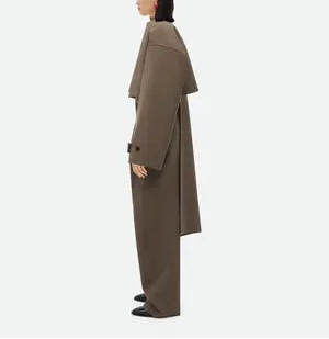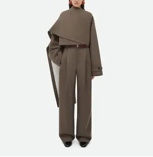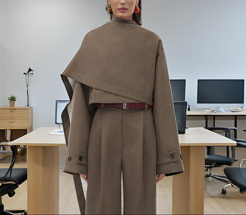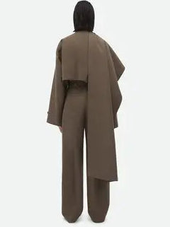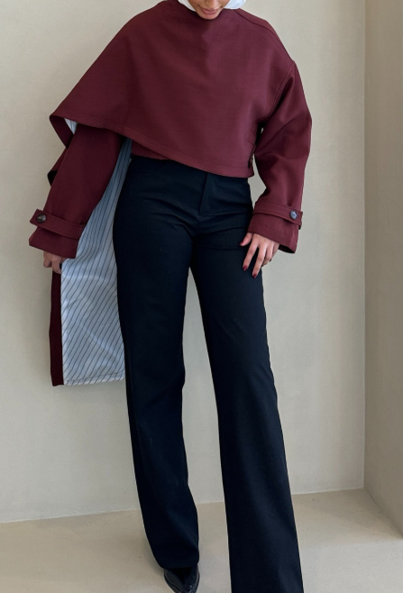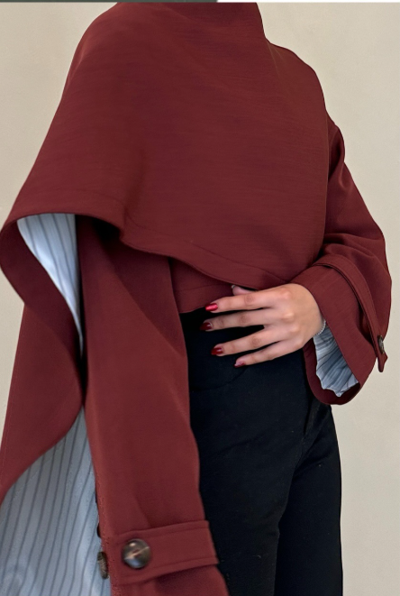 بدلة كستنائية أنيقة، مصممة خصيصاً، تتميز بتصميمها المنحوت، وأكتافها منظمة، وخصرها ضيق، وأزرارها الذهبية البارزة. نسقيها مع بنطال بقصة مستقيمة لإطلالة راقية، قوية، وأنيقة، مثالية للمناسبات الرسمية والأمسيات الراقية.