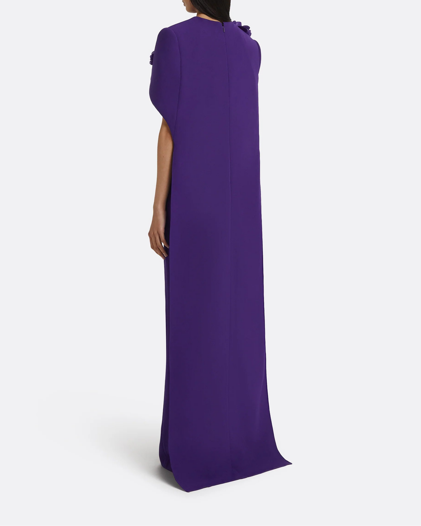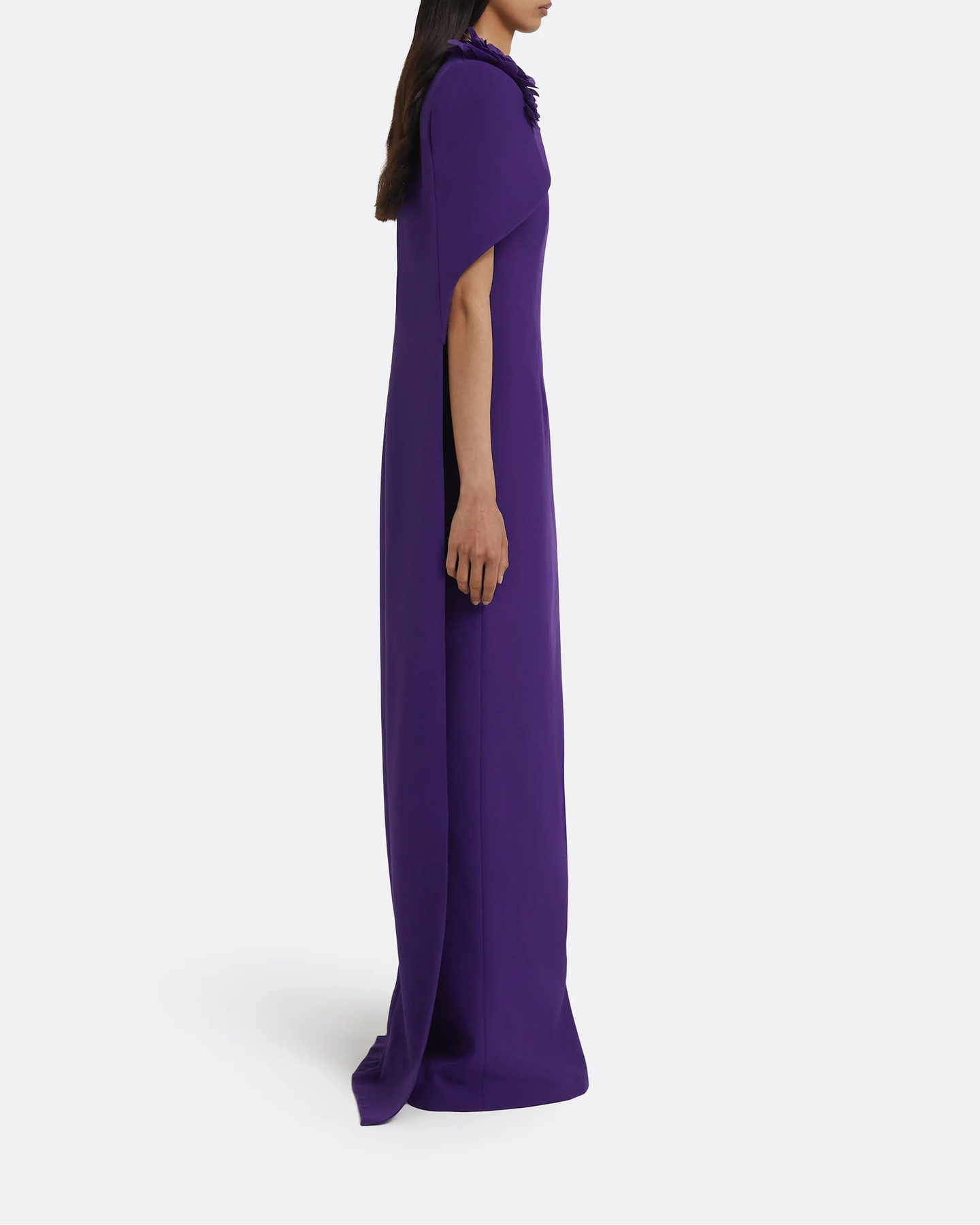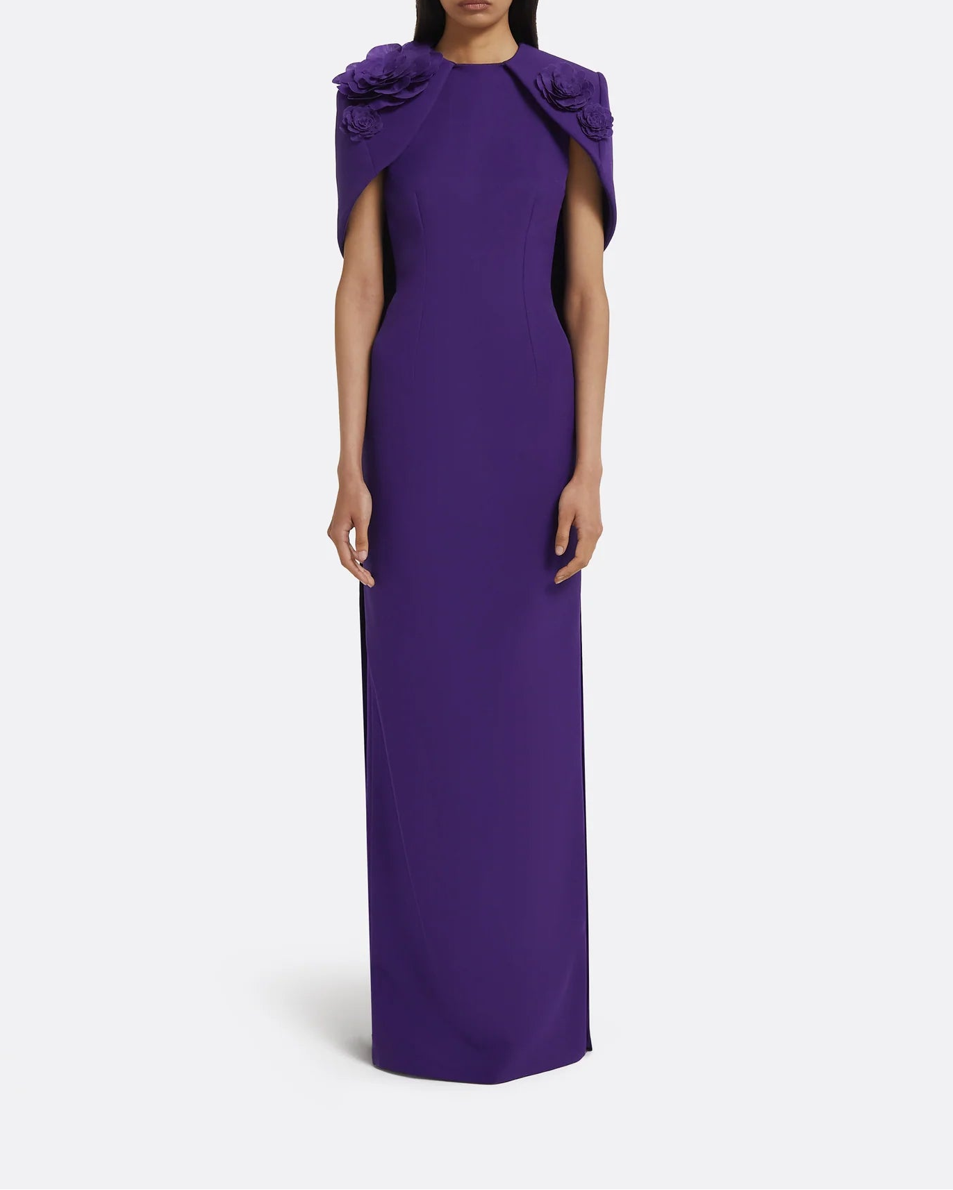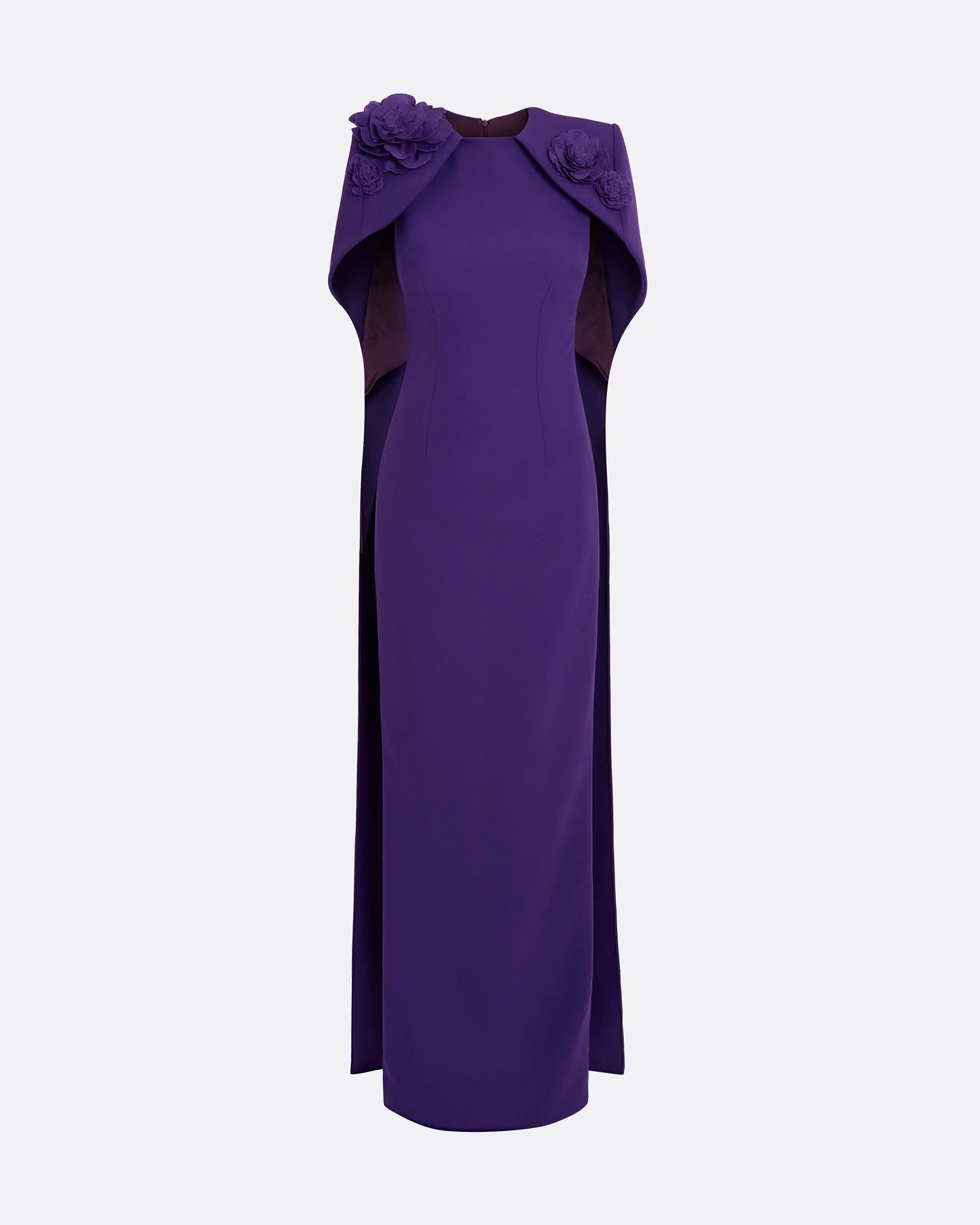 فستان عمودي أنيق بلون بنفسجي أرجواني، مُنسّق مع عباءة قصيرة منحوتة مزينة بزخارف زهرية ثلاثية الأبعاد على الكتفين. تصميم راقي، منظم، ودراماتيكي برشاقة، مثالي للمناسبات المسائية الراقية.