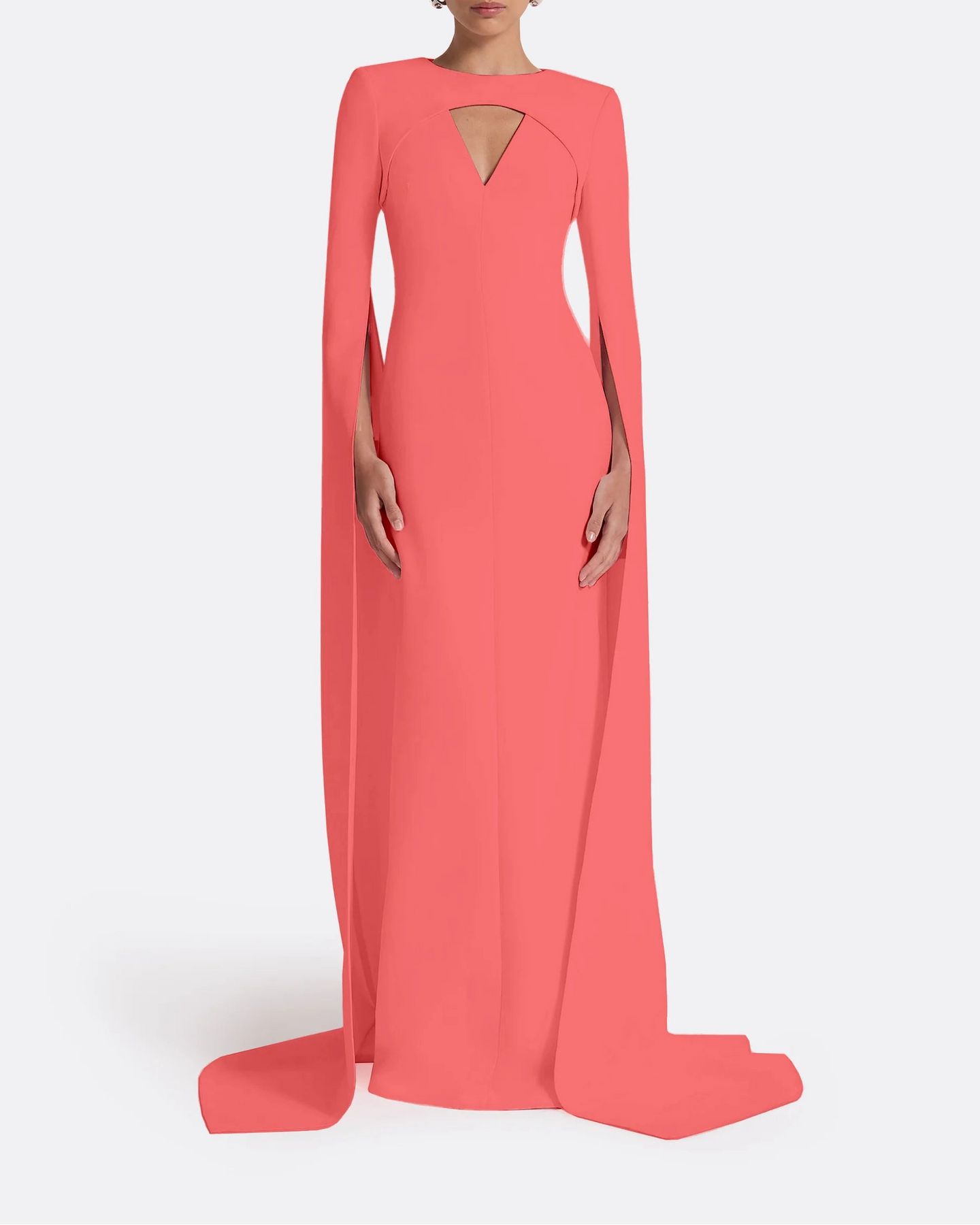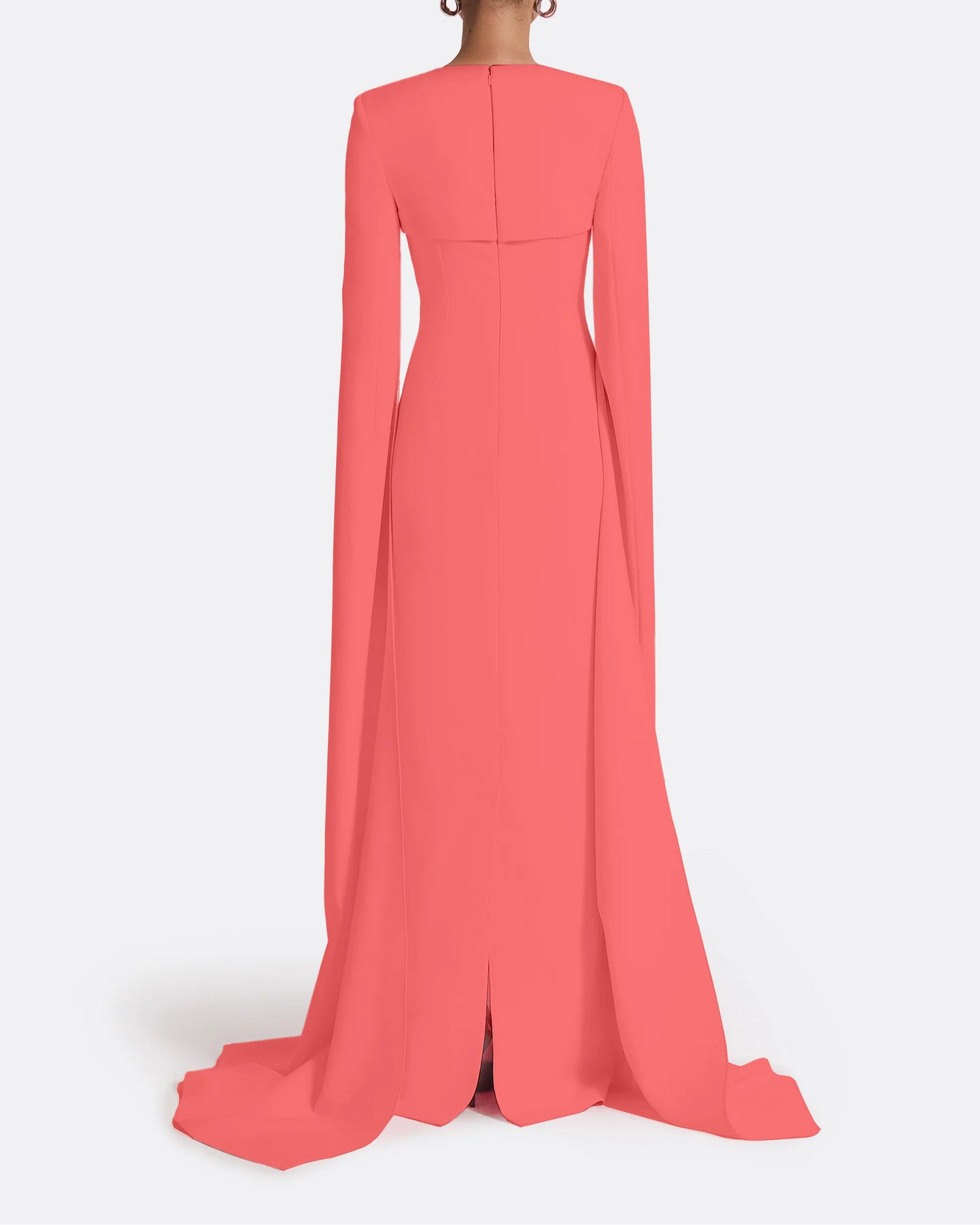 فستان سهرة مرجاني رائع بأكمام طويلة على شكل كاب وفتحة عنق أنيقة. أنيق، عصري، وساحر بكل سهولة، مثالي للمناسبات الرسمية المميزة.