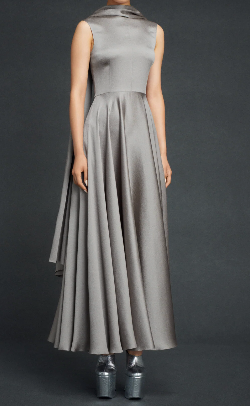 فستان سهرة أنيق باللون الرمادي الفضي، يتميز بياقة ناعمة منسدلة وصدرية بدون أكمام منحوتة، تتدفق لتنورة دائرية أنيقة. يضفي الساتان الناعم لمسةً من الفخامة والتألق، ليمنحكِ إطلالةً رومانسيةً خالدةً، مثاليةً للاحتفالات الرسمية والمناسبات الراقية.
