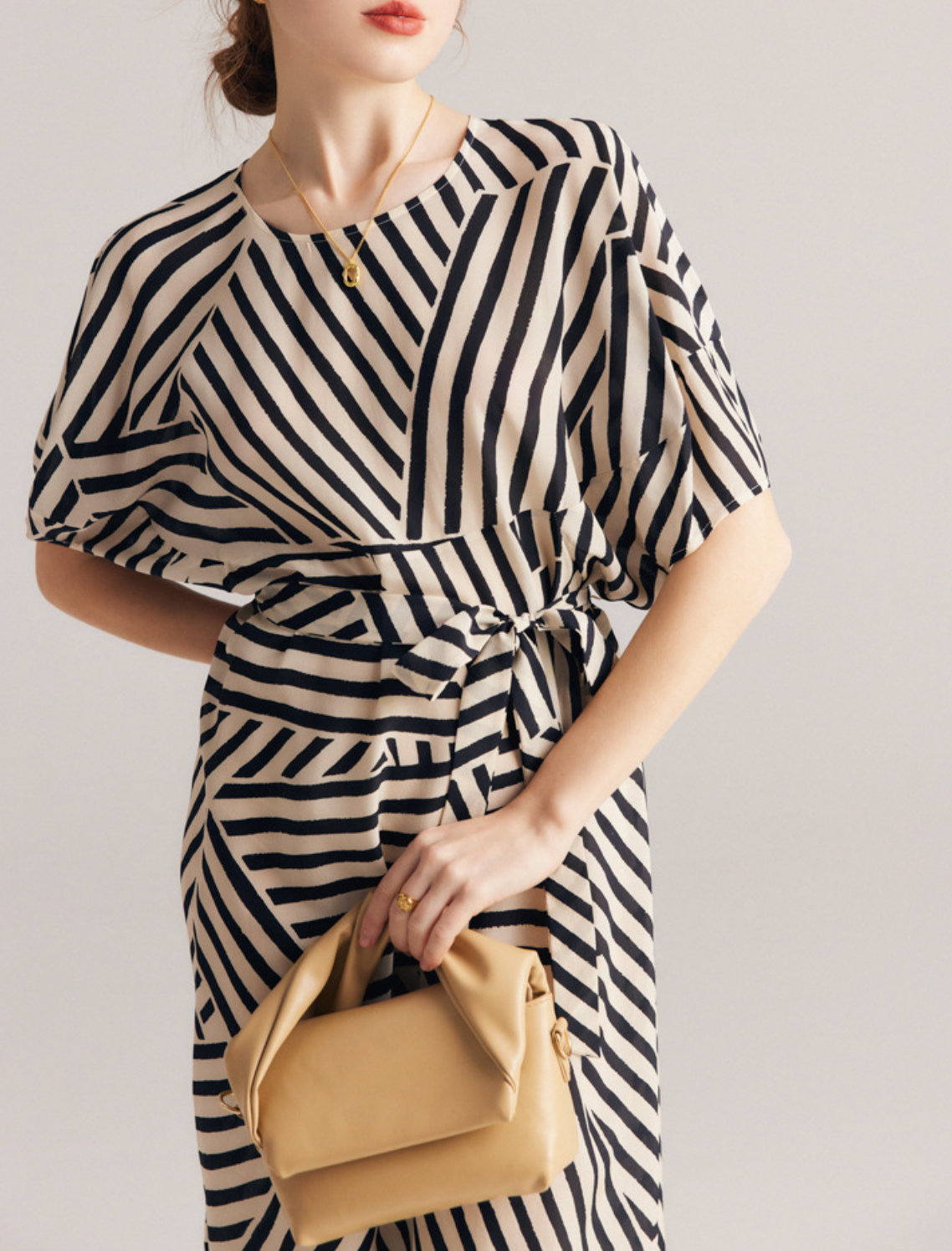 فستان ميدي أنيق يتميز بنقشة هندسية جريئة مخططة تُضفي عليه لمسة عصرية تُبرز جمال قوامك. صُمم بأكمام قصيرة مريحة وخصر برباط أنيق، ليمنحكِ إطلالة أنيقة وعصرية تناسب النهار والمساء على حد سواء. مصنوع من قماش خفيف الوزن وانسيابي يوفر لكِ الراحة طوال اليوم مع لمسة نهائية مصقولة.