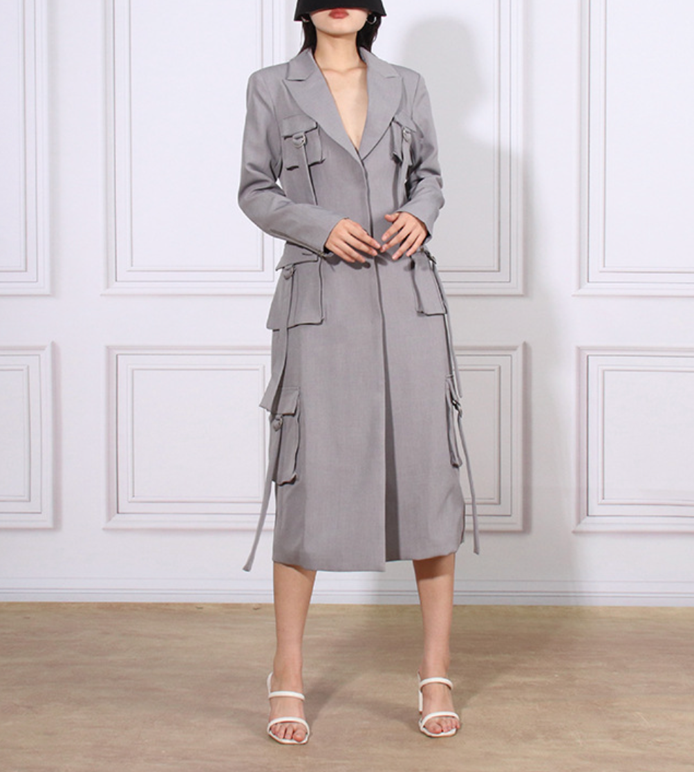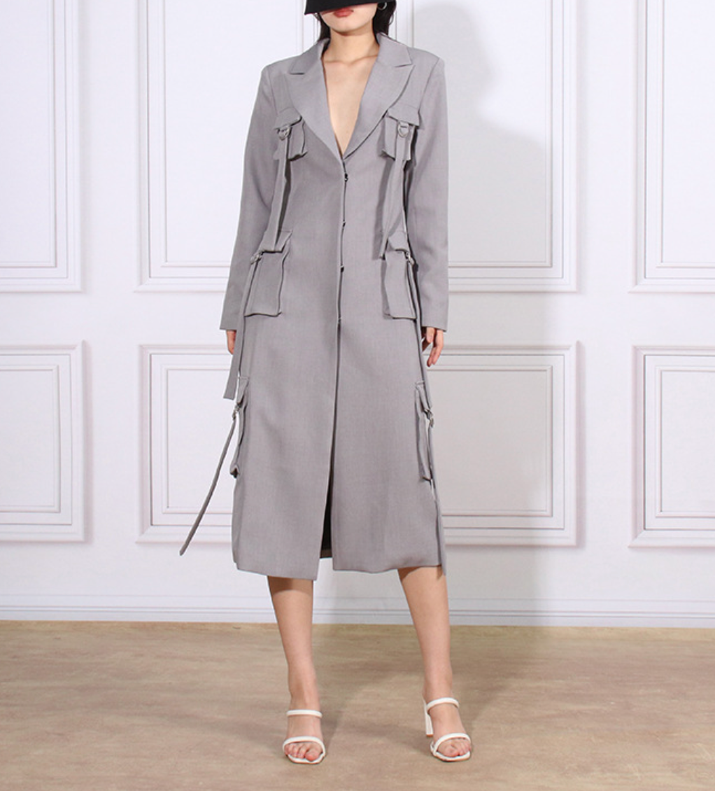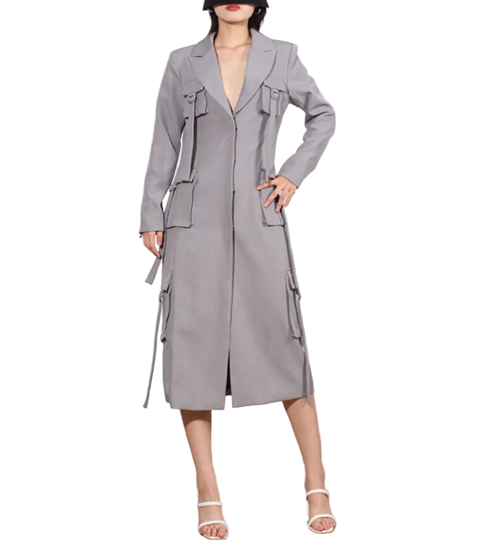 فستان بليزر طويل أنيق بلون رمادي فاتح، مصمم بياقة عريضة وقصة محددة. يتميز بتفاصيل عملية على شكل حمالات وأجزاء قابلة للتعديل، يجمع هذا الفستان بين اللمسة العصرية والأناقة الراقية، مما يجعله مثالياً لإطلالة مميزة خلال النهار أو لإطلالة مسائية راقية.