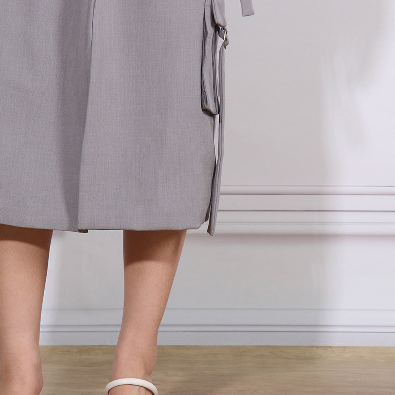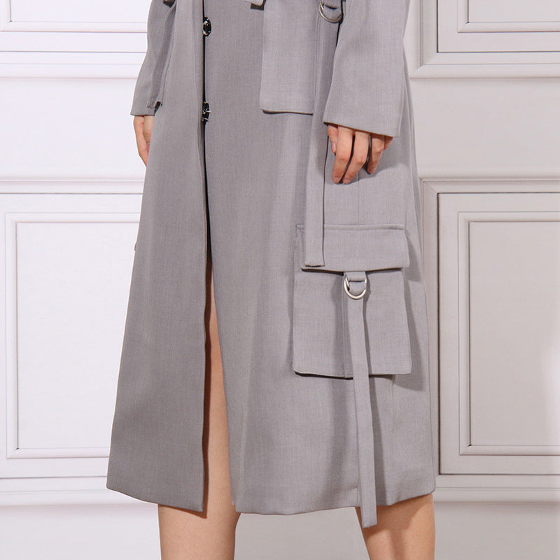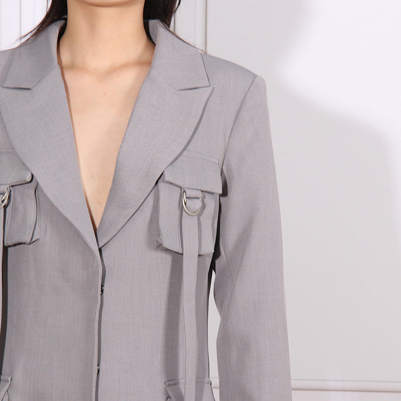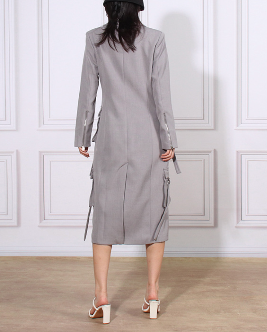 فستان بليزر طويل أنيق بلون رمادي فاتح، مصمم بياقة عريضة وقصة محددة. يتميز بتفاصيل عملية على شكل حمالات وأجزاء قابلة للتعديل، يجمع هذا الفستان بين اللمسة العصرية والأناقة الراقية، مما يجعله مثالياً لإطلالة مميزة خلال النهار أو لإطلالة مسائية راقية.