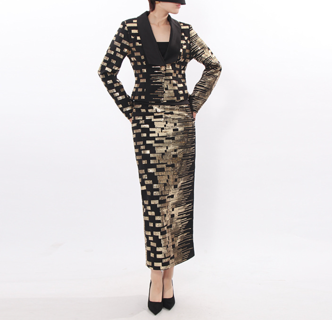 طقم أنيق من قطعتين، يتألف من بليزر مصمم بدقة وتنورة سوداء أنيقة بقصة قلم رصاص، مزينة بتفاصيل هندسية ذهبية لامعة. يتميز هذا الطقم بتصميمه الأنيق وقصته الضيقة التي تبرز جمال القوام، مما يجعله مثالياً للمناسبات المسائية، والعشاءات الراقية، والفعاليات العصرية.