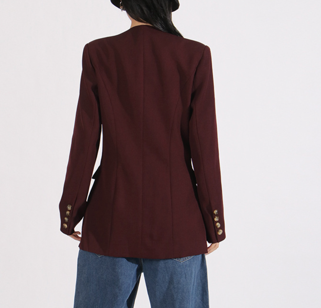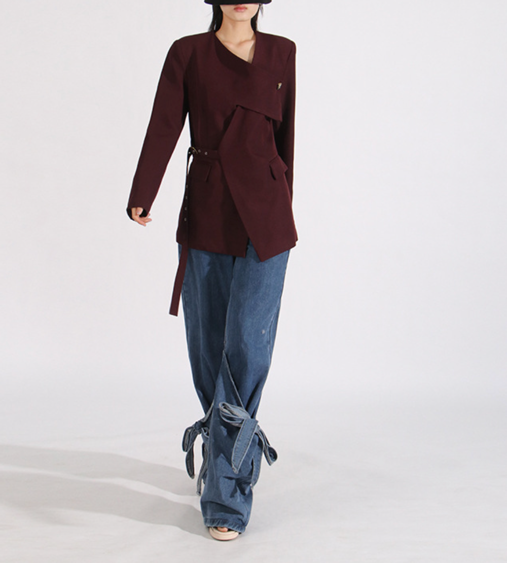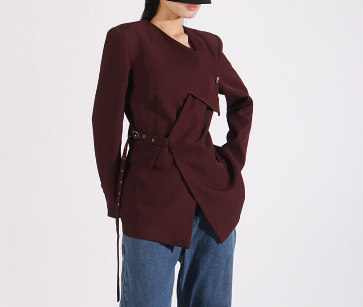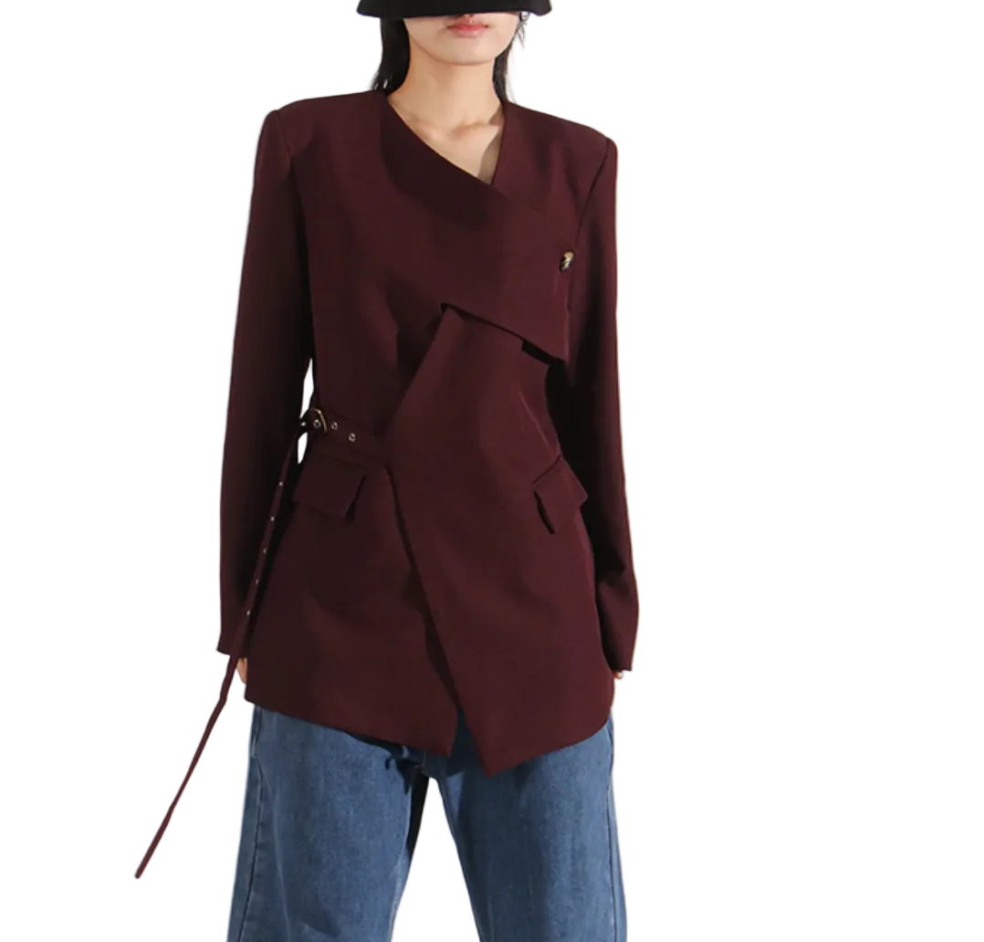بليزر عصري مصمم خصيصاً بلون بورغندي داكن، يتميز بتصميم أمامي غير متماثل وحزام خصر قابل للتعديل لإبراز قوامك. تضفي الخطوط الأنيقة والتصميم الراقي لمسة عصرية على هذه القطعة، مما يجعلها مثالية لإطلالات النهار الراقية، أو إطلالات العمل الإبداعية، أو حتى إطلالات السهرة الأنيقة.