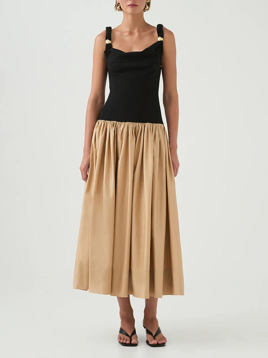 فستان ميدي أنيق ثنائي اللون يتميز بصدرية سوداء ملائمة مع لمسات من الأشرطة باللون الذهبي وتنورة بيج مجمعة كبيرة الحجم لإطلالة متباينة راقية. اسم القماش: قطن المقاس الصدر (سم) الخصر (سم) الورك (سم) الطول (سم) S 74–92 60–76 166 124 M 78–96 64–80 170 125 L 82–100 68–84 174 126 XL 86–104 72–88 178 127
