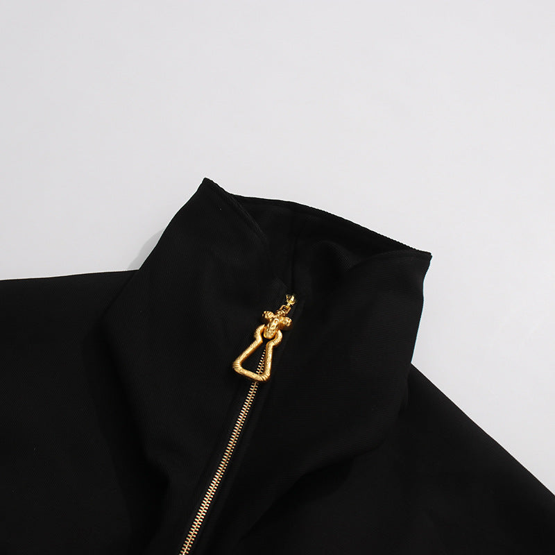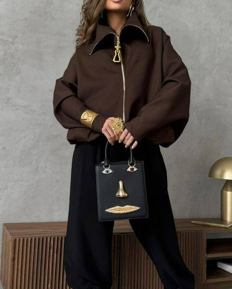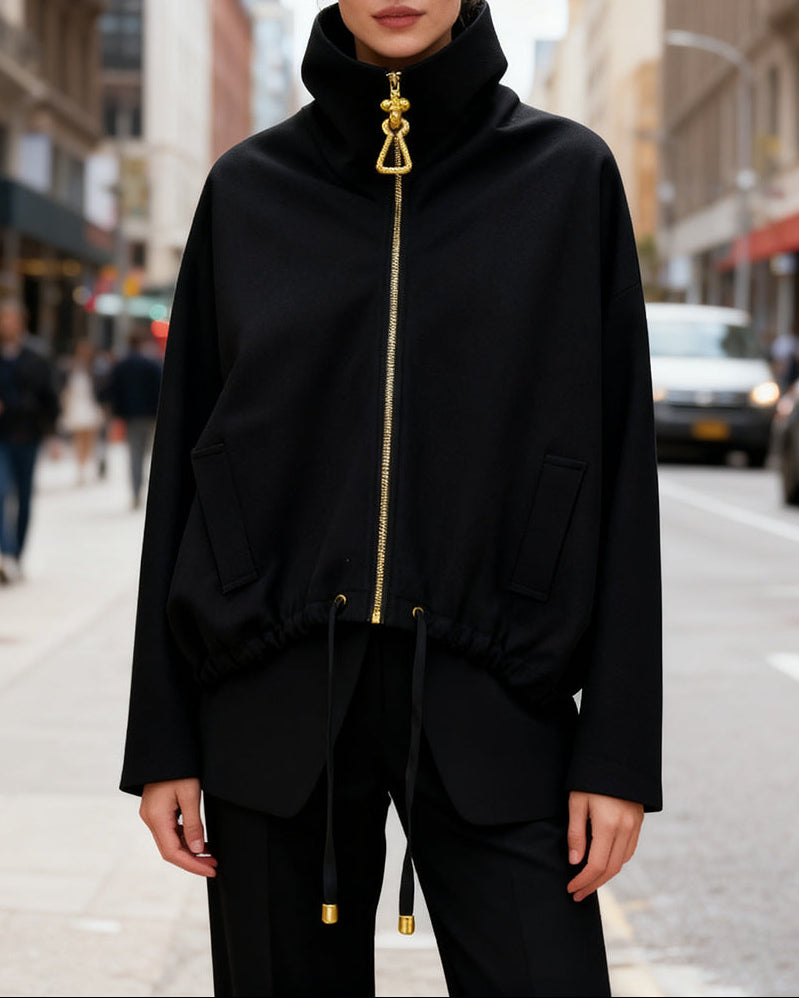 جاكيت أنيق بياقة عالية وسحاب ذهبي مميز وحافة سفلية برباط قابل للتعديل وقصة مريحة - يجمع بسهولة بين الراحة الرياضية والأناقة الراقية. اسم القماش: بوليستر وقطن المقاس الصدر (سم) الخصر (سم) الكم (سم) الطول (سم) S 178 160 105 69–75 M 182 164 106 70–76 L 186 168 107 71–77