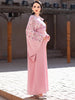 فستان وردي أنيق، مُزيّن بعباءة زهرية خفيفة مزينة بشراشيب. تصميم أنيق وبسيط، مثالي للمناسبات الخاصة أو التجمعات المسائية.