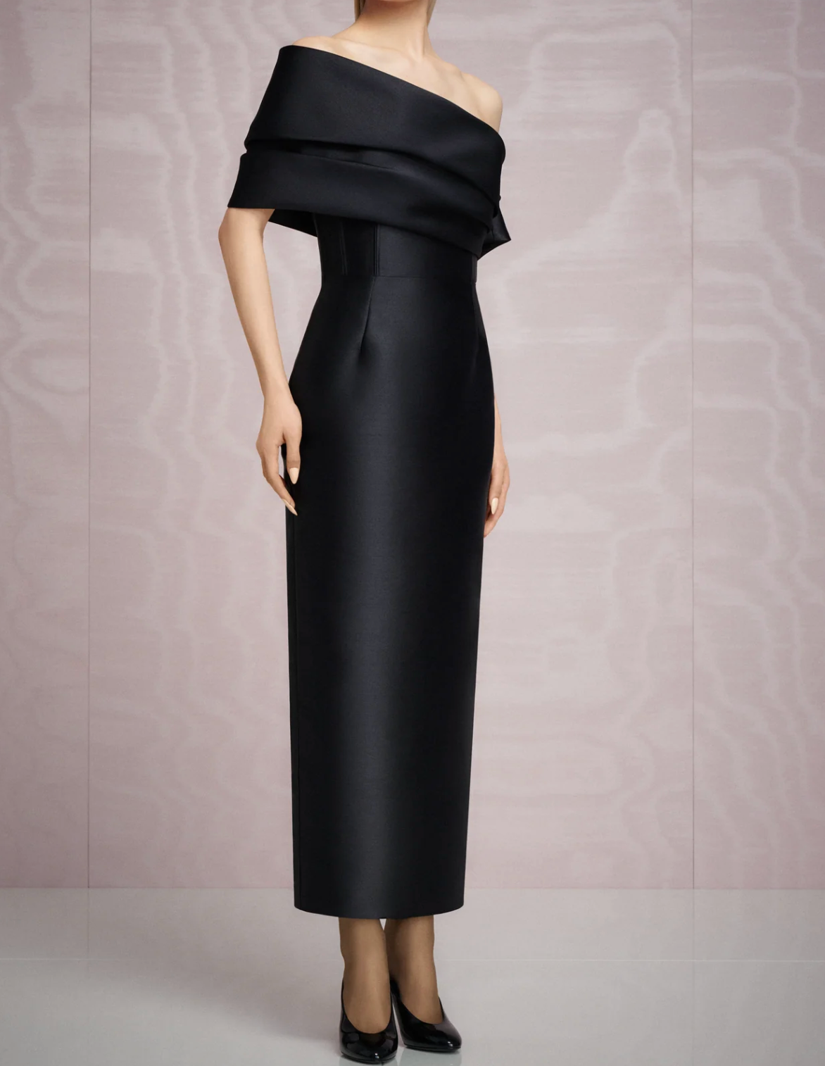 فستان ساتان أسود أنيق متوسط الطول، يتميز بفتحة صدر منحوتة مكشوفة الكتفين، وتصميم أنيق يُبرز قوامك. خطوطه الأنيقة ولمعانه الفاخر يُضفيان عليه أناقة عصرية راقية، مثالي للأمسيات الرسمية وحفلات الكوكتيل والاحتفالات الراقية.