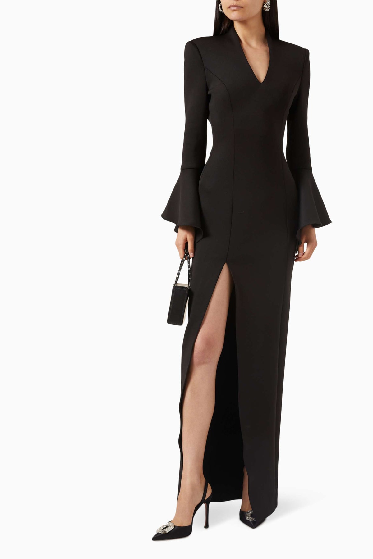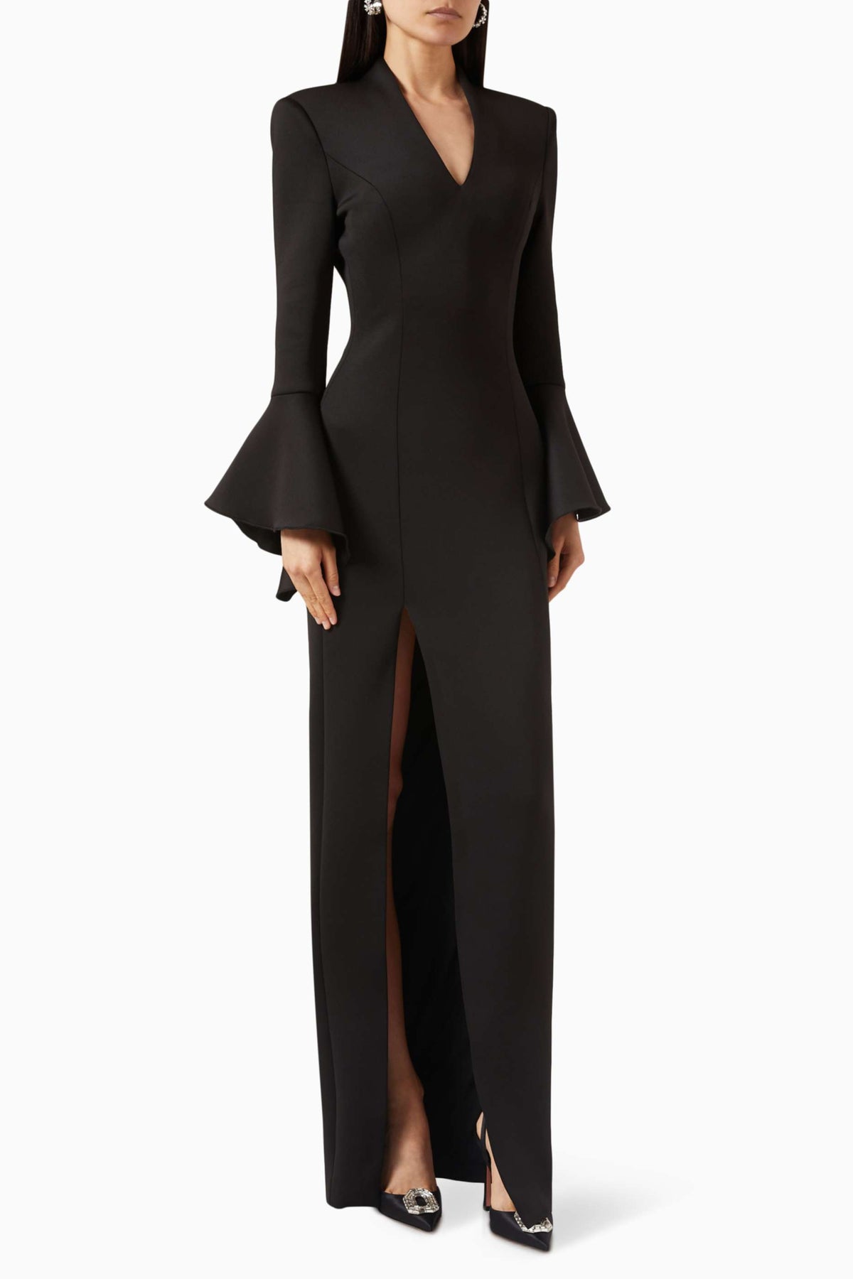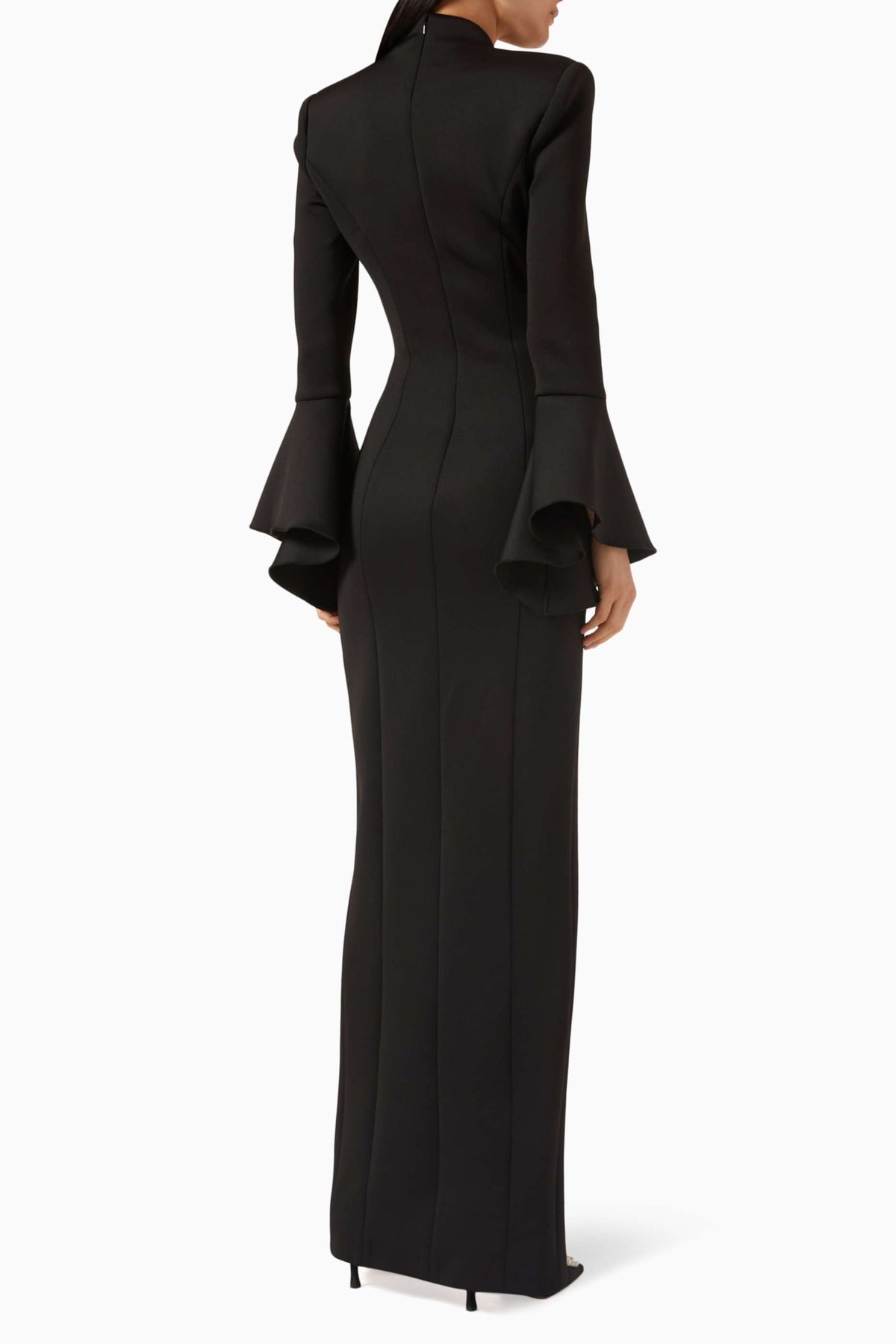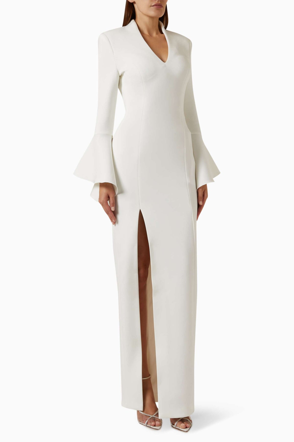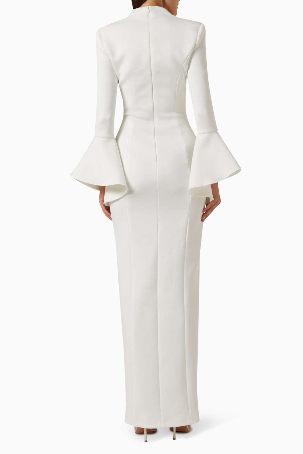 فستان أنيق بلون العاج، يتميز بأكمام طويلة مصممة بشكل هندسي مع أساور واسعة تضفي لمسة راقية ومنحوتة. يتميز الفستان بتصميم أنيق بفتحة رقبة على شكل حرف V وقصة انسيابية ضيقة تنتهي بفتحة أمامية عالية، ليجمع بين الرقي والجاذبية العصرية. مثالي للسهرات الرسمية وحفلات الاستقبال والمناسبات الخاصة الخالدة.