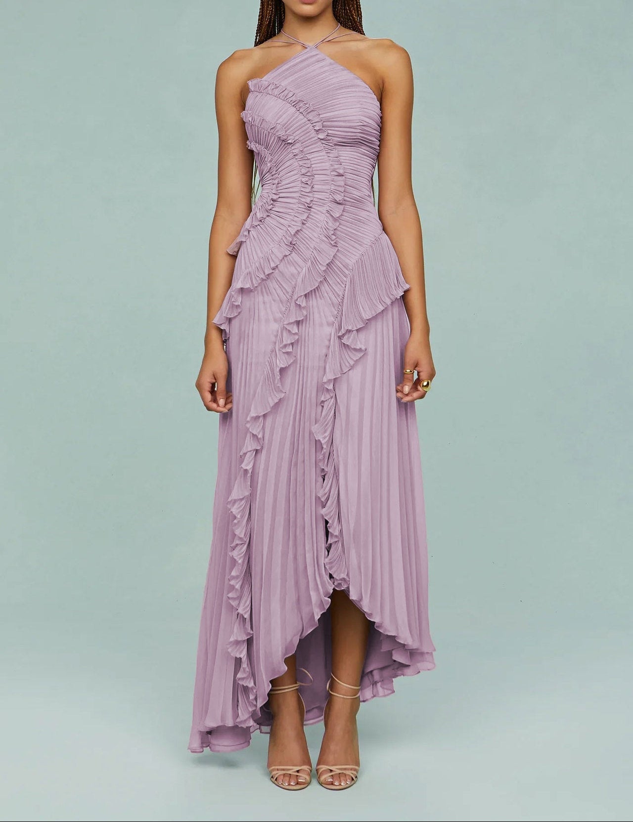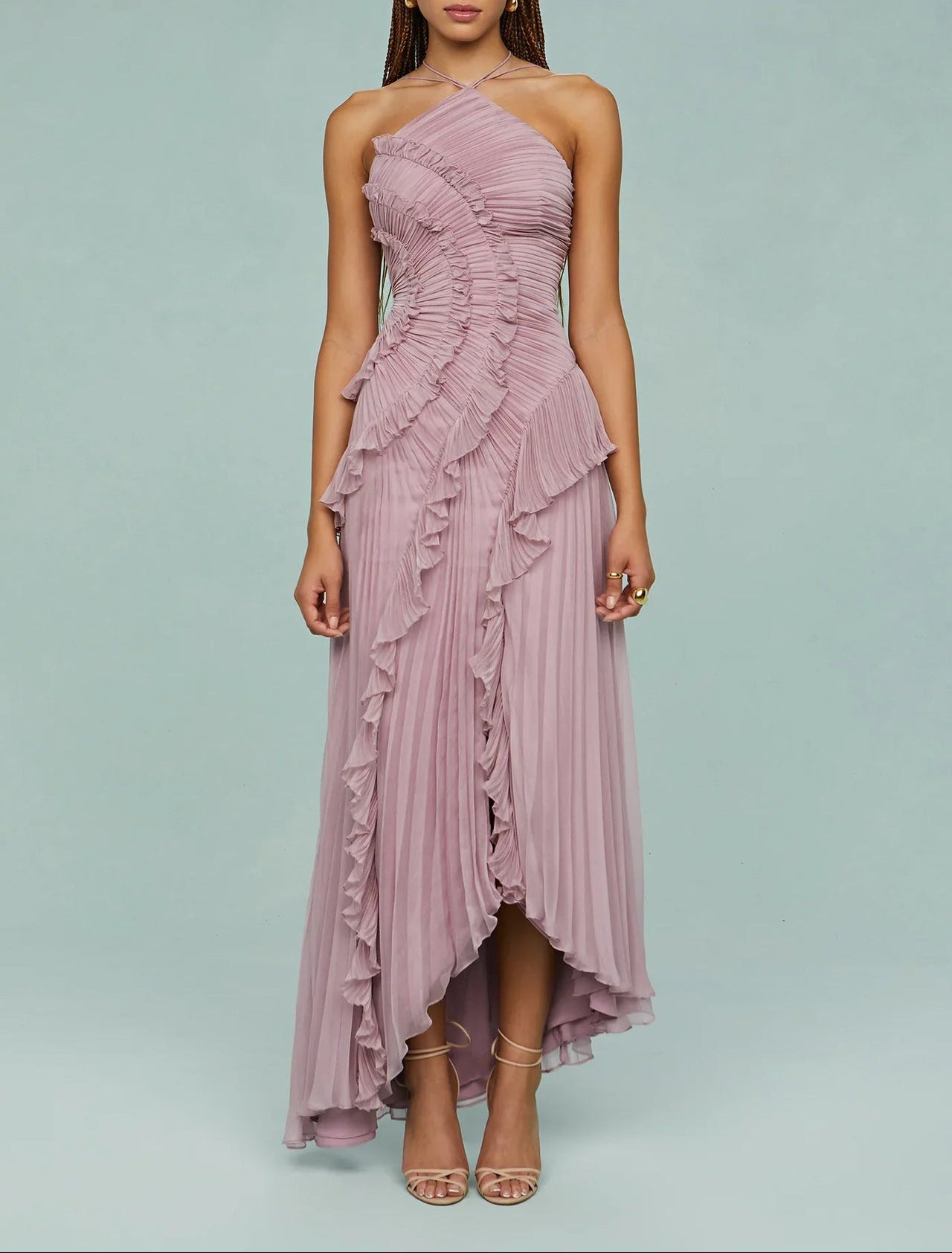 فستان أنيق متوسط الطول بتصميم هالتر، يتميز بكسرات ناعمة، وتفاصيل كشكشة متدفقة، وحافة غير متماثلة. مصمم ليمنحكِ أناقةً وانسيابيةً في أي مناسبة.