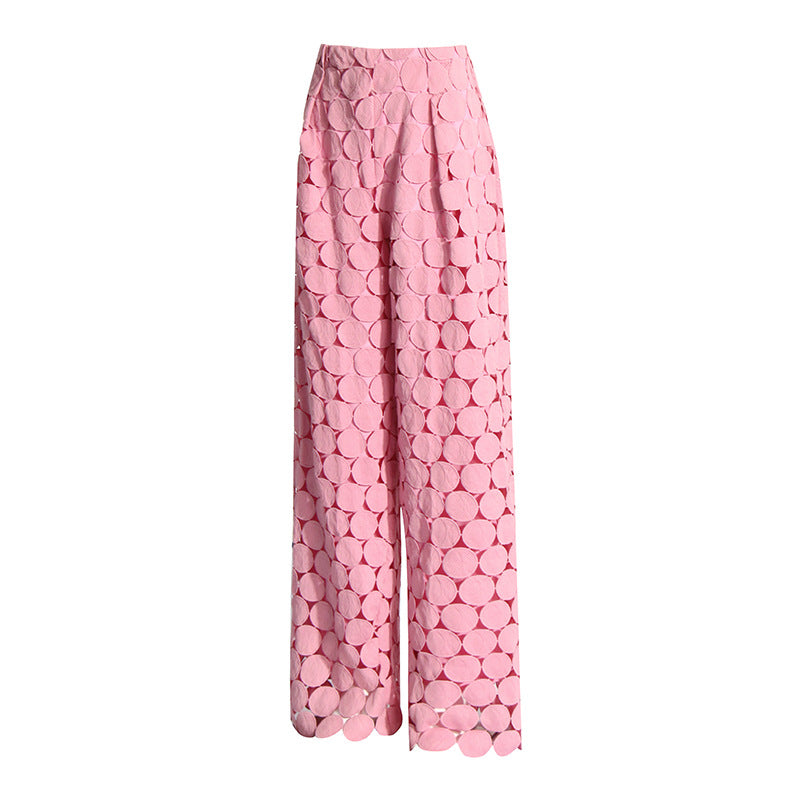 بنطلون فني عالي الخصر بقصة واسعة وتطريزات دائرية متعددة الطبقات بلون أزرق بنفسجي ناعم، يضفي لمسةً من الأناقة والحيوية على إطلالتك العصرية.