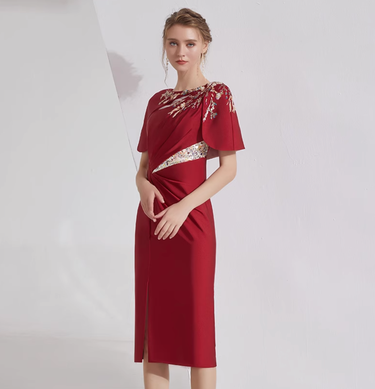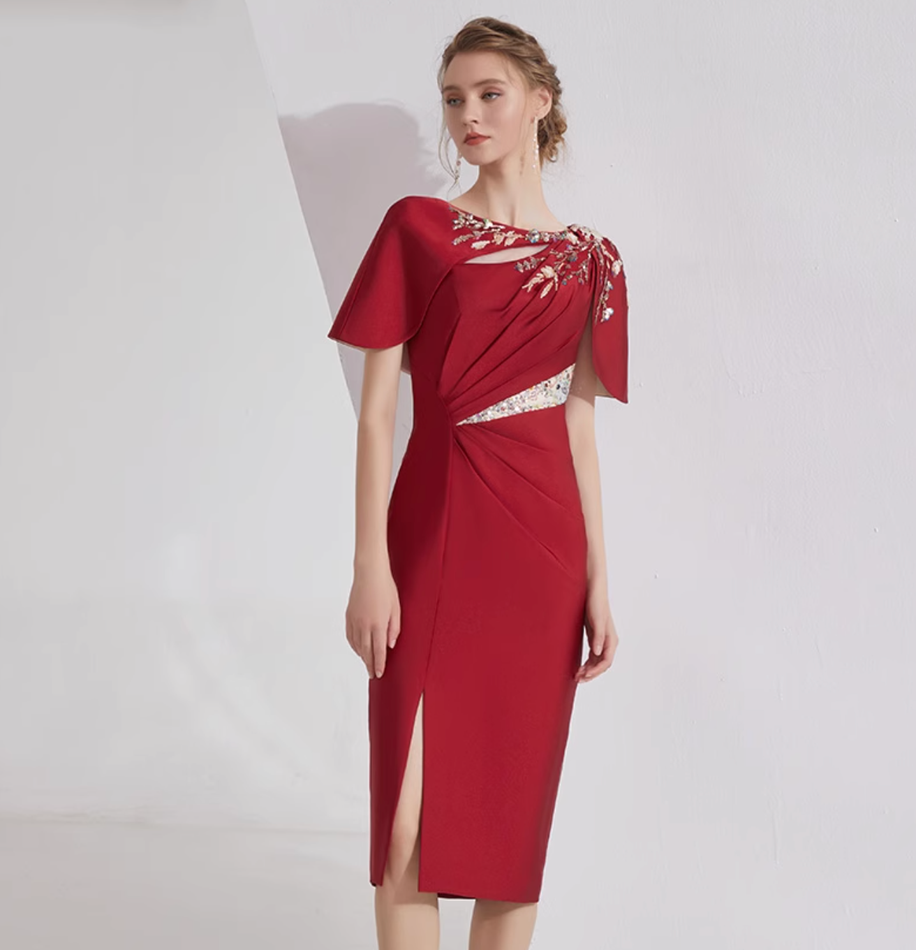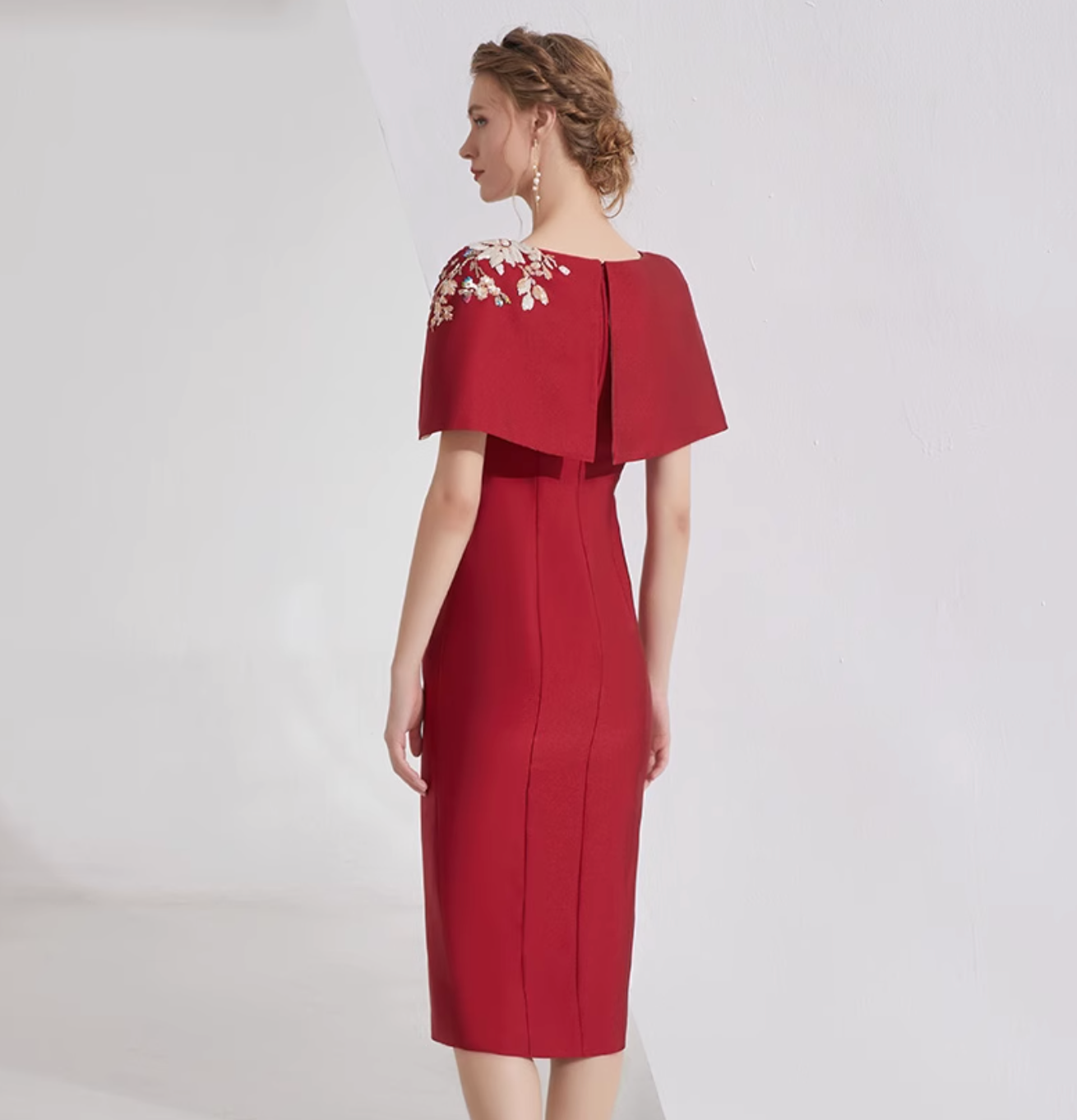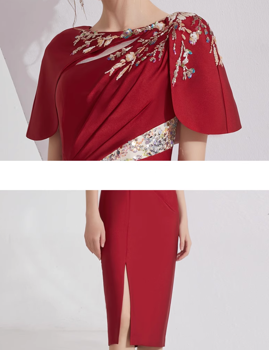 فستان أنيق بلون قرمزي، بأكمام على شكل كاب، وتطريز زهور لامع بالترتر على الكتفين، وفتحة جانبية أنيقة. مزين بلوحة قطرية من الترتر البراق لإطلالة مسائية راقية.