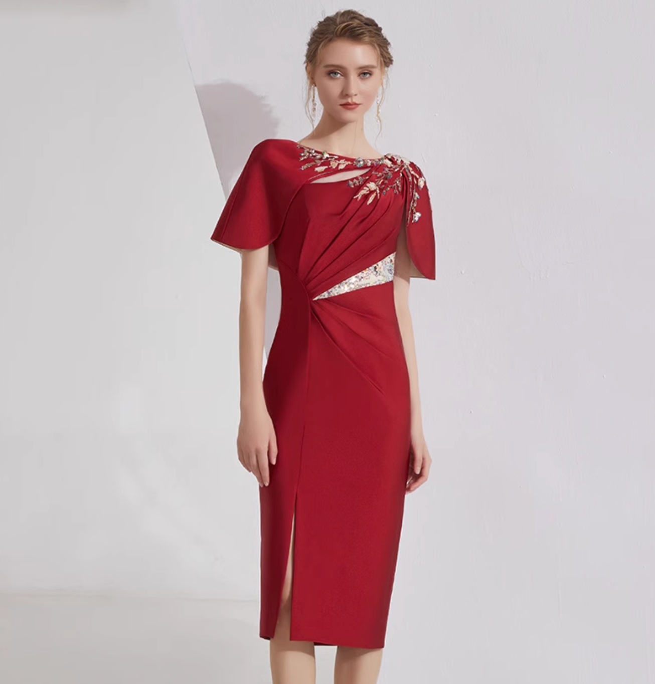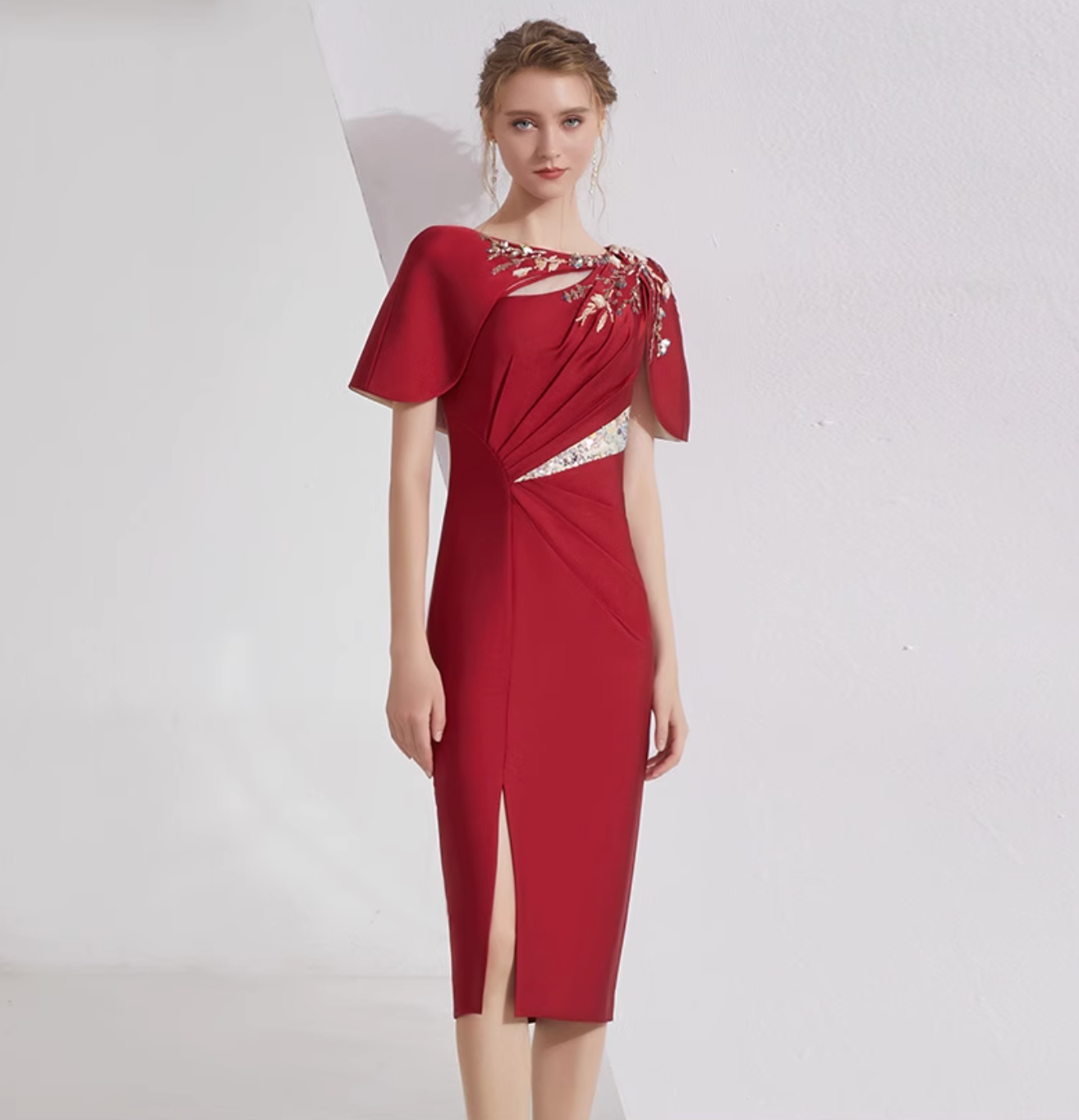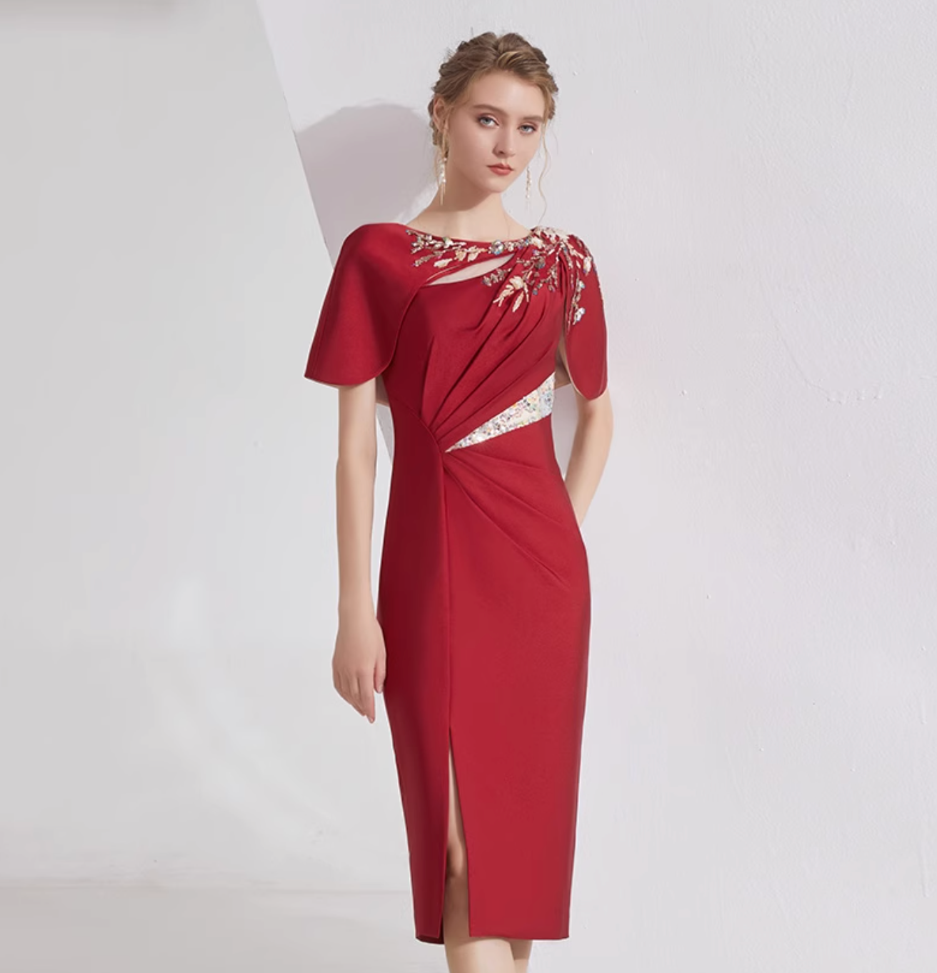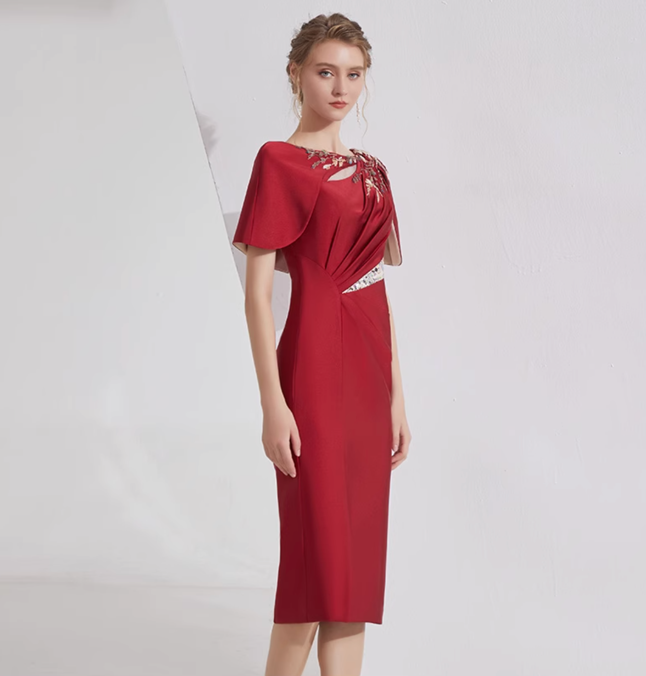 فستان أنيق بلون قرمزي، بأكمام على شكل كاب، وتطريز زهور لامع بالترتر على الكتفين، وفتحة جانبية أنيقة. مزين بلوحة قطرية من الترتر البراق لإطلالة مسائية راقية.