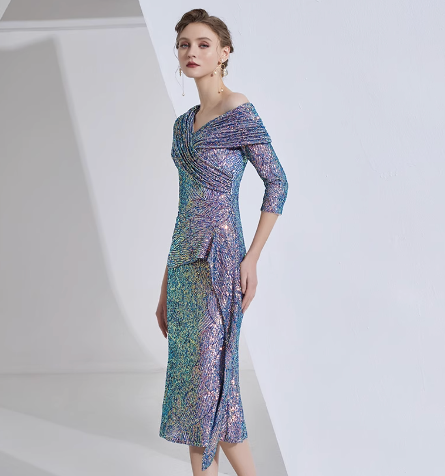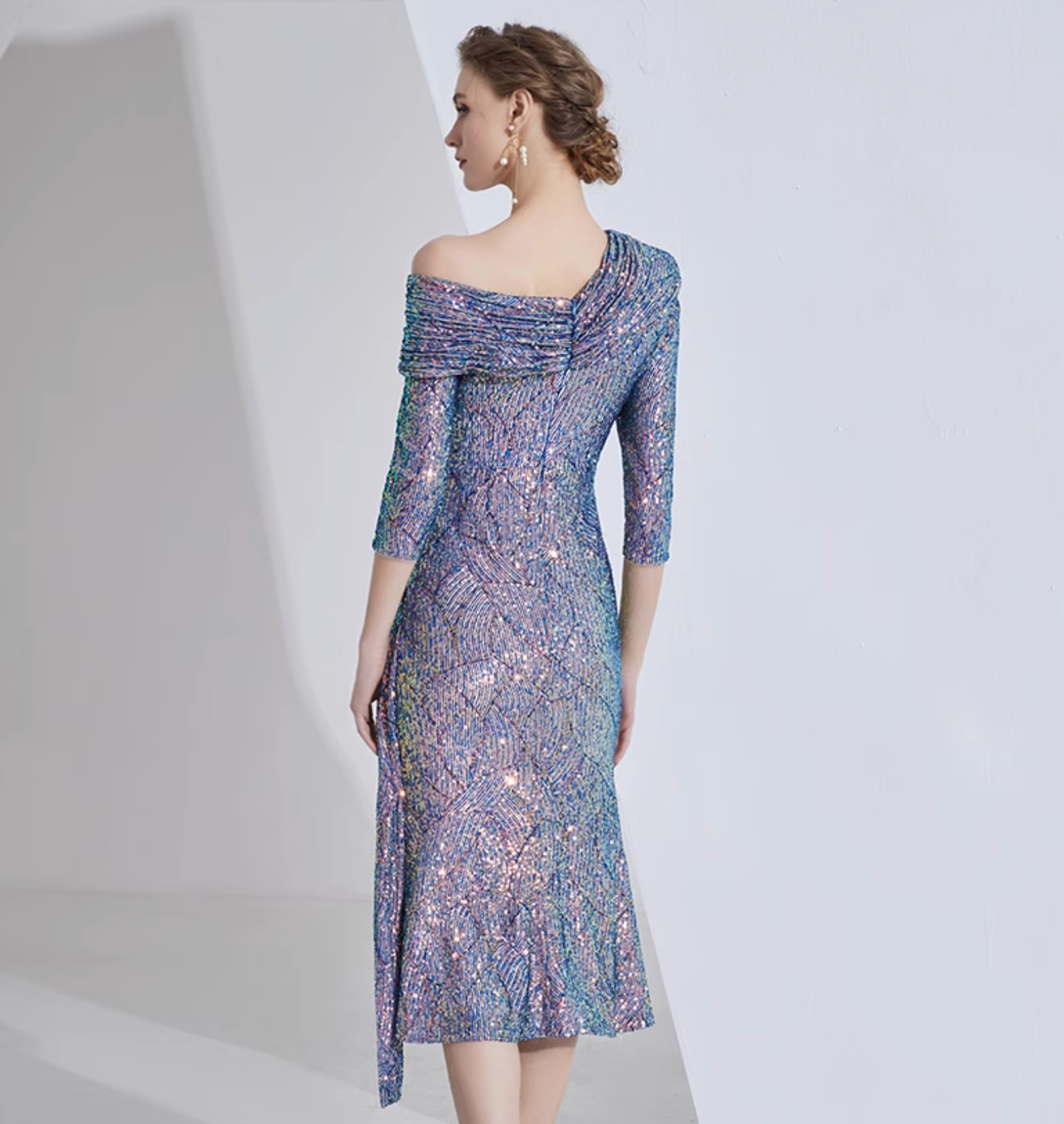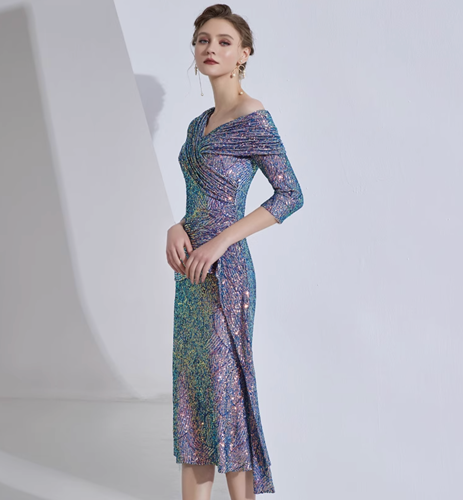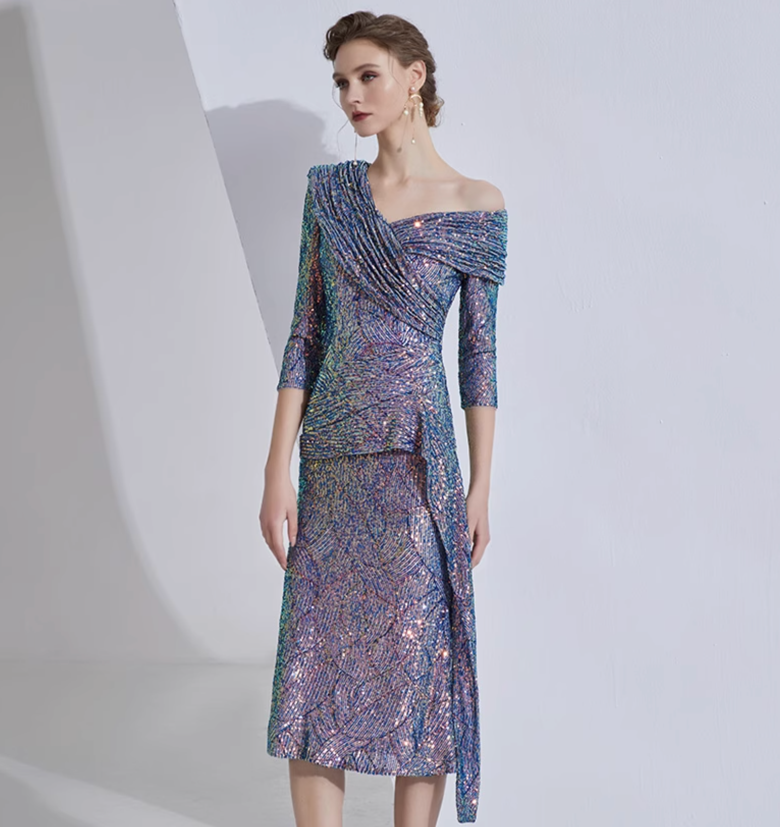 فستان ميدي أنيق مكشوف الأكتاف، متألق بترتر متعدد الألوان، يتميز بصدرية ناعمة، وأكمام بطول ثلاثة أرباع، وحاشية غير متماثلة. مثالي لإطلالة ساحرة في أمسياتكِ.