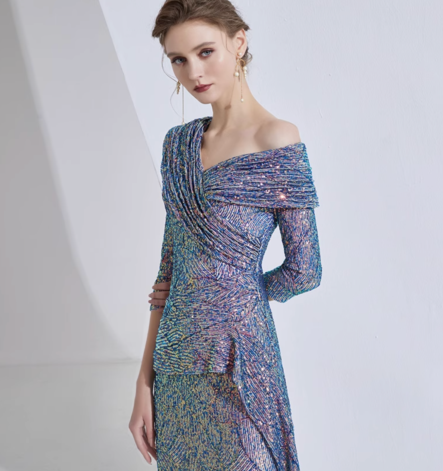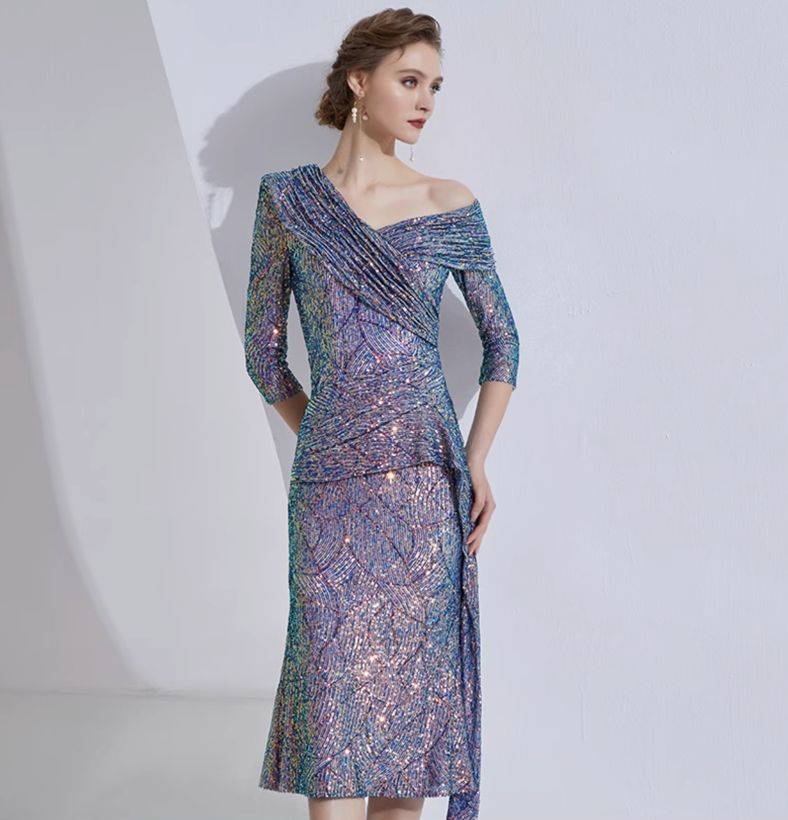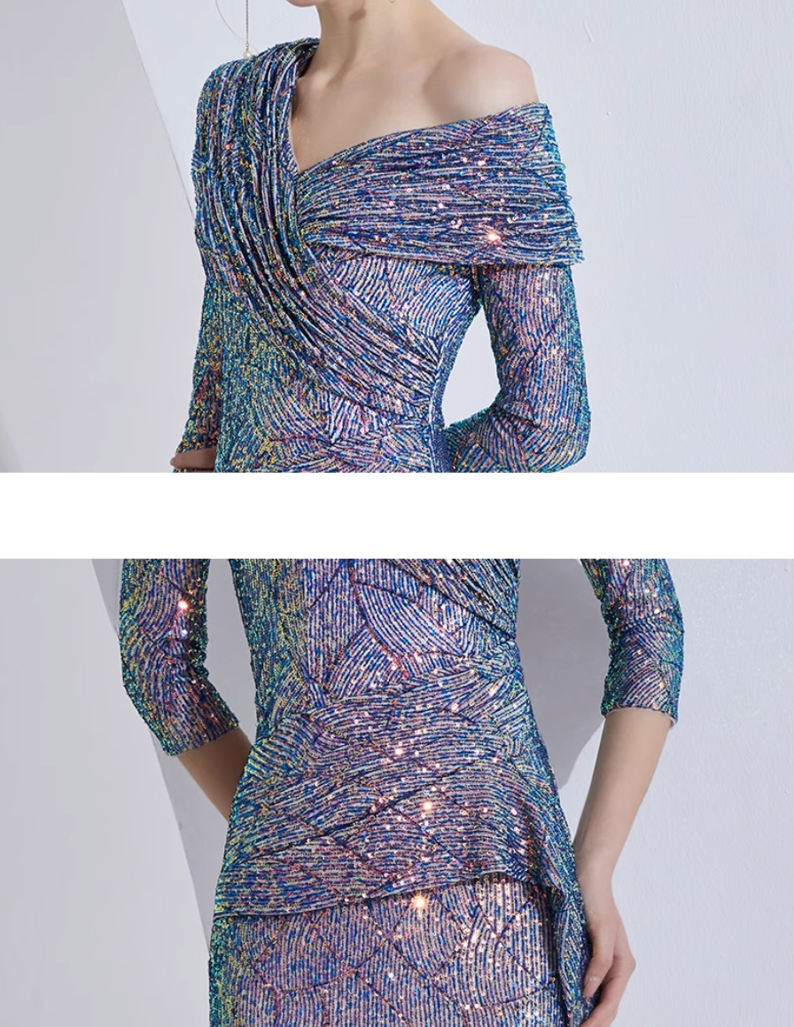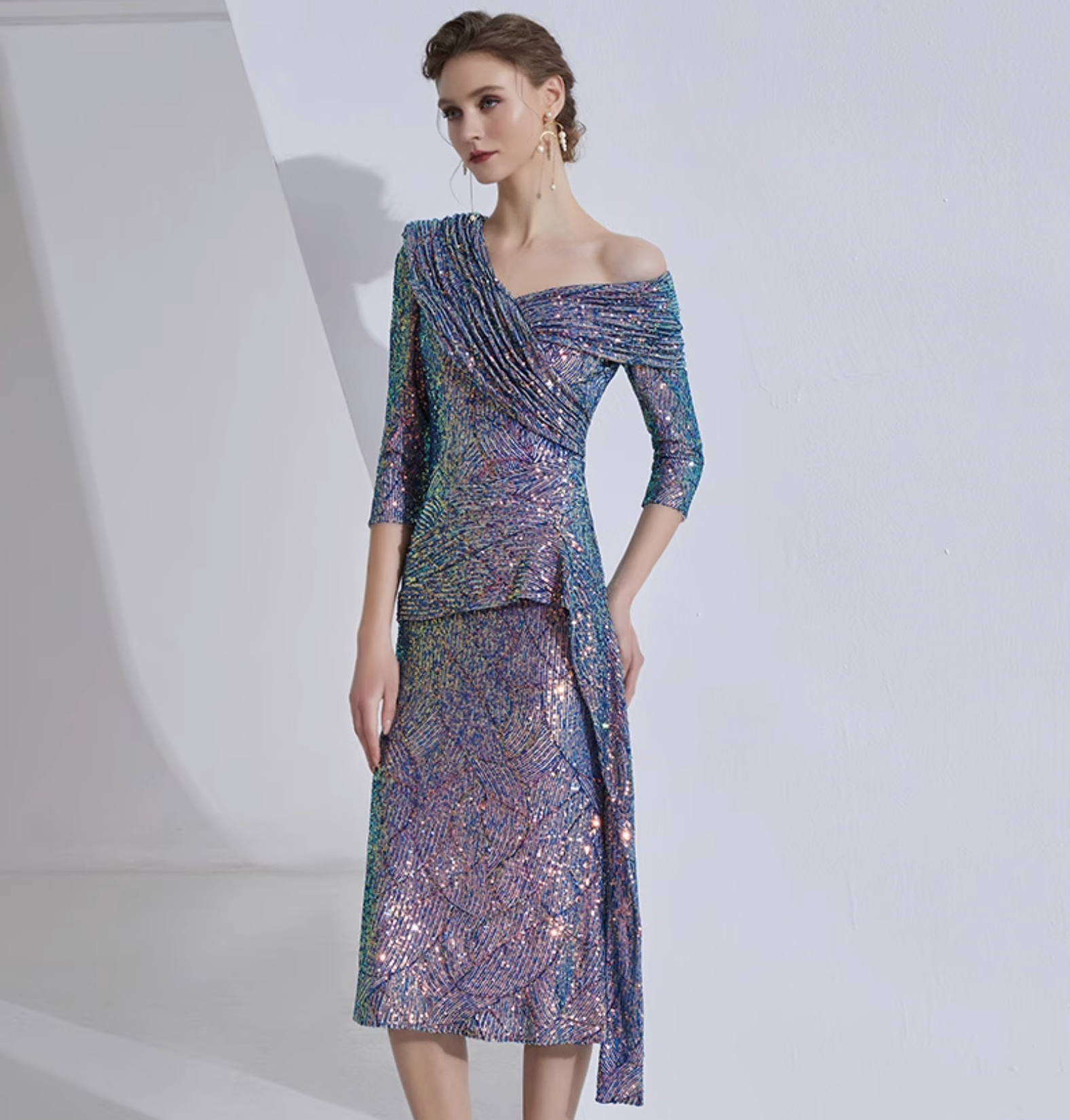 فستان ميدي أنيق مكشوف الأكتاف، متألق بترتر متعدد الألوان، يتميز بصدرية ناعمة، وأكمام بطول ثلاثة أرباع، وحاشية غير متماثلة. مثالي لإطلالة ساحرة في أمسياتكِ.