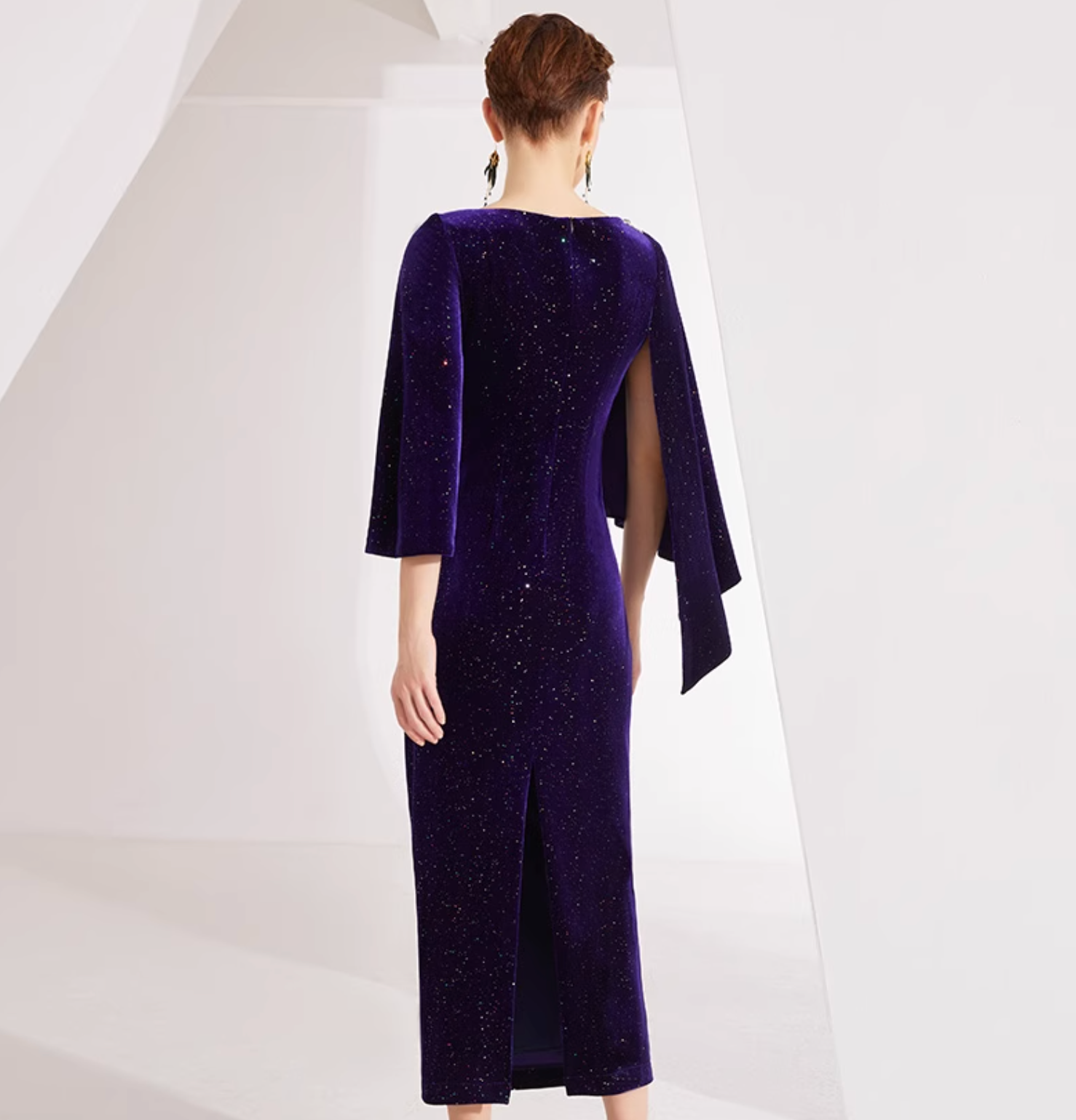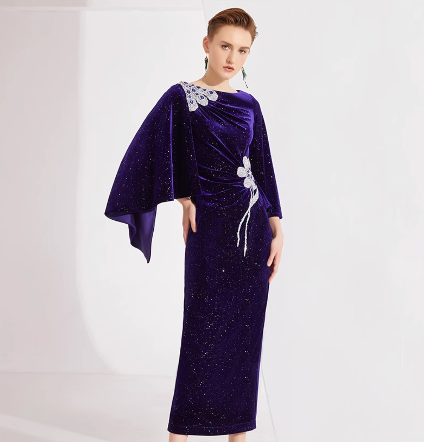 فستان مخملي بأكمام على شكل كاب مع تطريز زهور كريستالية – منتصف الليل