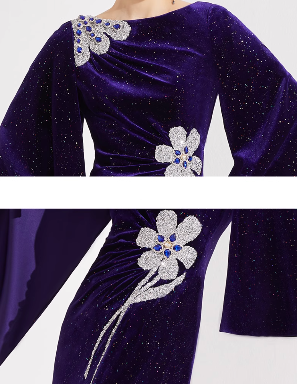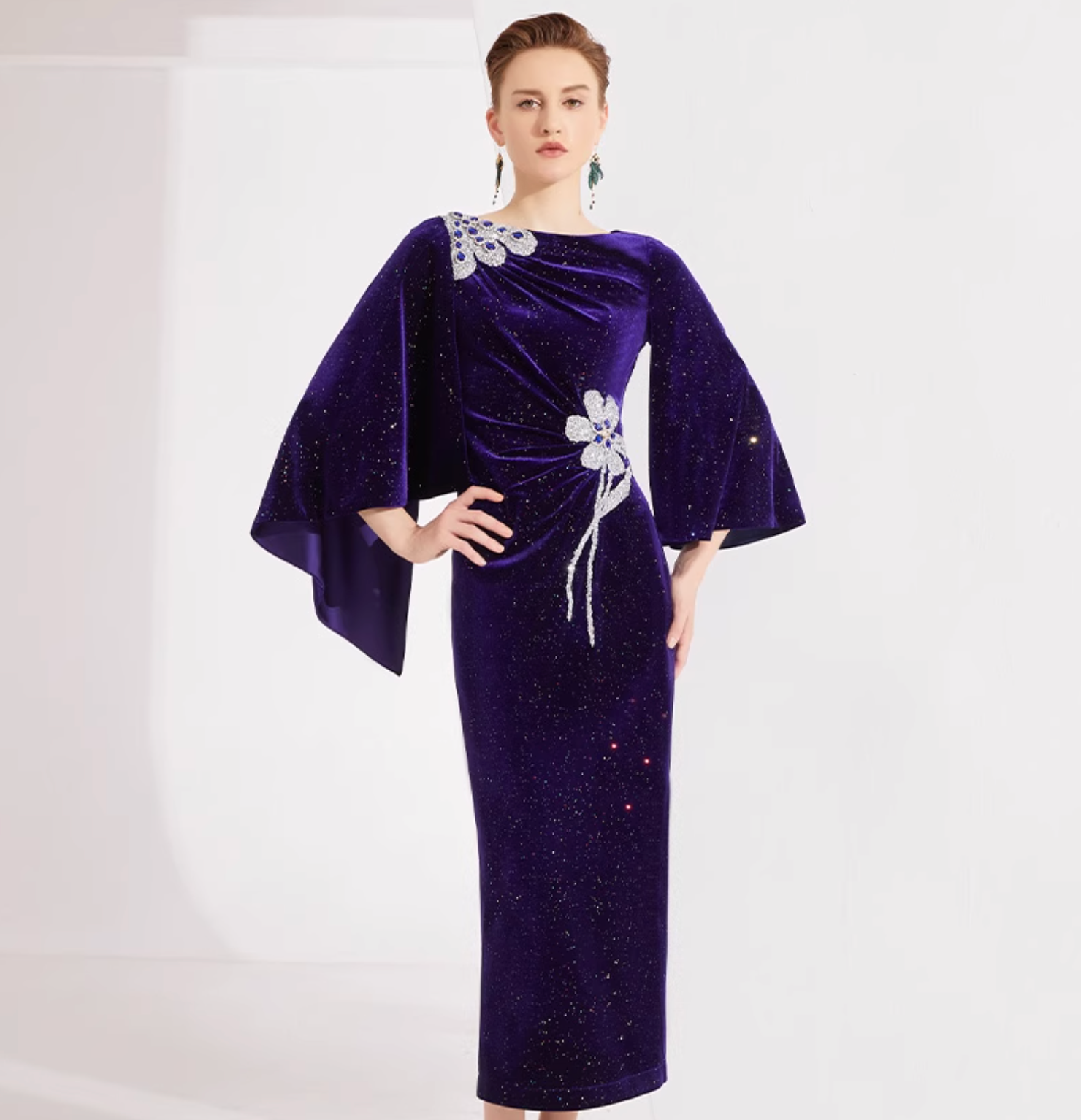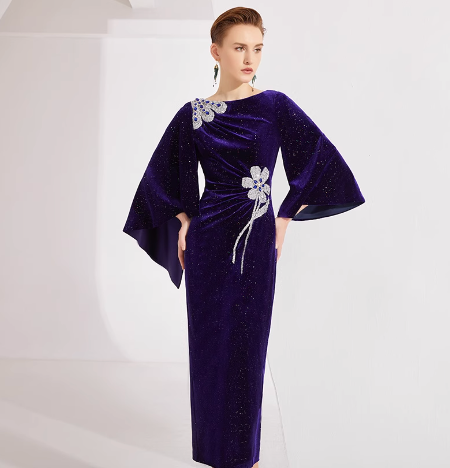 فستان مخملي فاخر بلون بنفسجي غامق، مزين بتطريزات زهور كريستالية لامعة، بأكمام أنيقة على شكل كاب وخصر أنيق. تصميم طويل يصل إلى الأرض ببريق ناعم، مثالي للسهرات الفخمة.