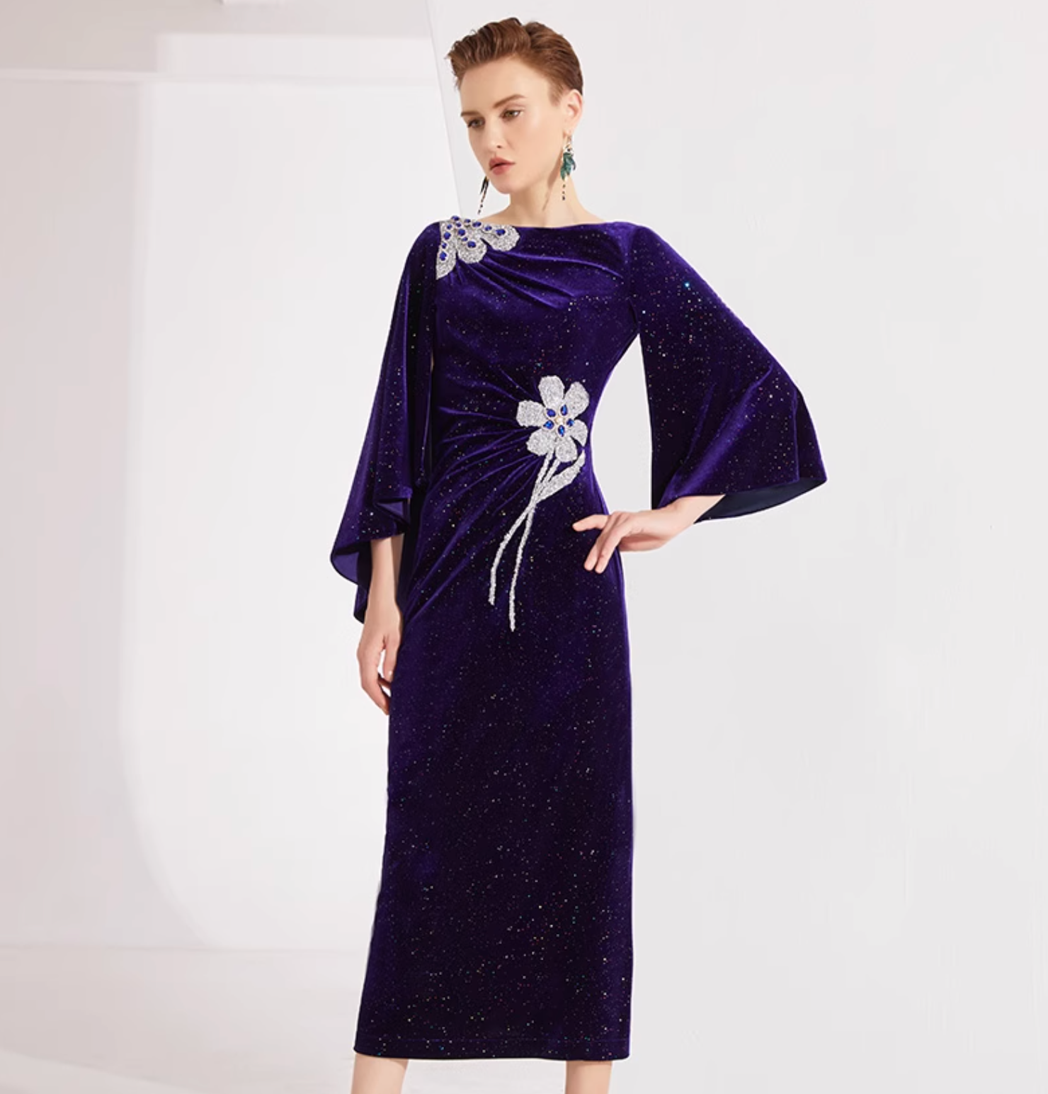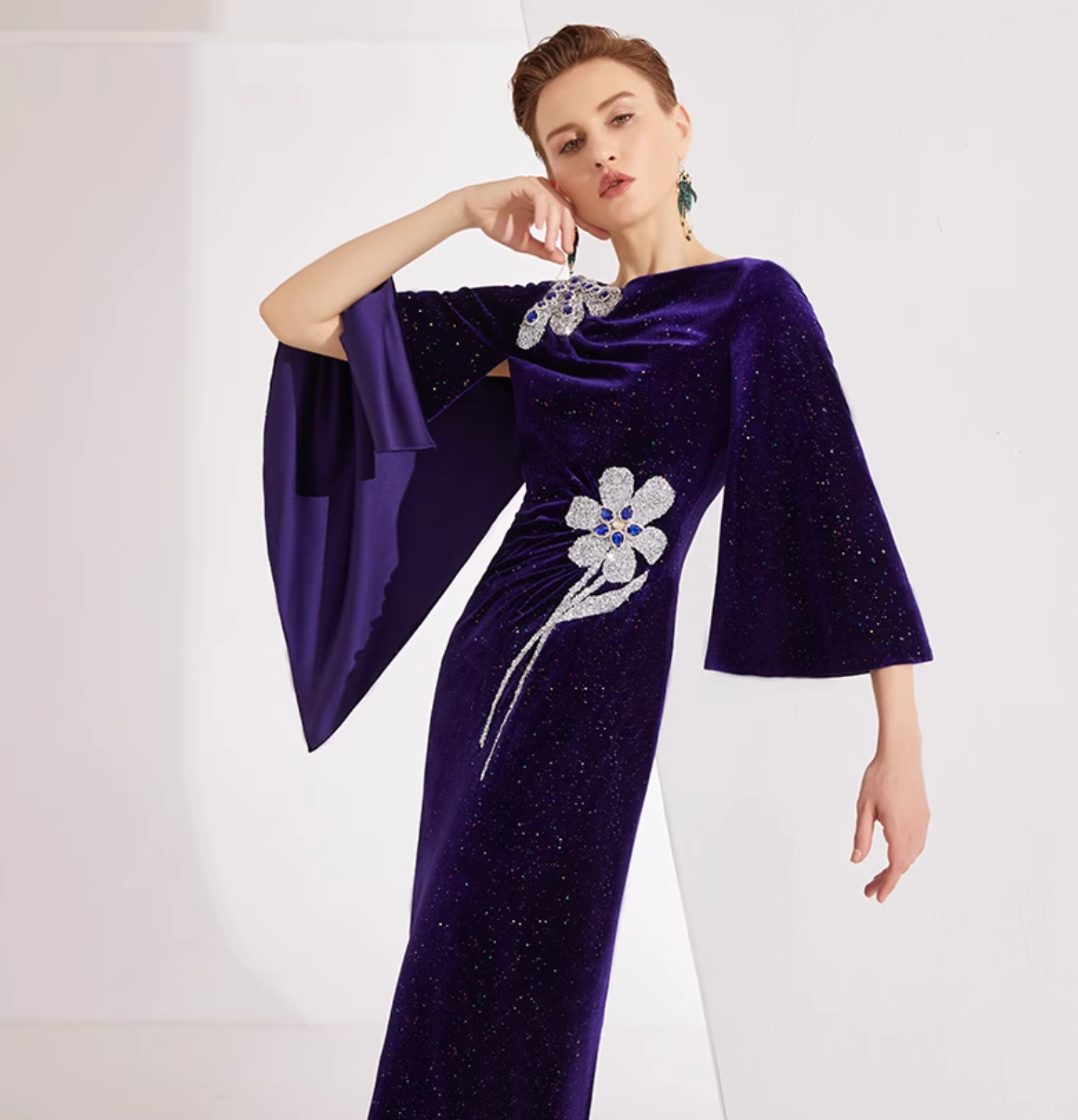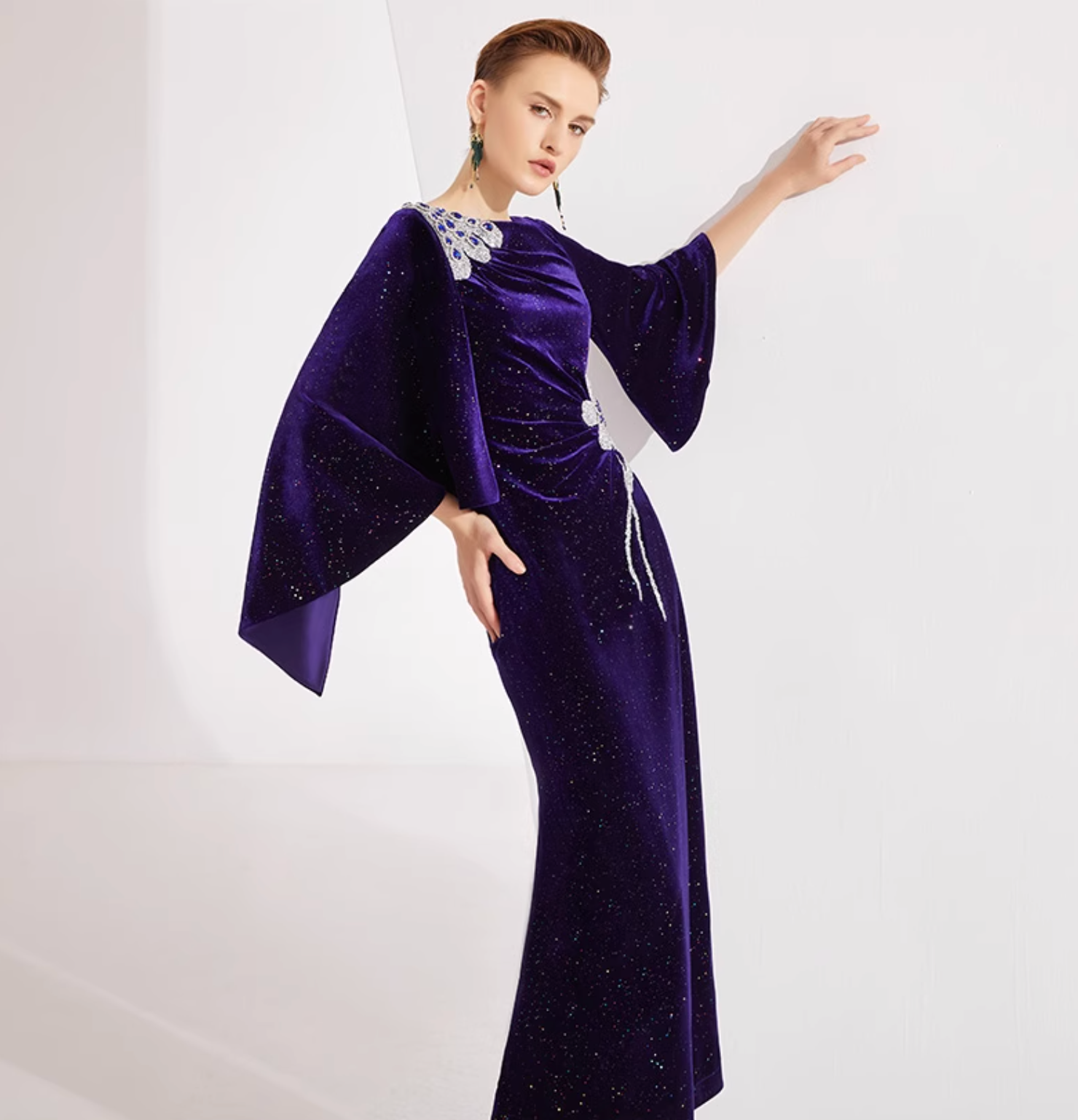 فستان مخملي فاخر بلون بنفسجي غامق، مزين بتطريزات زهور كريستالية لامعة، بأكمام أنيقة على شكل كاب وخصر أنيق. تصميم طويل يصل إلى الأرض ببريق ناعم، مثالي للسهرات الفخمة.
