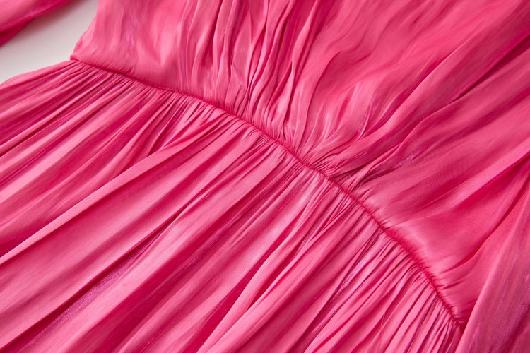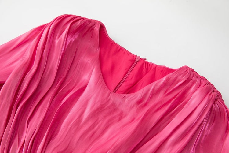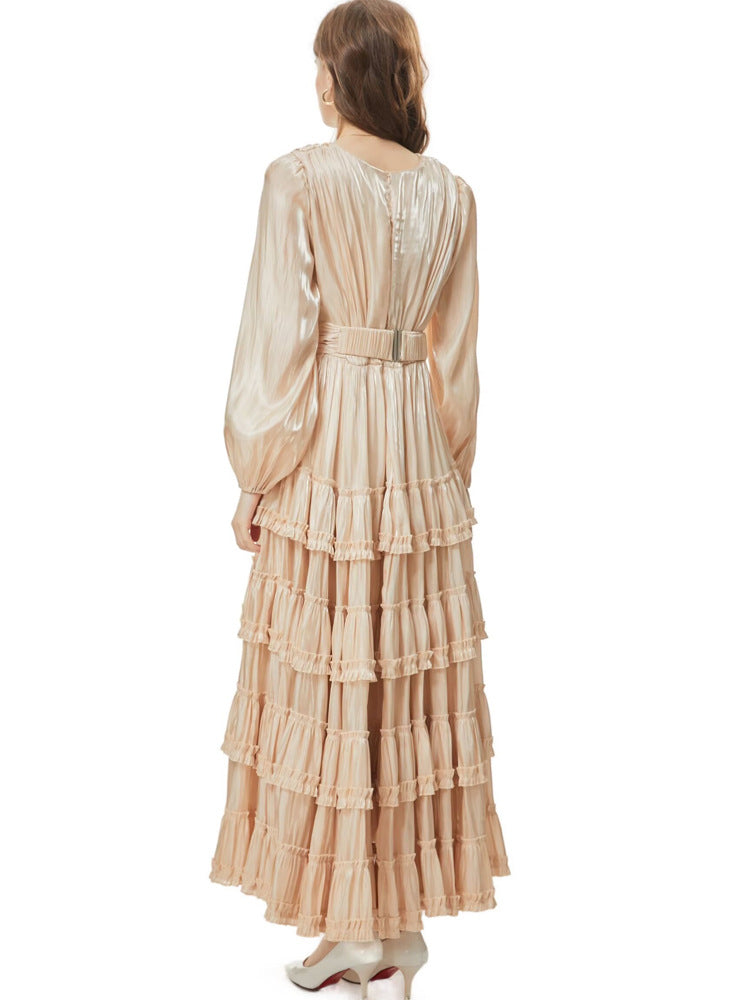صُمم هذا الفستان الطويل المطوي ليُضفي لمسةً من الأناقة والجرأة، ويتميز بطبقة نهائية شفافة وحاشية متعددة الطبقات ومُكشكشة. تصميمه الانسيابي وقماشه الخفيف يسمحان بحركة أنيقة، مما يجعله خيارًا مثاليًا.