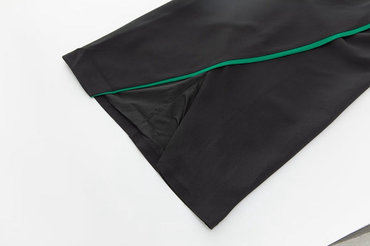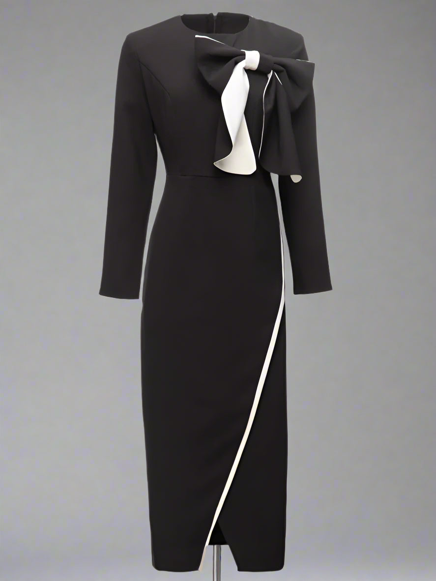 تألقي بهذا الفستان الضيق بأكمام طويلة وحاشية غير متماثلة وعقدة جريئة كبيرة الحجم ومتباينة الألوان عند خط العنق. مثالي لإطلالة أنيقة وساحرة.