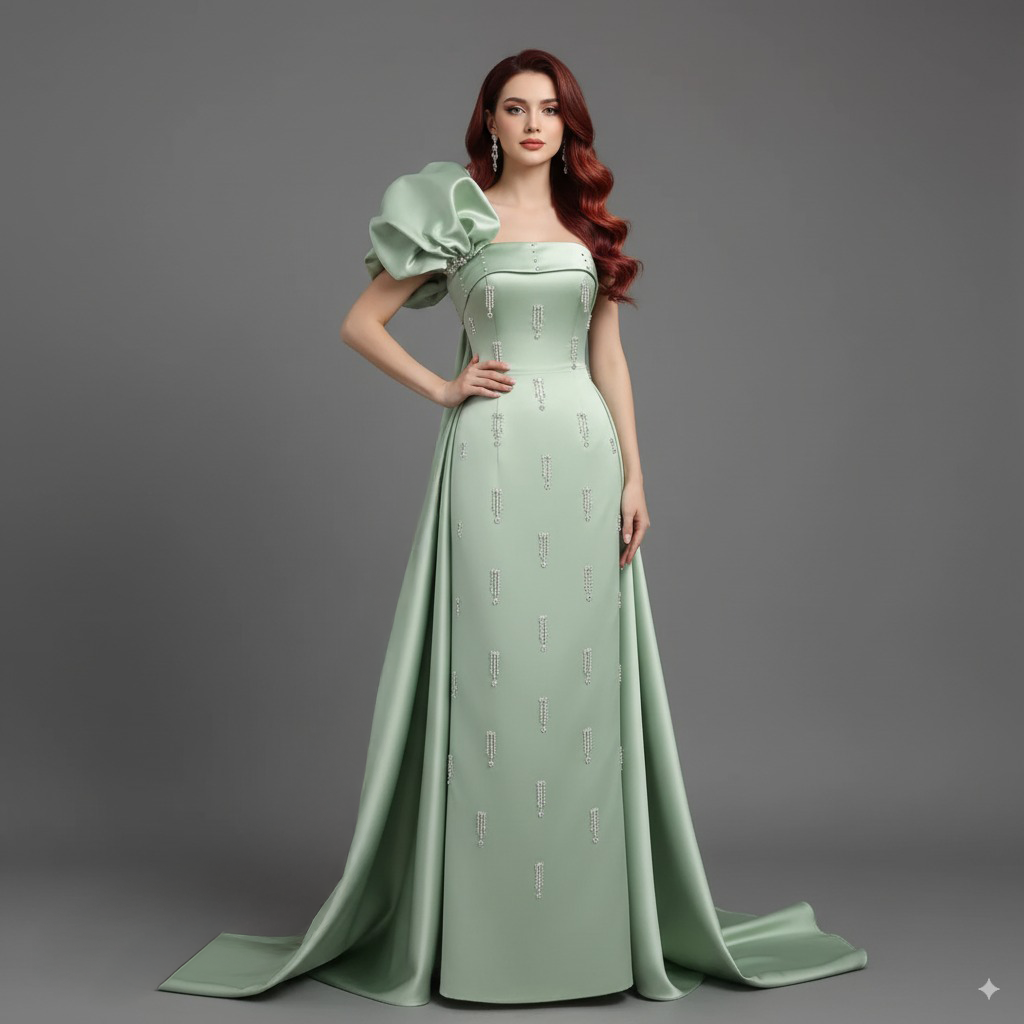 فستان ساتان أنيق بلون أخضر فاتح، يتميز بفتحة رقبة مكشوفة الكتف، مزين بفيونكة كبيرة الحجم، وتطريزات خرزية رقيقة، وذيل أنيق يصل إلى الأرض.