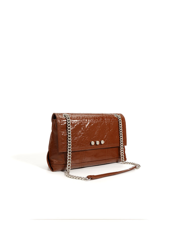 حقيبة الكتف الأنيقة هذه مصنوعة من جلد مجعد لامع، وتتميز بغطاء مبطن، وحزامين مزدوجين للسلسلة مع واقي كتف من الجلد، وتفاصيل برشام معدنية مميزة لإطلالة متطورة وجريئة.