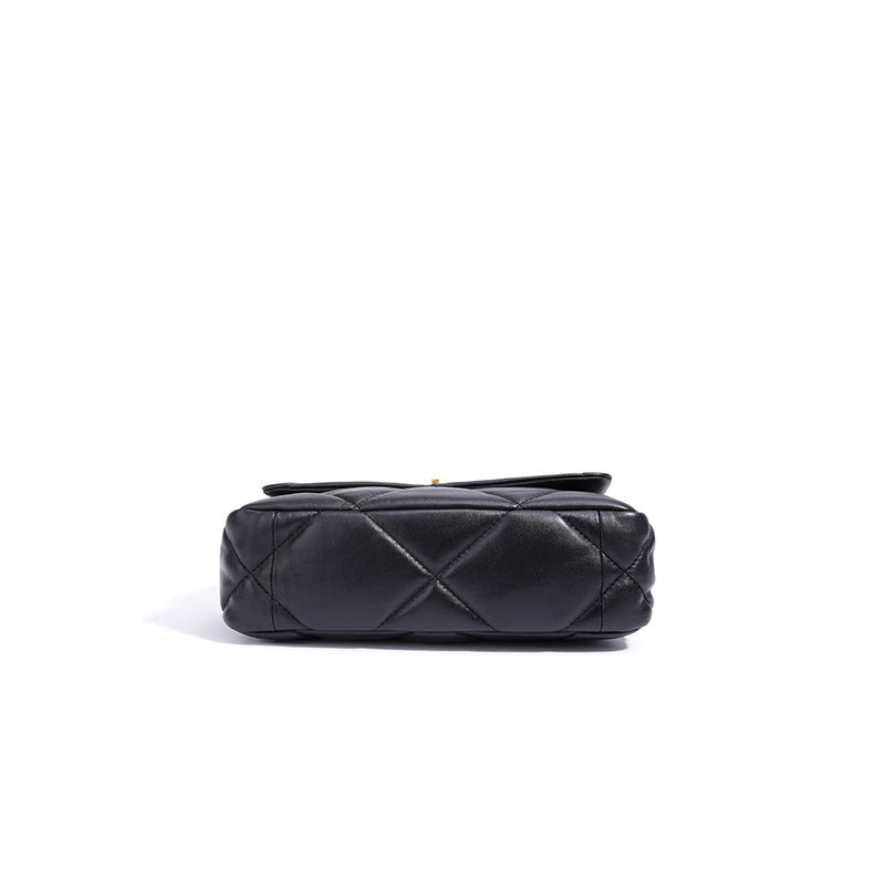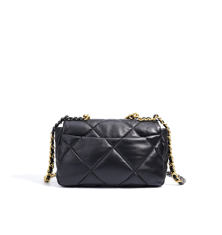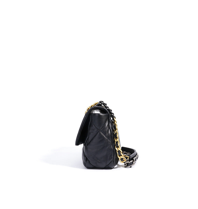 حقيبة كتف أنيقة من الجلد الأسود مع نسيج مبطن فاخر وقفل دوار باللون الذهبي وحزام سلسلة ثنائي اللون - مثالية لرفع مستوى أي مظهر من النهار إلى الليل.