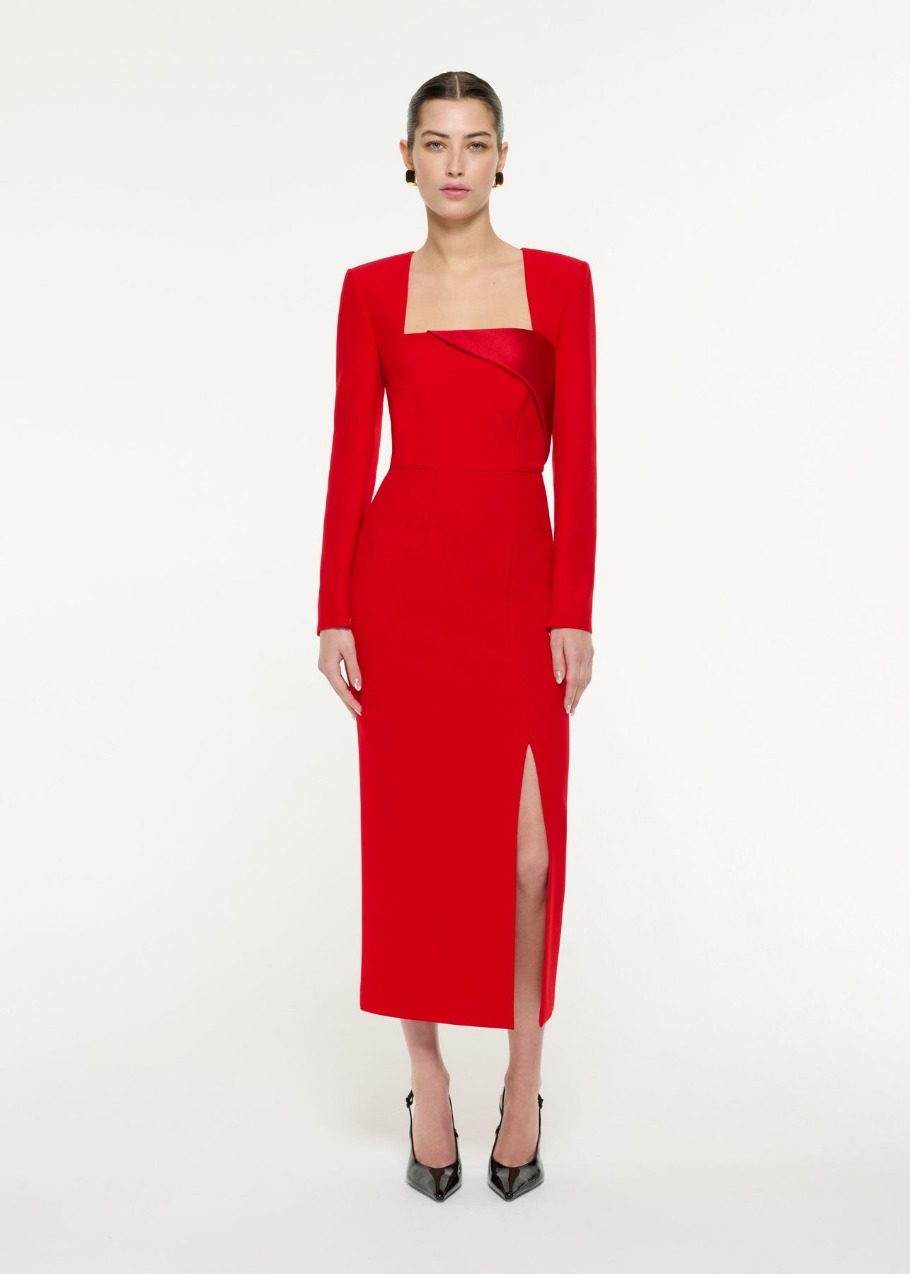 فستان أحمر أنيق متوسط الطول، يتميز بياقة مربعة أنيقة مزينة بطية منحوتة، وأكمام طويلة ضيقة، وشق أمامي حاد. تصميم عصري وأنيق، مثالي لأمسيات راقية.